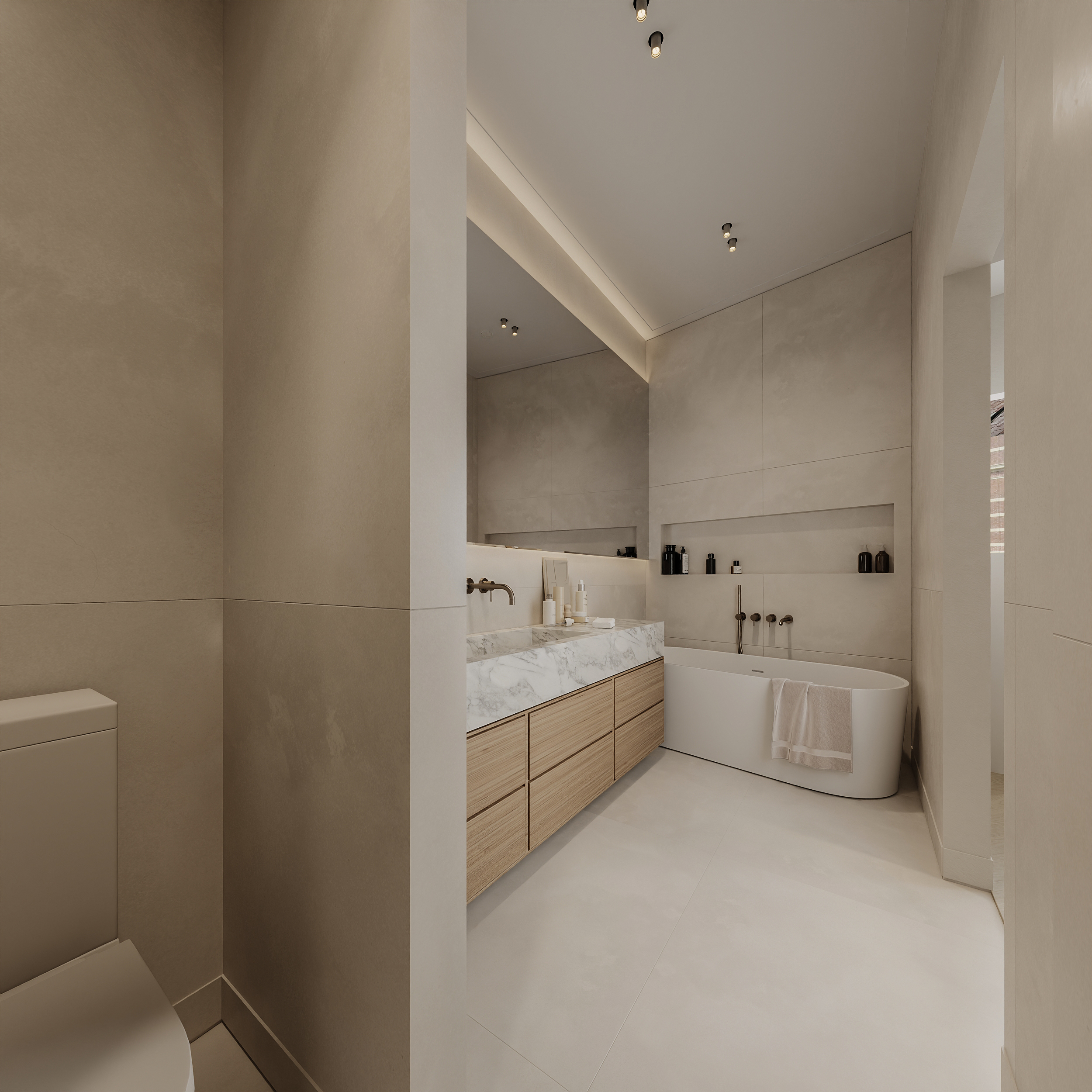 Le niveau inférieur accueille trois chambres et deux salles de bains, toutes deux dotées de douches à l’italienne et de doubles vasques, l’une disposant également d’une baignoire. La lumière naturelle abonde et le rangement a été pensé avec soin dans chaque espace. Les étages supérieurs offrent une autonomie appréciable, avec une salle de bains et une chambre supplémentaires dans la partie arrière de la propriété.