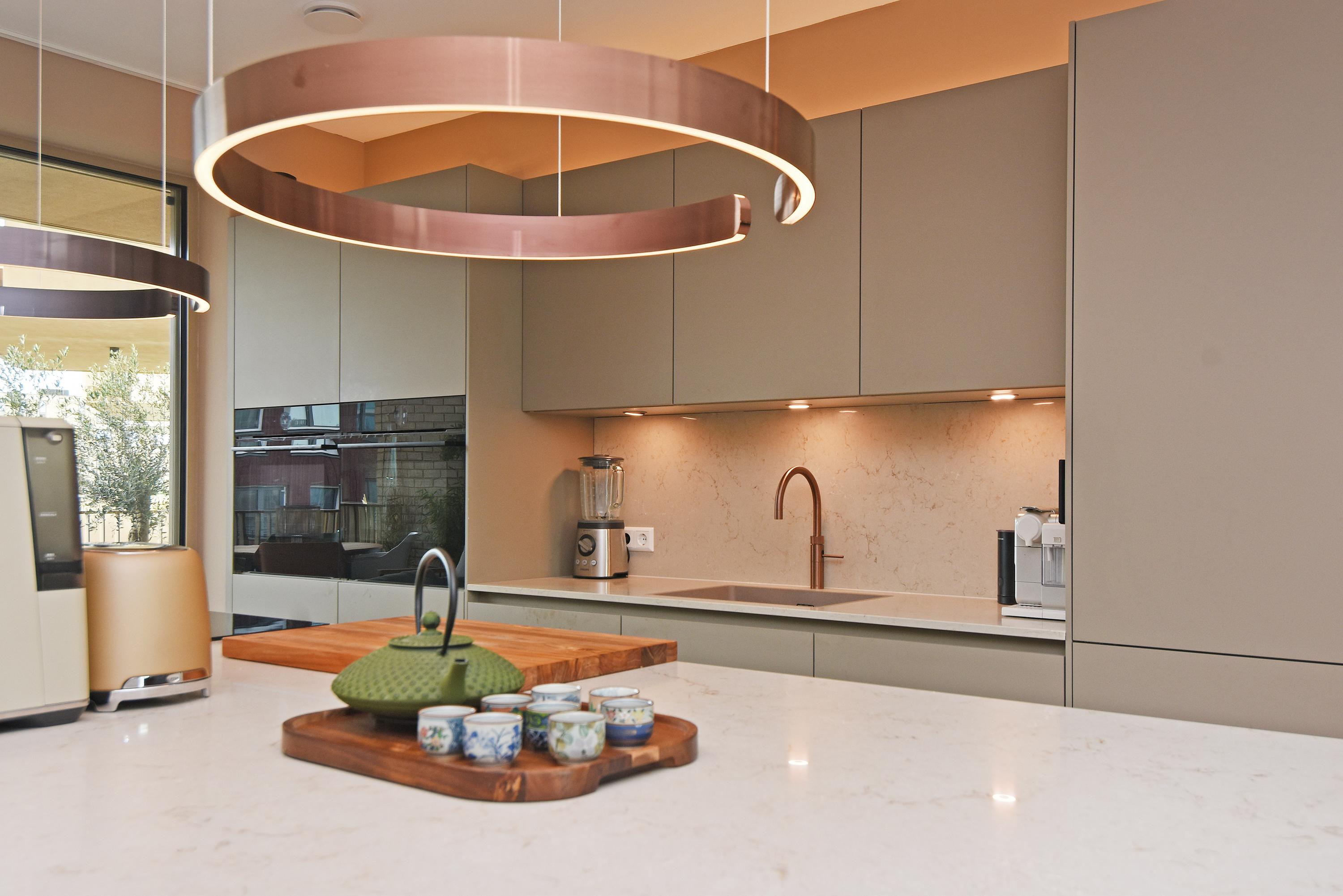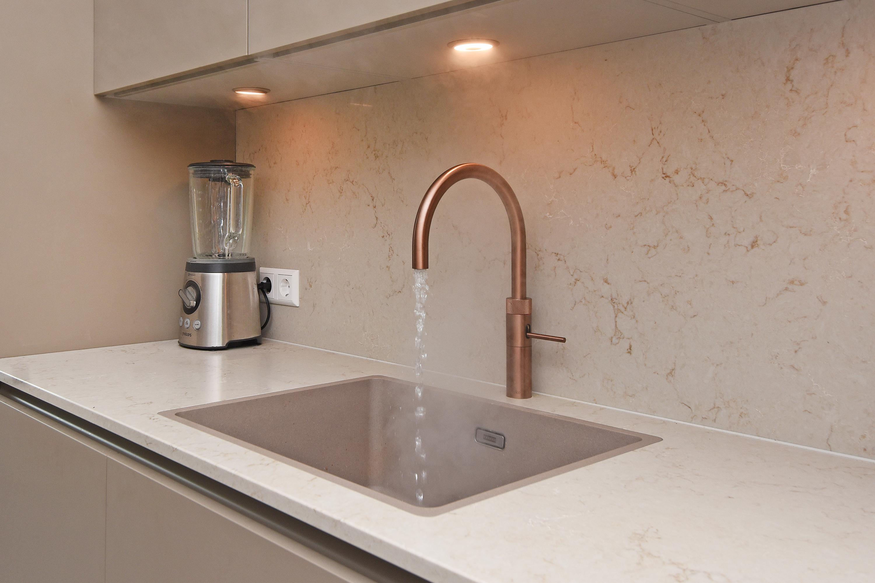Aan de voorzijde bevindt zich het zitgedeelte met een stijlvolle, op maat gemaakte kastenwand met afsluitbare werkplek. Aan de achterzijde ligt de designkeuken met kookeiland en alle denkbare luxe inbouwapparatuur, waaronder een inductiekookplaat met geïntegreerde afzuiging, Quooker, vaatwasser, combi-oven, ruime koelkast en aparte ruime vriezer. Vanuit de keuken opent de grote schuifpui naar het riante balkon, waar u in alle rust kunt genieten van de middag- en avondzon.