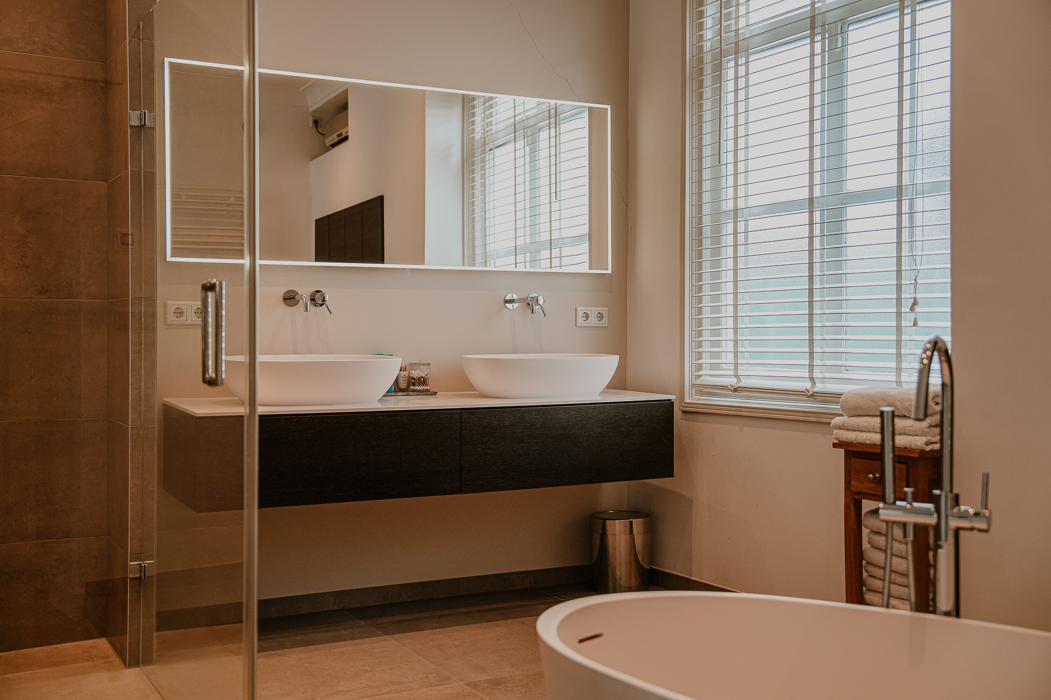 De eerste verdieping heeft desgewenst wederom een woonkamer met schouw, een grote slaapkamer met luxe badkamer en suite, een kastenkamer en een royale daktuin.