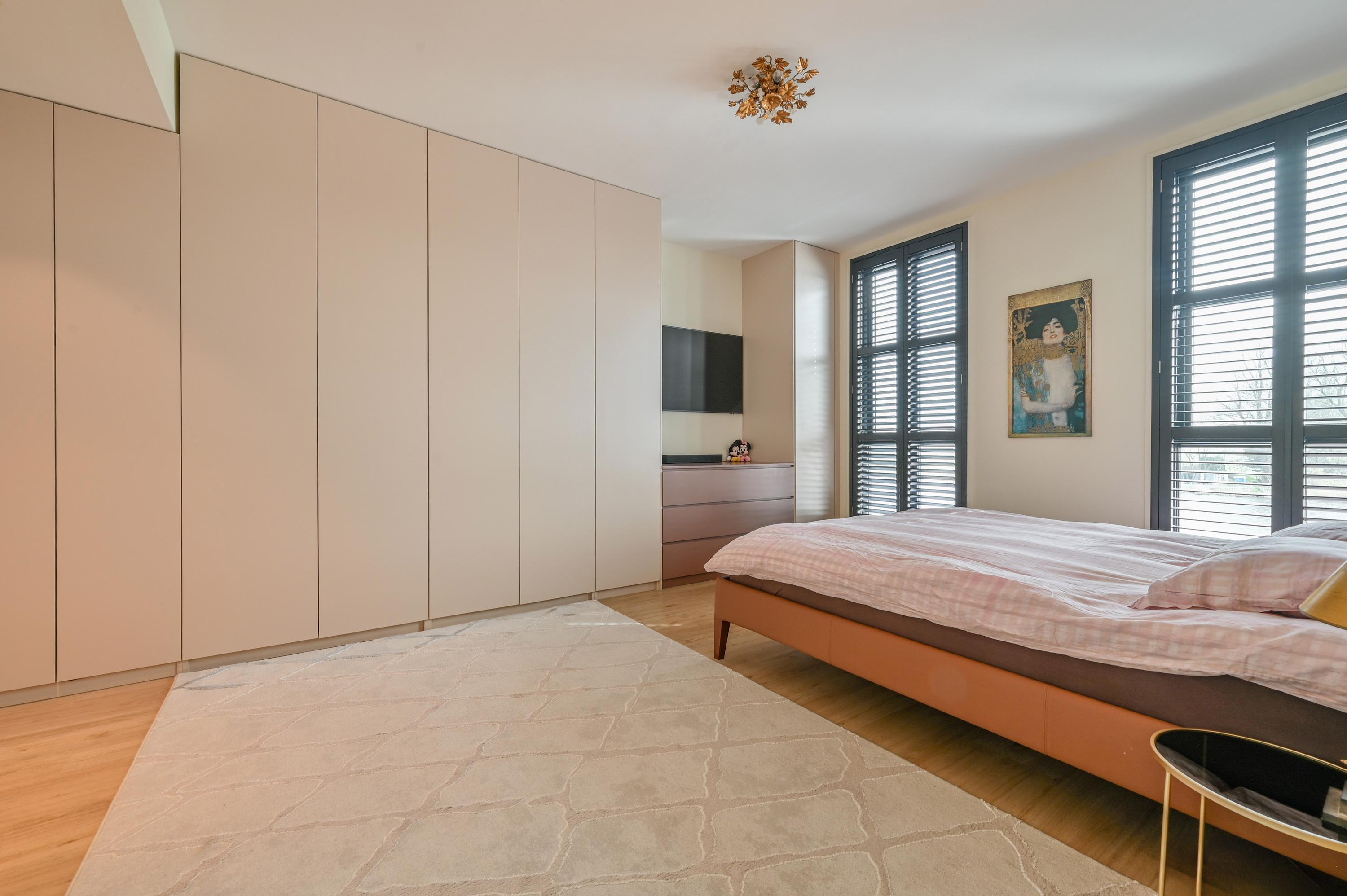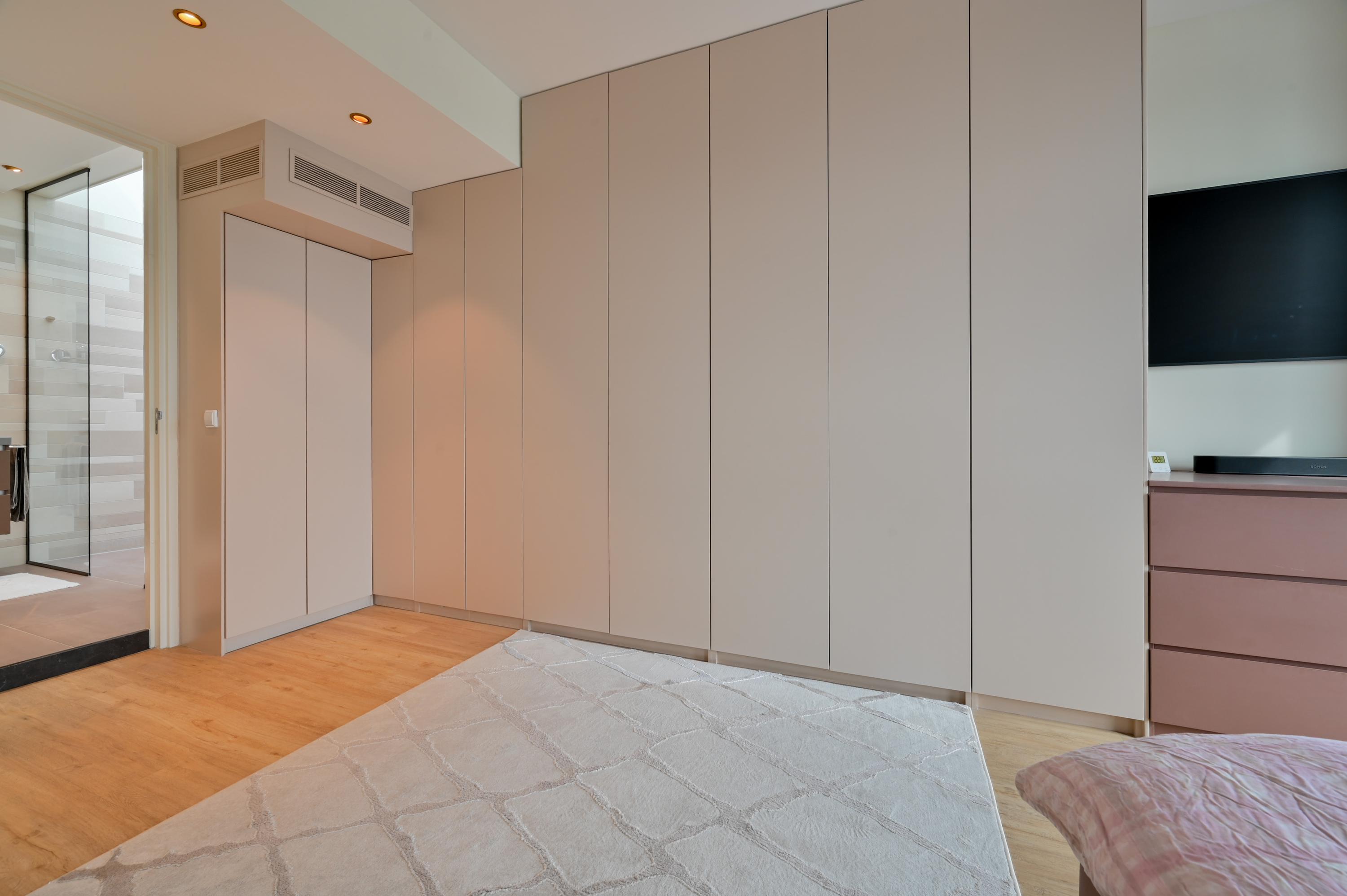Aan de voorzijde bevinden zich nog twee kamers: momenteel is één kamer in gebruik als stijlvolle kantoorruimte terwijl de andere dienstdoet als riante master-bedroom. Deze master is uitgerust met een op maat gemaakte kastenwand en een luxe ensuite badkamer. De badkamer straalt elegantie uit met lichte designtegels, een inloopdouche met dubbele stort- en handdouche, een lichtstraat die daglicht overvloedig naar binnen laat, een dubbele wastafel met Hotbath kranen en voorzien van lades, een strak wandmeubel en een automatisch toilet met afstandsbediening.