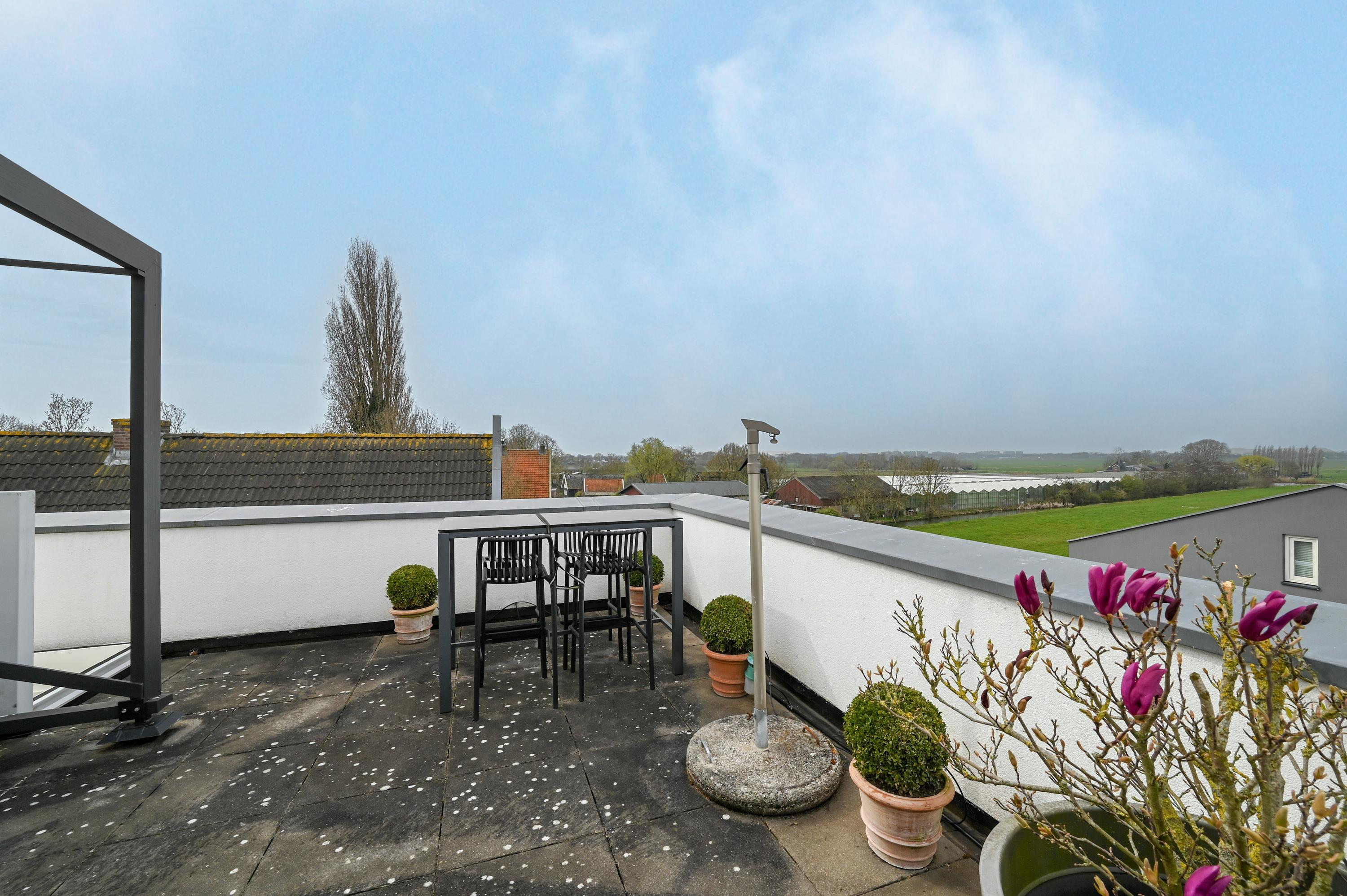 Het terras is volledig betegeld met grote, lichte tegels en omlijst met verzorgde beplanting langs de randen. Dankzij subtiele tuinverlichting ontstaat hier een stijlvolle en uitnodigende buitenruimte, waar u zowel overdag als ’s-avonds van het buitenleven kunt genieten. Het elektrische zonnescherm zorgt voor schaduw wanneer nodig.