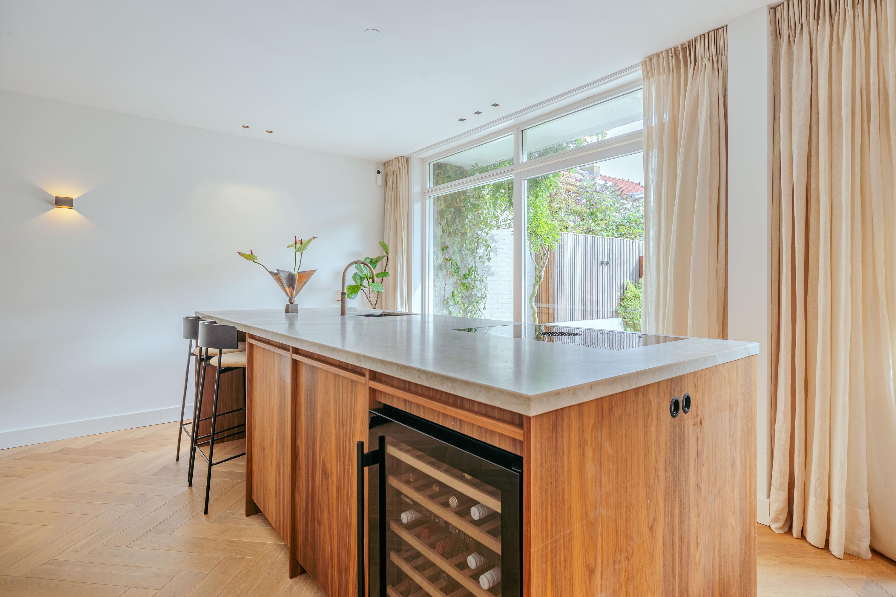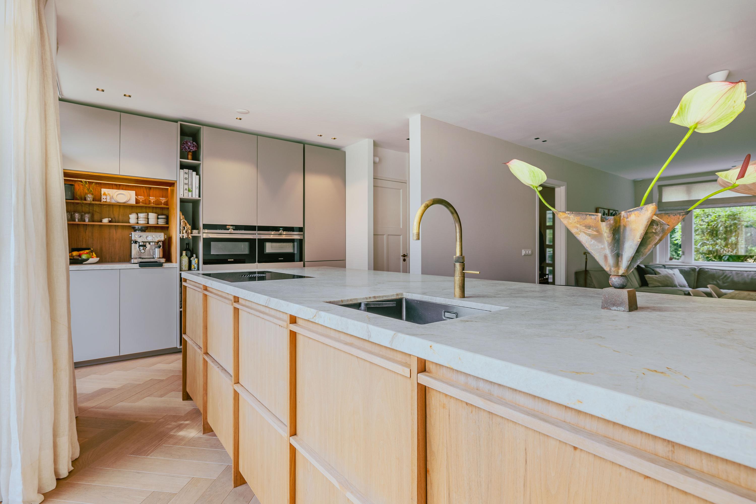 Middels de verzorgde voortuin bereikt u de entree van de woning. De hal beschikt over een praktische trapkast en een apart toilet met fontein. Vanuit hier heeft u toegang tot de lichte woonkamer en de royale leefkeuken aan de achterzijde. De woning is in 2021 volledig gerenoveerd en voorzien van een eikenhouten visgraatvloer met vloerverwarming. De luxe keuken is uitgevoerd met een centraal kookeiland en hoogwaardige inbouwapparatuur, waaronder een Bora inductiekookplaat met afzuiging, Quooker, spoelbak, klimaatkast, twee combi-ovens(waarvan een met stoomfunctie), koelkast, vriezer en vaatwasser. Het natuurstenen werkblad van Taj Mahal kwartsiet geeft de keuken een hoogwaardige uitstraling. Dankzij de grote raampartijen en de glazen deur naar de tuin profiteert deze verdieping van veel daglicht. De achtertuin (41m² op het zuiden) is in 2022 ontworpen en aangelegd door een professionele tuinarchitect, voorzien van verlichting en irrigatie, en beschikt over een vrijstaande berging (ca. 6 m²) met elektra.