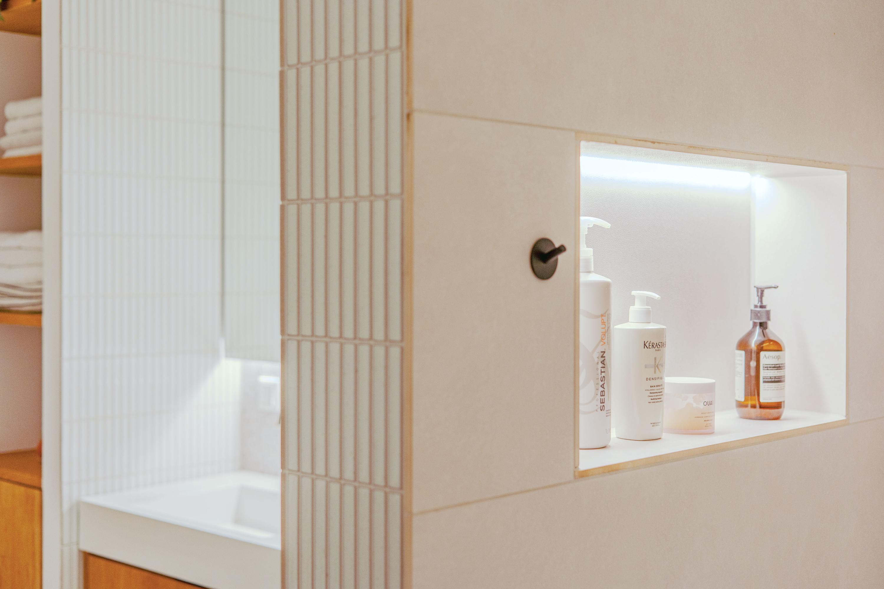 De overloop geeft toegang tot drie slaapkamers, een ruime badkamer en een separaat toilet. De master bedroom ligt aan de voorzijde en biedt voldoende ruimte voor een groot bed en kastenwand. Direct ernaast bevindt zich een extra kamer die eenvoudig als inloopkast kan worden ingericht. Aan de achterzijde liggen nog twee slaapkamers, waarvan één met toegang tot het balkon en één voorzien van een elektrisch rolluik op zonne-energie. De moderne badkamer is uitgerust met een ligbad, dubbele wastafel met meubel, vloerverwarming en een verwarmde spiegel.