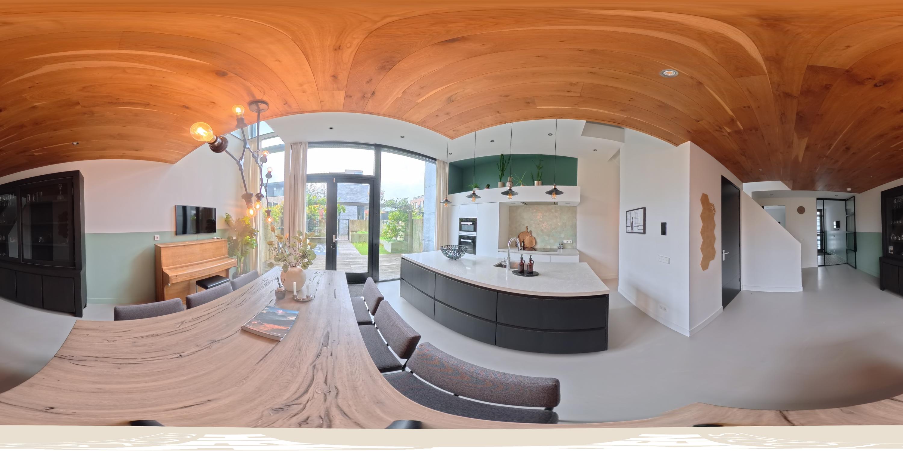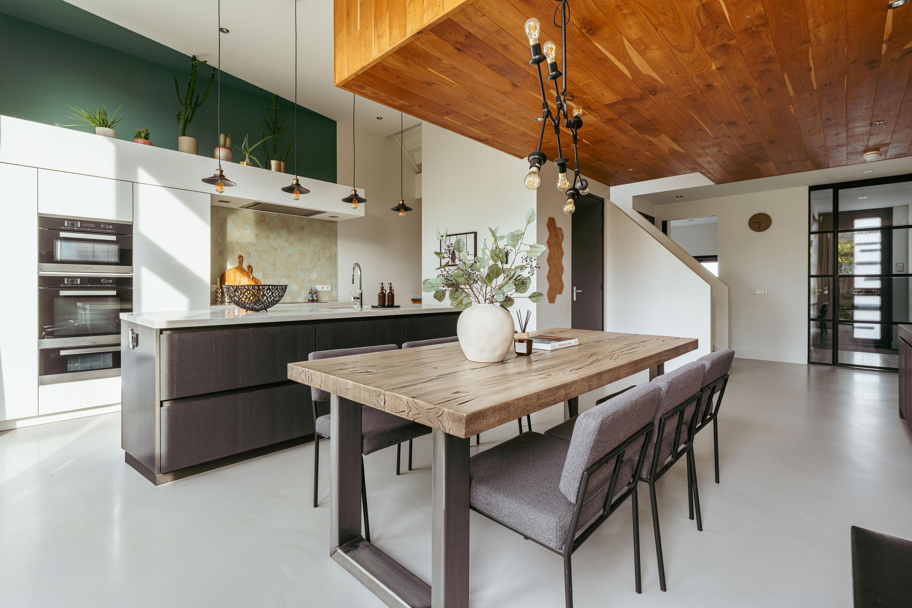 Via de glazen tussendeur bereikt u de ruime leefkeuken, gelegen aan de achterzijde met zicht op de tuin. De hoge plafonds en grote raampartijen tot aan de vloer zorgen voor een overvloed aan licht en een ruimtelijk gevoel. De moderne keuken is uitgerust met een groot kookeiland, composiet werkblad en hoogwaardige inbouwapparatuur, waaronder een vaatwasser, Quooker, inductiekookplaat, magnetron, oven en bordenwarmer.