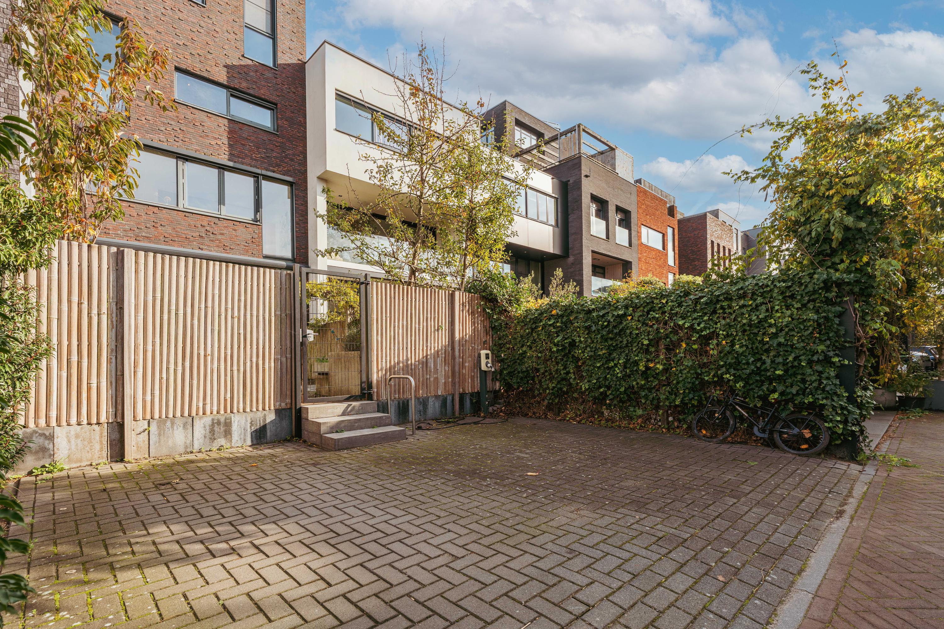 Dubbele openslaande deuren geven toegang tot de onderhoudsvriendelijke achtertuin van circa 54 m². De tuin is fraai aangelegd met houten vlonders, sierbestrating en groen. Achterin bevindt zich een eigen poort naar het achtergelegen terrein met twee privéparkeerplaatsen voorzien van een elektrische laadpaal.