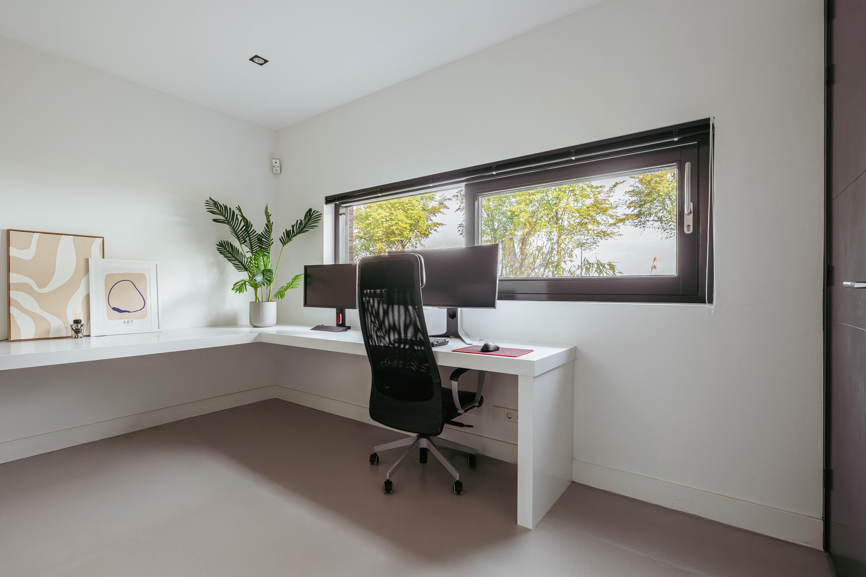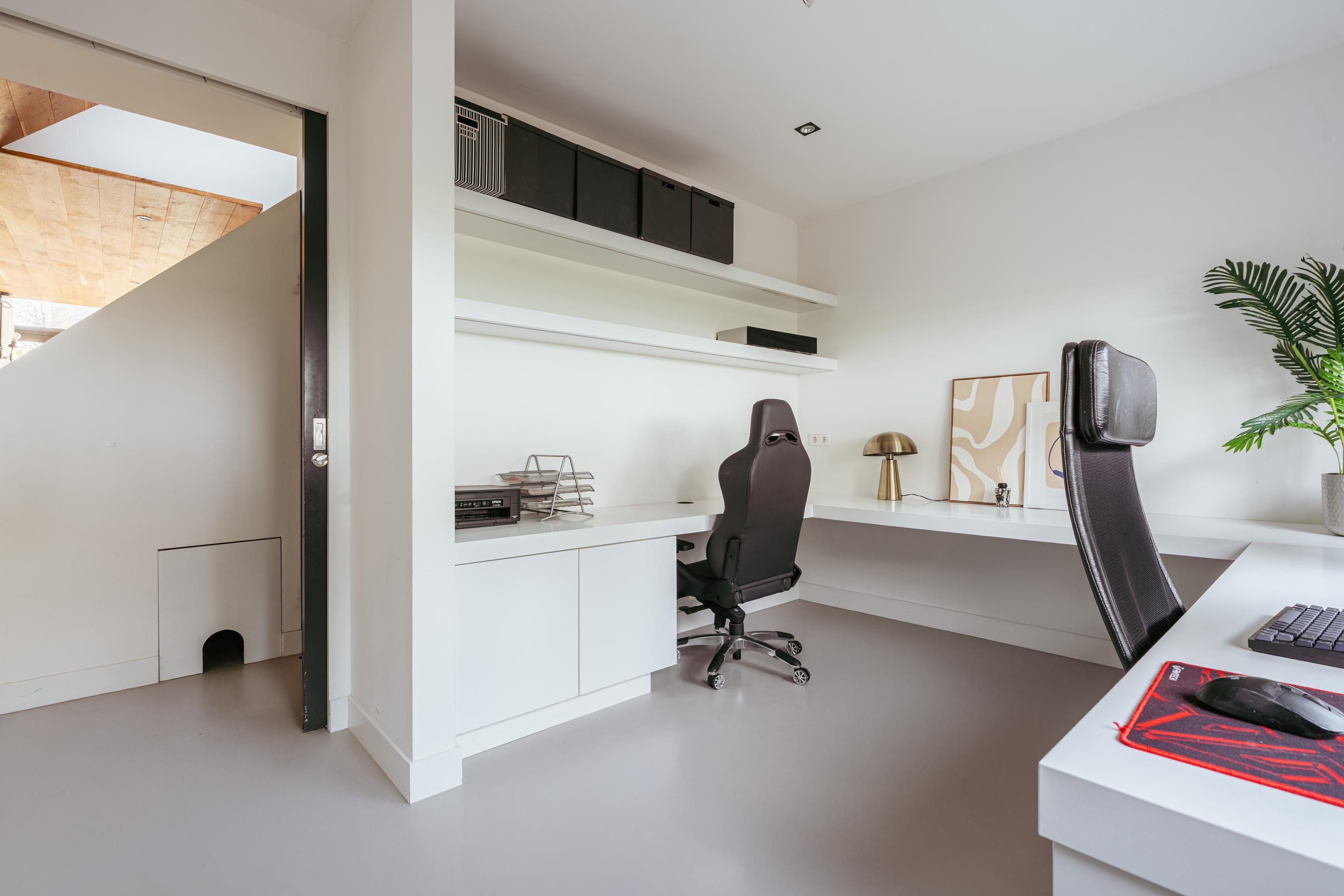 Aan de achterzijde ligt een tweede ruime werkkamer met veel daglicht en uitzicht op de groene binnentuin. Deze ruimte is ook uitstekend geschikt als speelkamer of extra slaapkamer.