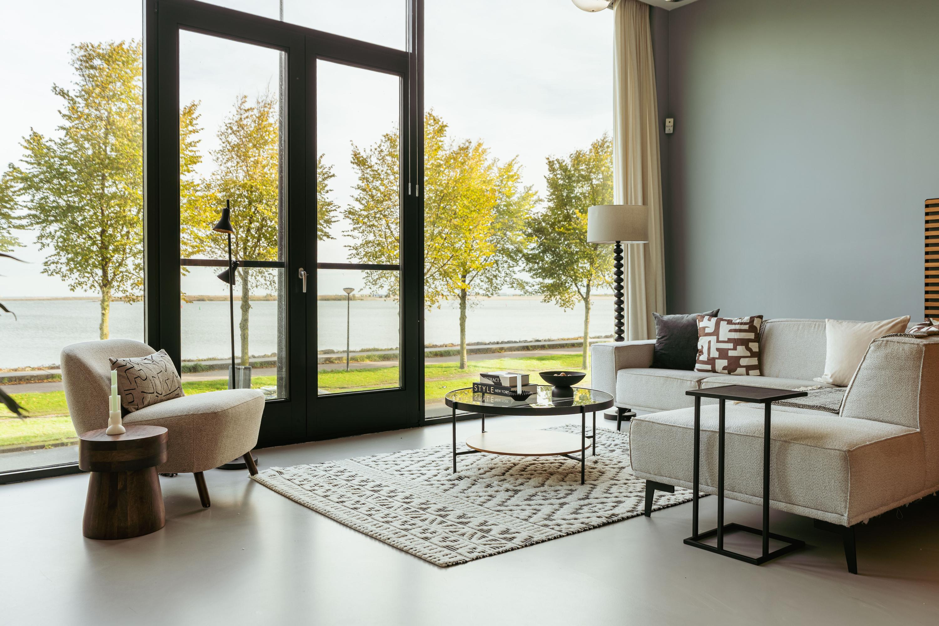 De eerste verdieping is ingericht als comfortabele woonverdieping met een speelse indeling en veel licht. Aan de voorzijde ligt de ruime woonkamer met een plafondhoogte van 2,60 meter en grote raampartijen met vrij uitzicht over het IJmeer. De openslaande deuren en haard creëren een sfeervolle, lichte ruimte met een vloeiende overgang tussen binnen en buiten.