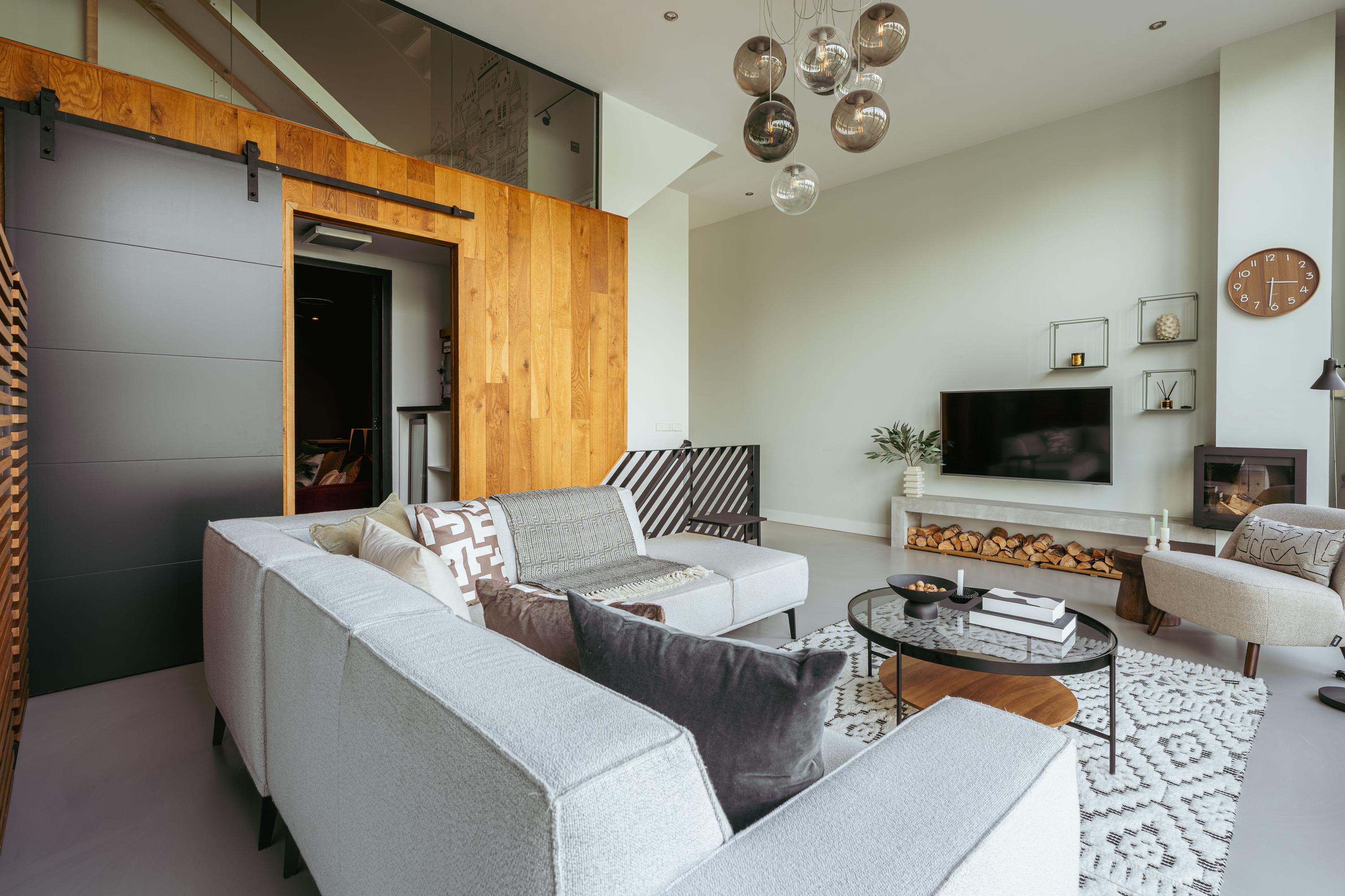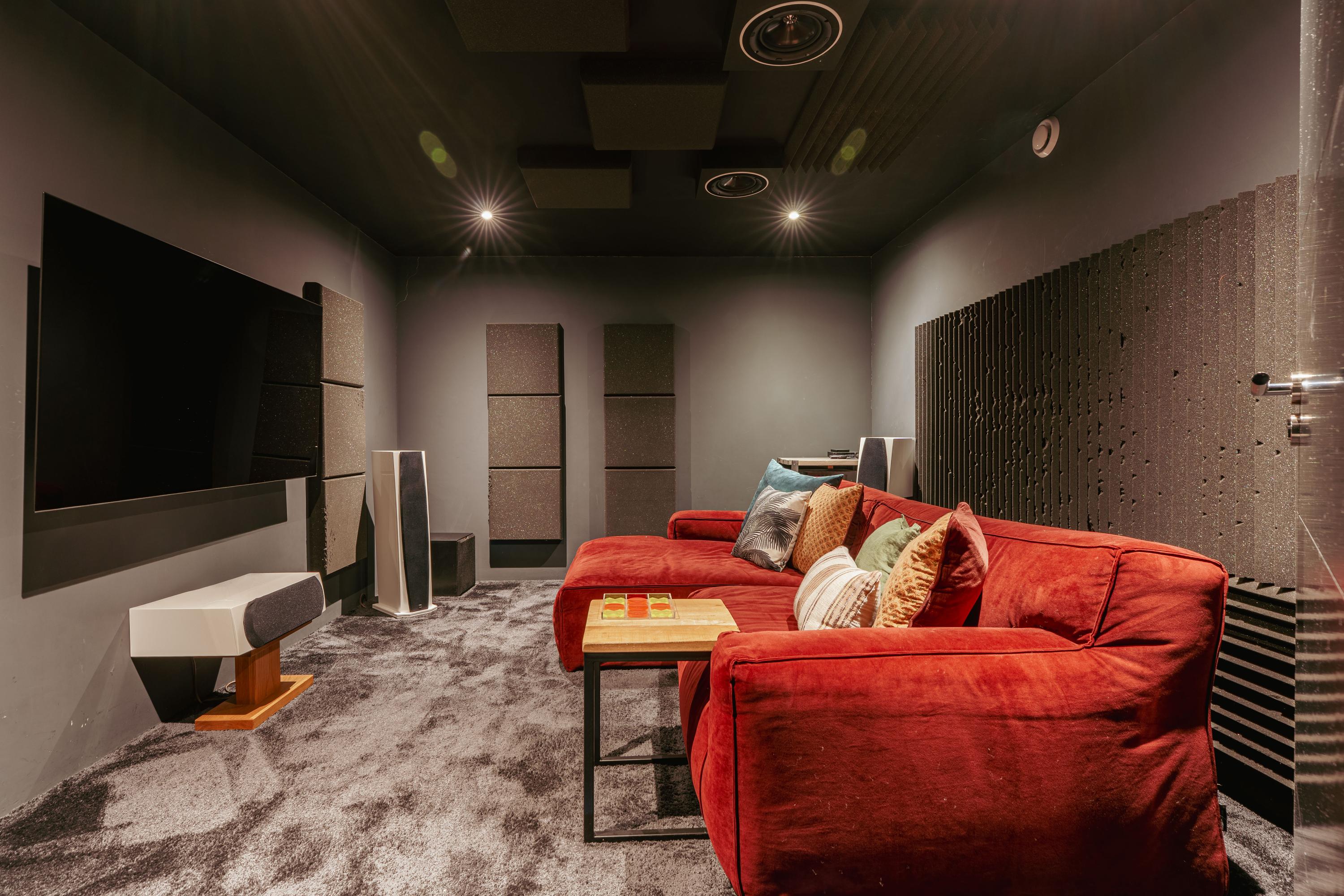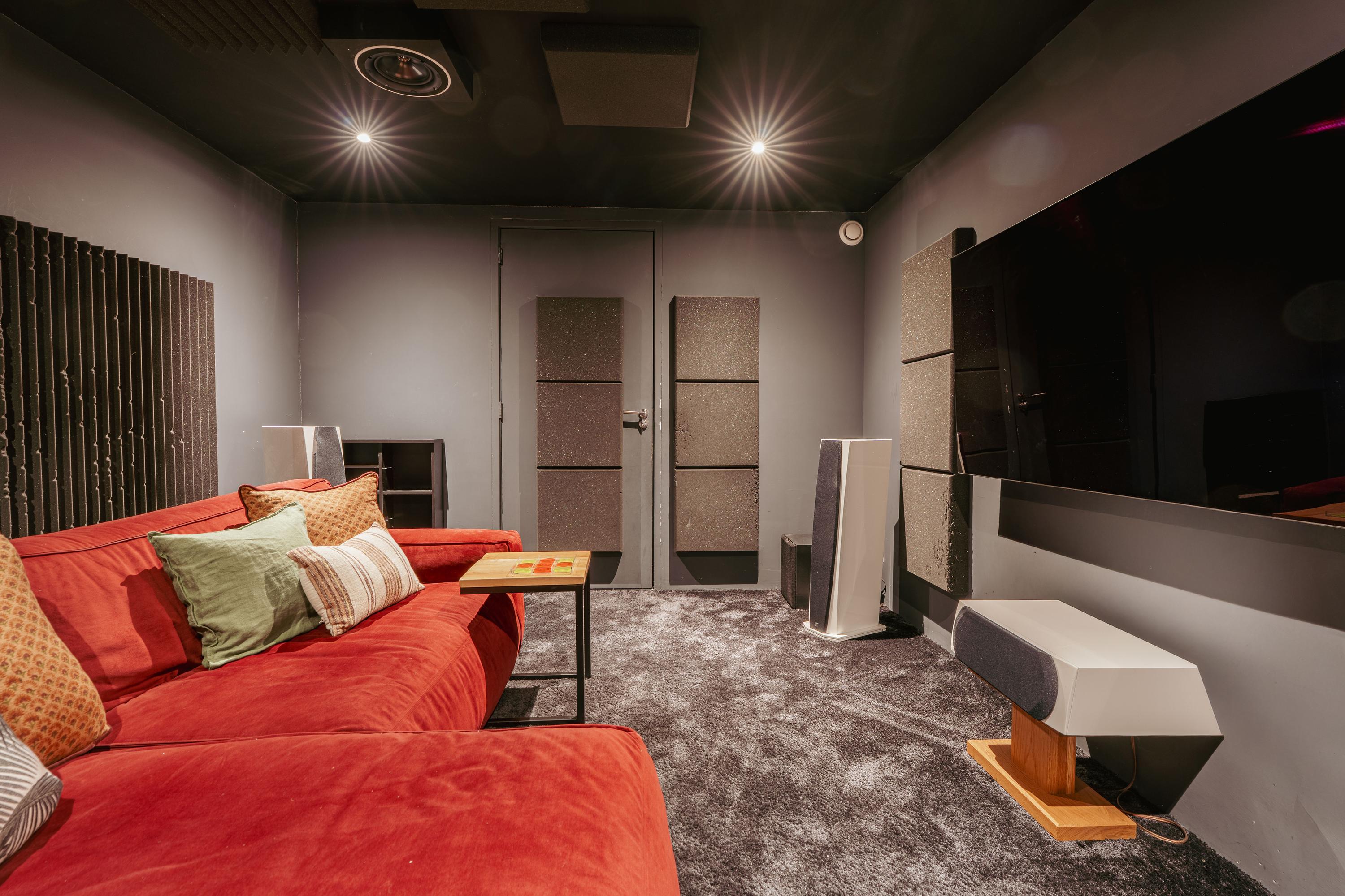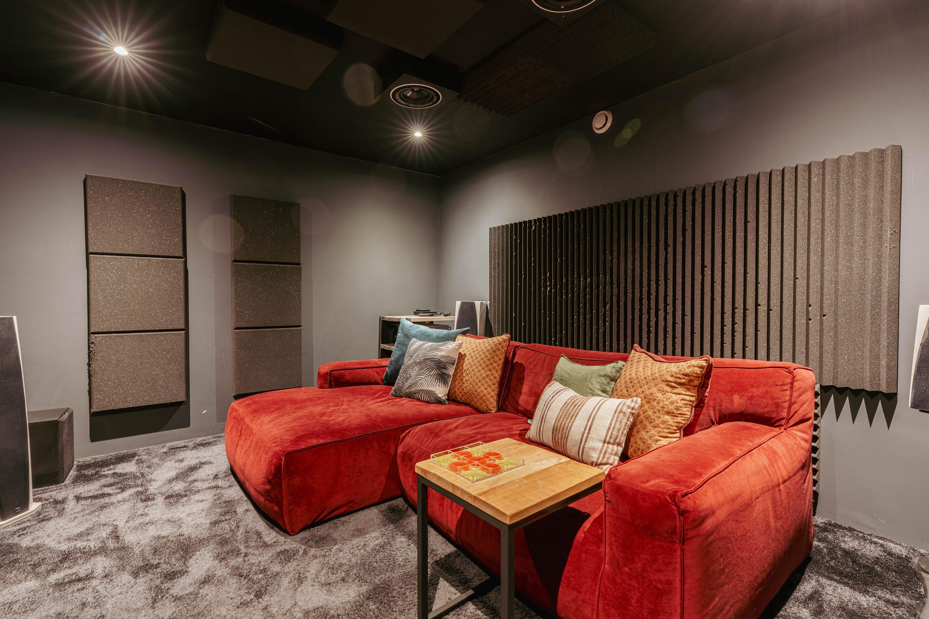 Aangrenzend bevindt zich een sfeervolle tv- of bioscoopkamer, volledig geïsoleerd en voorzien van akoestische wandpanelen — de ideale plek voor een filmavond of om ongestoord muziek te luisteren.