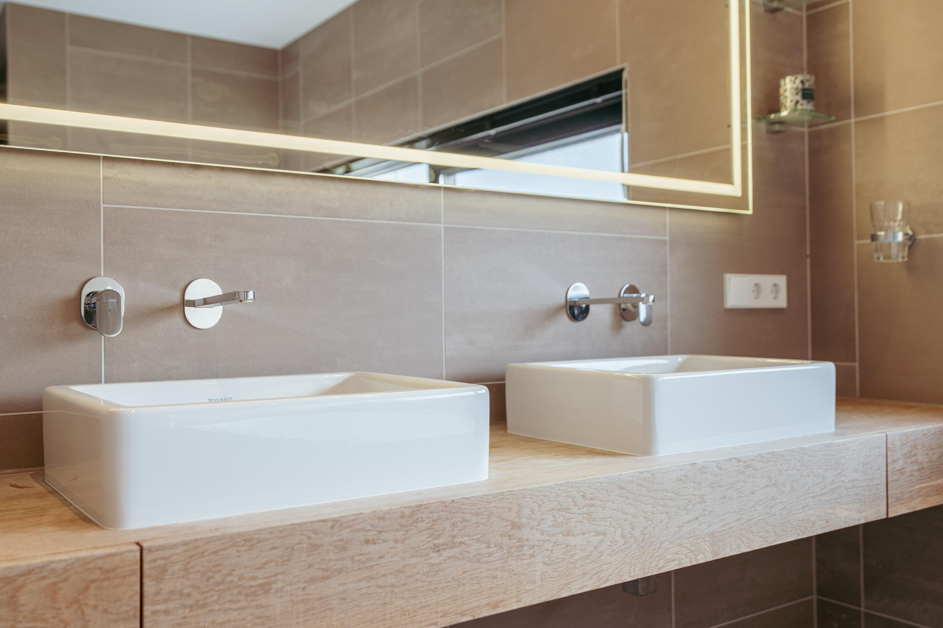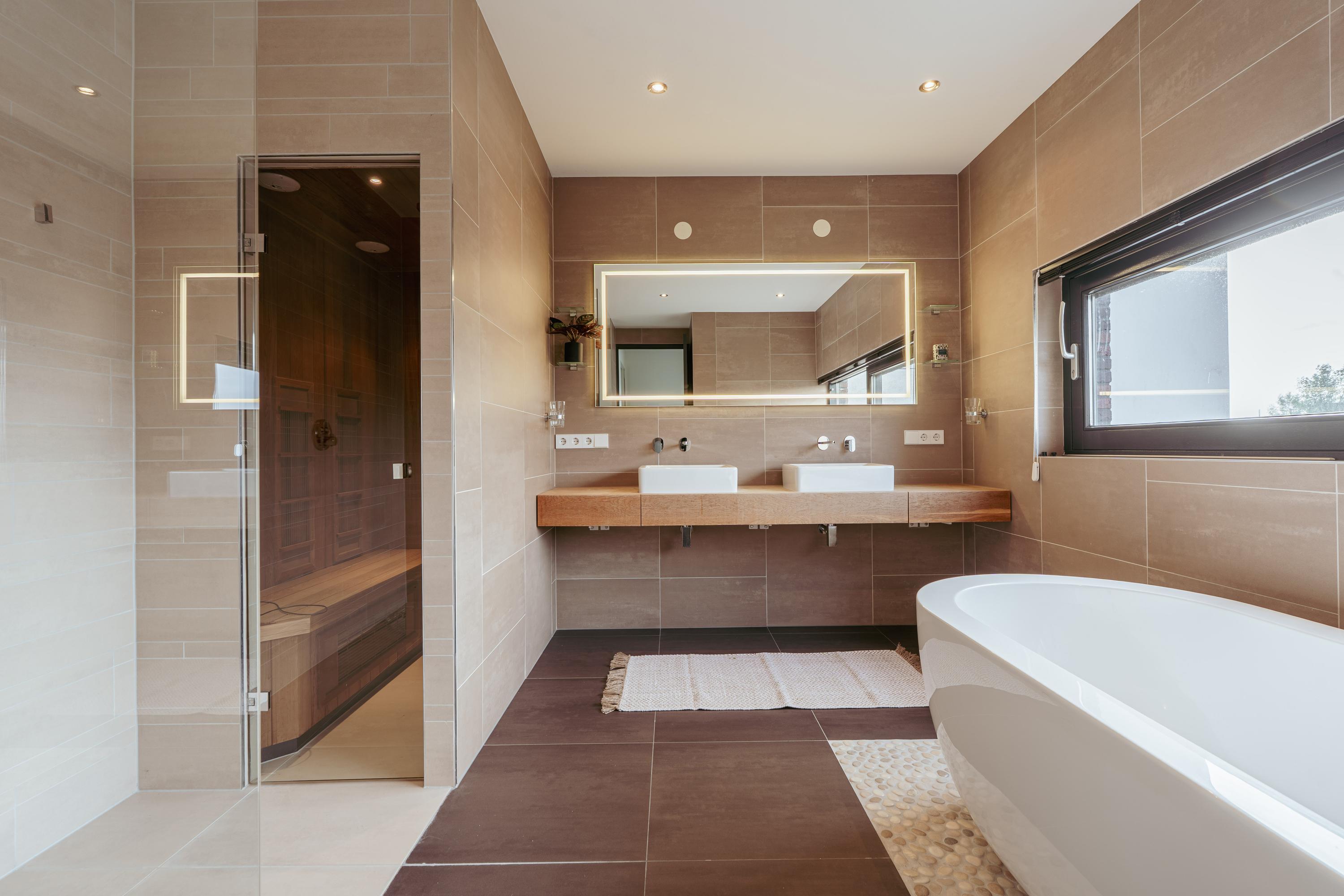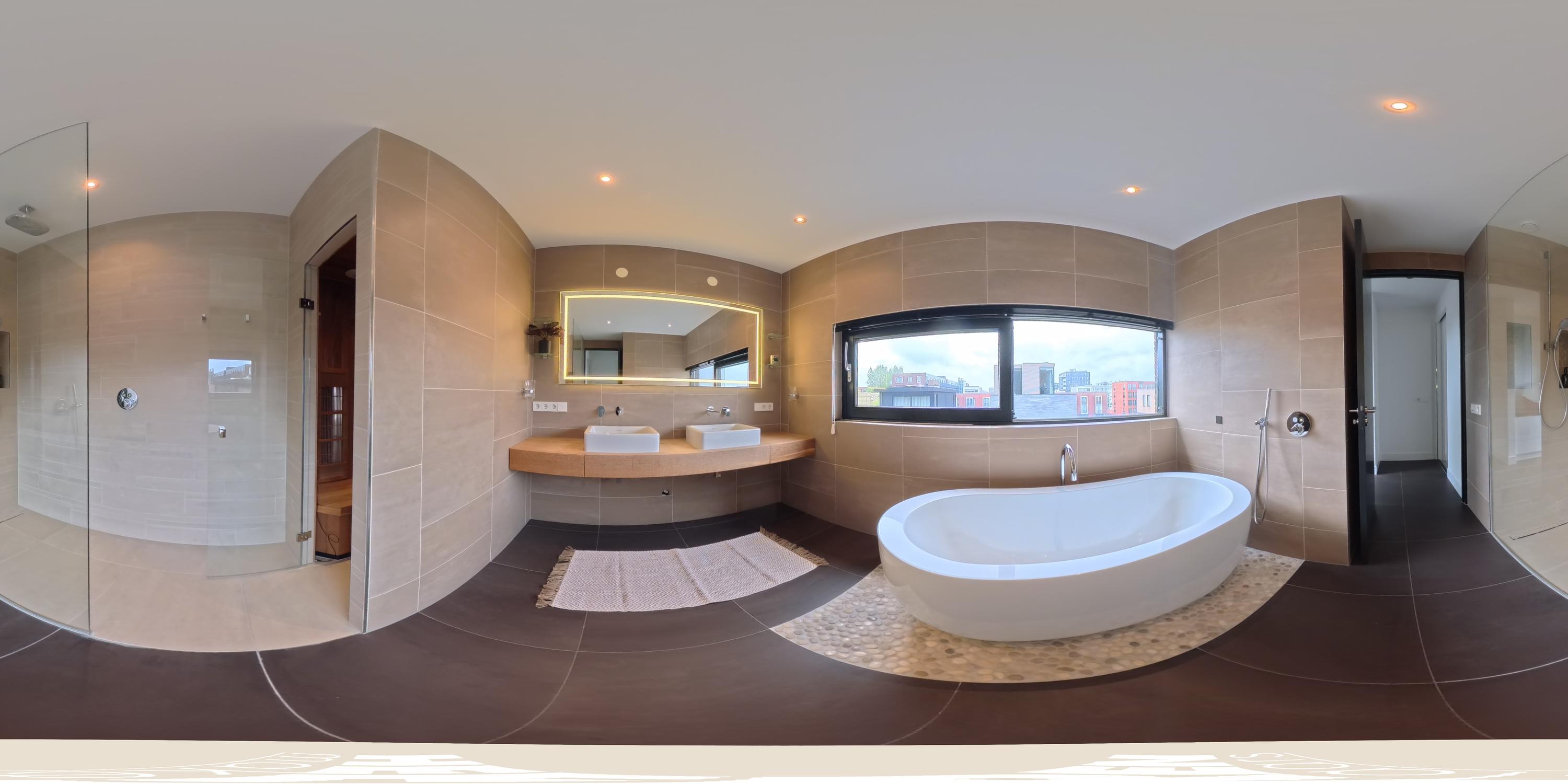 De royale badkamer ademt luxe en rust, met warme aardetinten en hoogwaardige afwerking. De ruimte beschikt over een vrijstaand ligbad, inloopdouche met regendouche, dubbele wastafel en een sauna — een heerlijke plek voor ontspanning na een drukke dag.