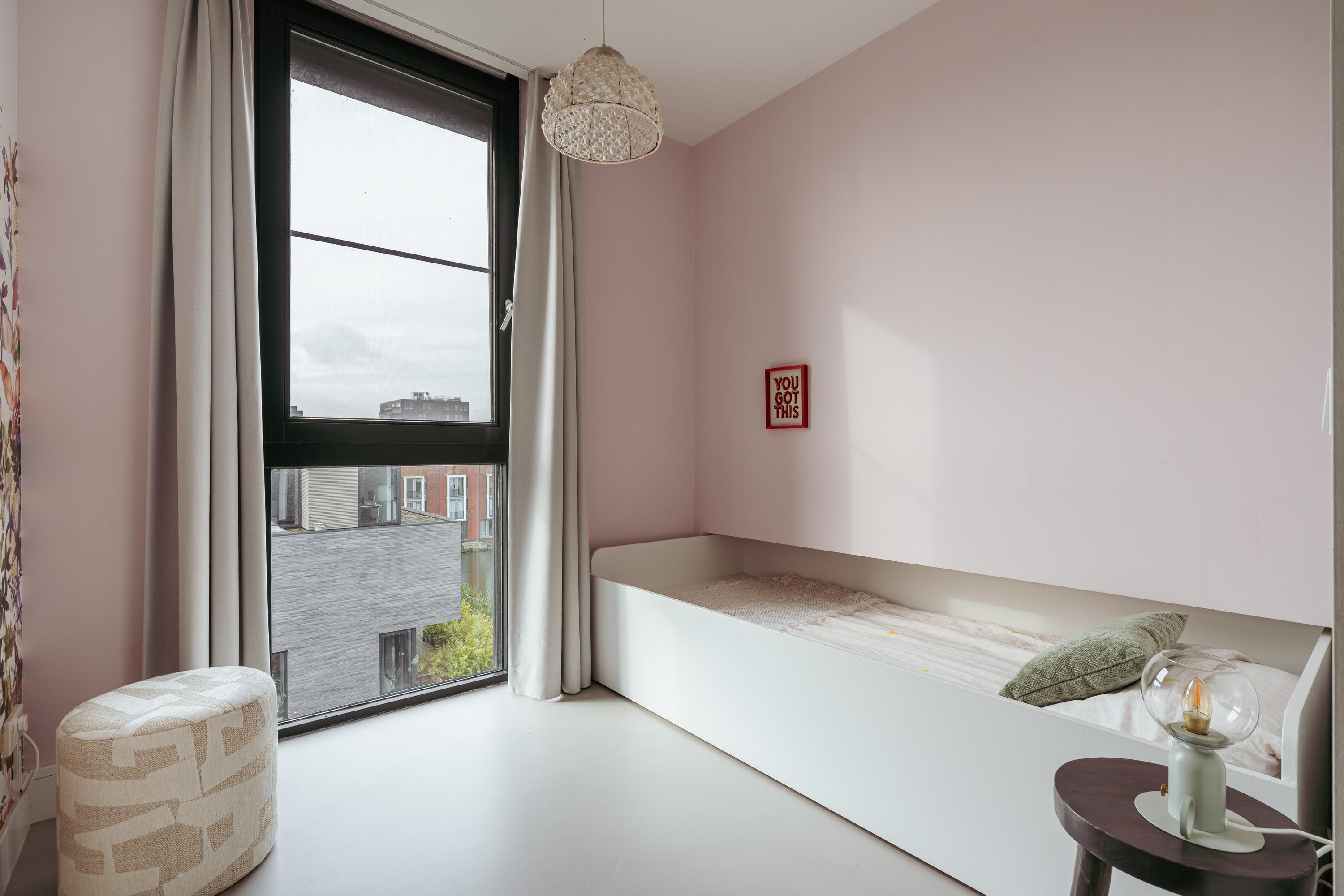 Daarnaast beschikt deze verdieping over een separaat toilet, een praktische berging en een vaste kast. De afwerking is modern en verzorgd, met een strakke gietvloer en glad gestucte wanden.