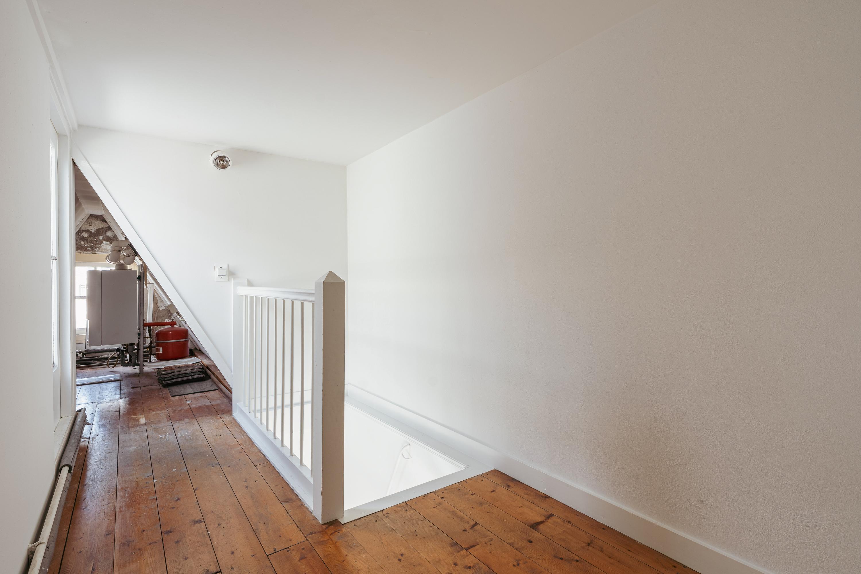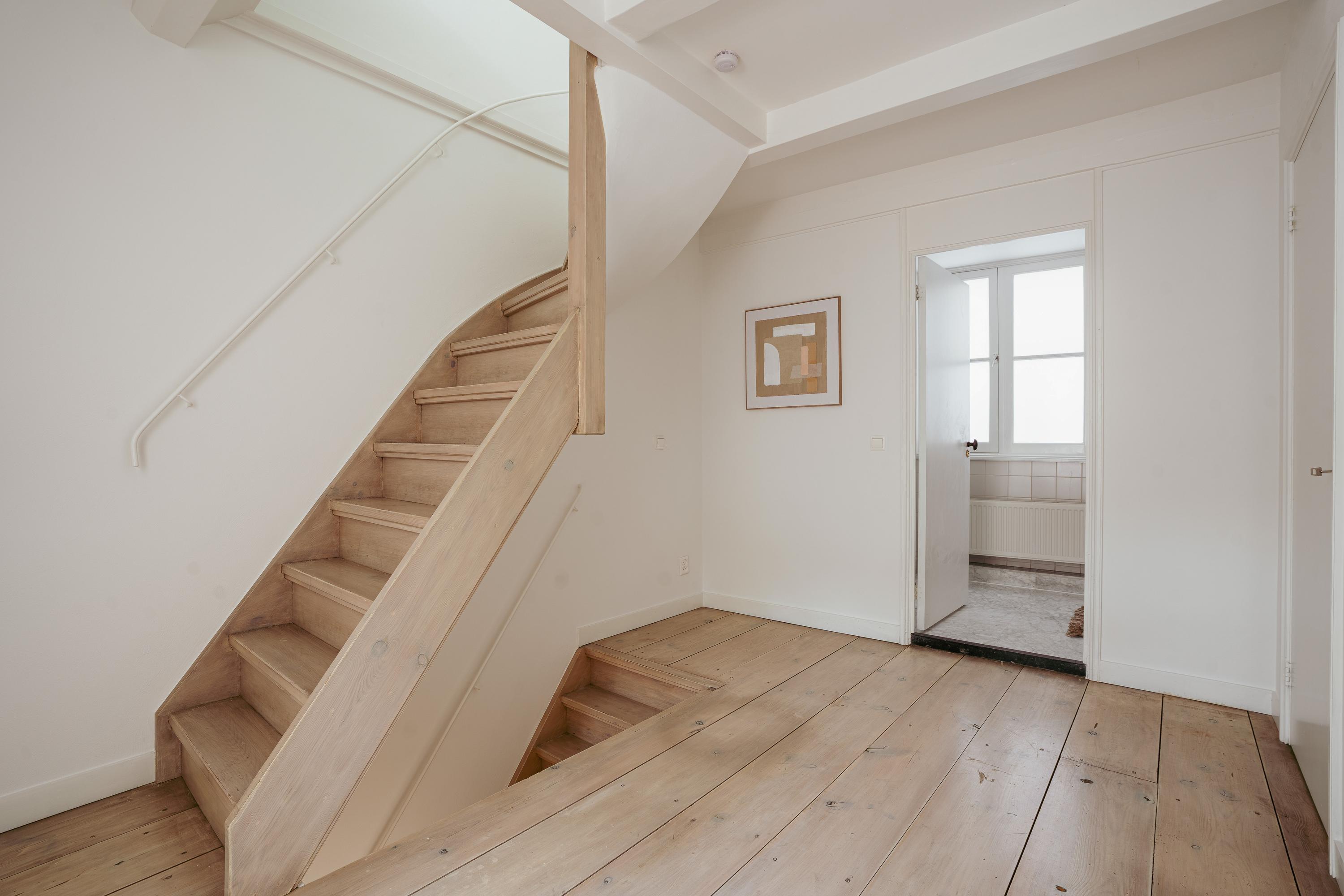Een open trap leidt naar de eerste verdieping, waar een bijzonder fraaie woonkamer te vinden is. Deze is ingedeeld met een speels split-level, waardoor er ruimte ontstaat voor een gezellige leeshoek en een zitkamer aan de voorzijde. Vanuit hier is het uitzicht over de gracht werkelijk indrukwekkend.