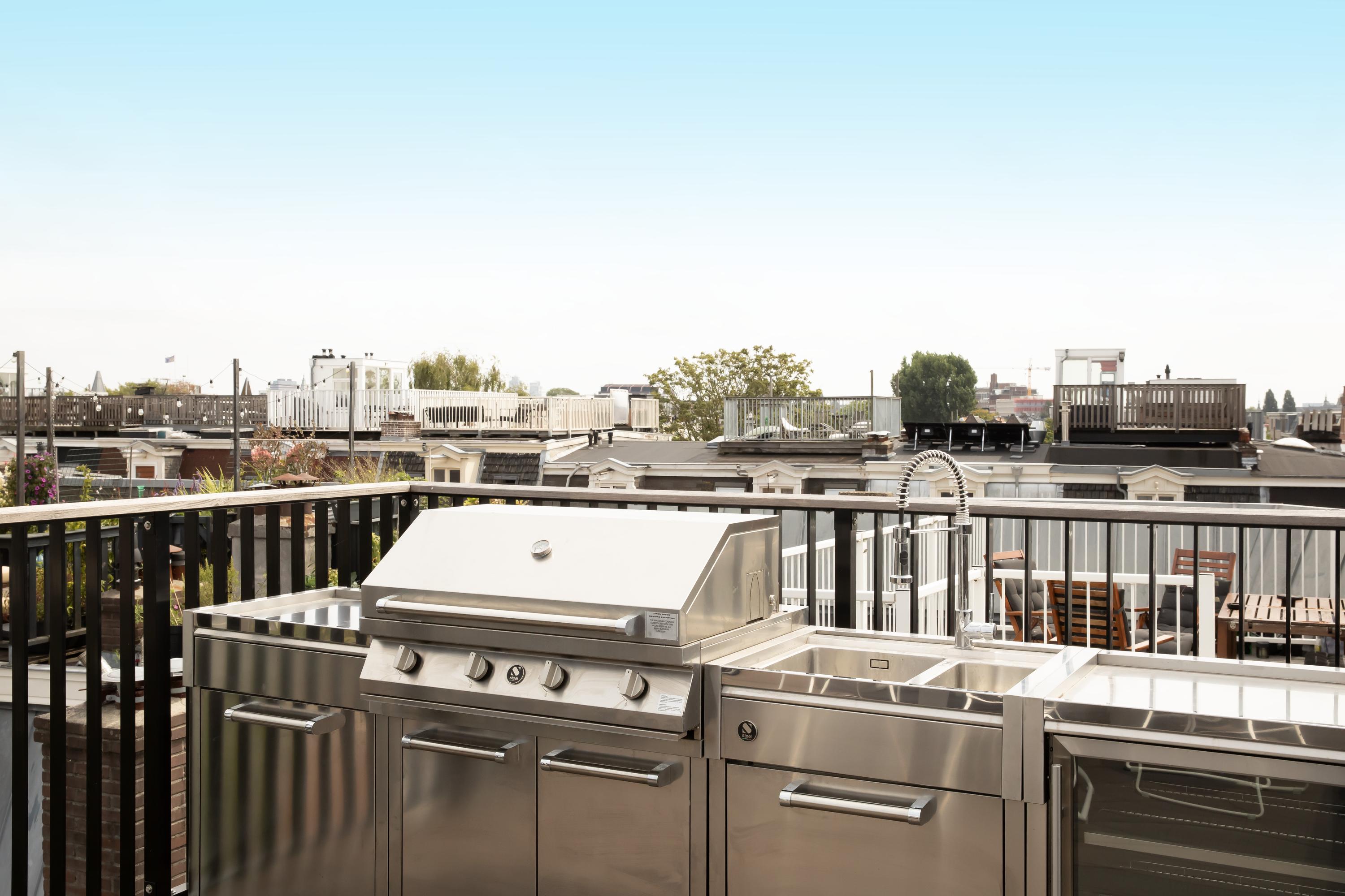 Het absolute hoogtepunt van deze woning is het riante dakterras, dat een prachtig uitzicht over de stad biedt. Hier kunt u tot in de late uurtjes genieten van de zon. Het terras is bovendien uitgerust met een luxe buitenkeuken met grill, spoelbak, ijsmachine en wijnklimaatkast – een perfecte plek voor ontspannen avonden en sfeervolle diners.