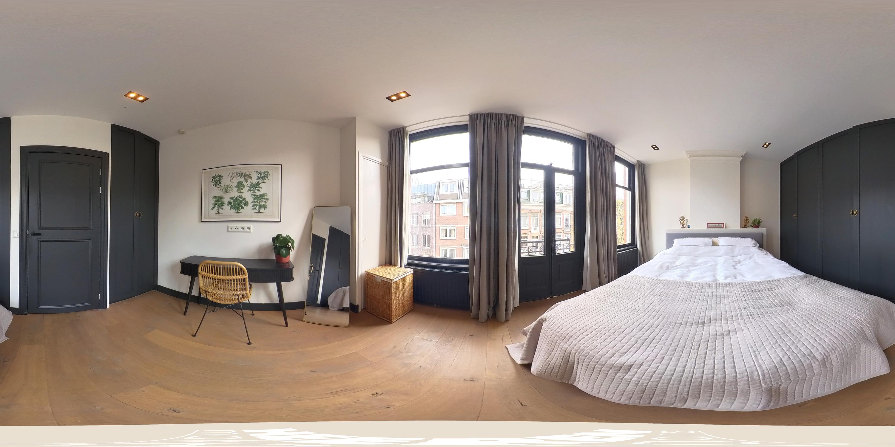 De woonverdieping, gelegen op de vierde verdieping, bestaat uit een royale en lichte woonkamer met open keuken. De ruimte kenmerkt zich door de sfeervolle houten balken, die zorgen voor karakter en warmte. Dankzij de raampartijen aan zowel de voor- als achterzijde, en het inkomende licht vanaf het dakterras, is er gedurende de dag een prettige lichtinval. De open keuken loopt over de gehele wand en beschikt over meer dan voldoende bergruimte. De keuken is uitgerust met een zes pits gasfornuis, afzuigkap, oven, vaatwasser, spoelbak met Quooker, koelkast, vriezer en wijnklimaatkast. Tevens is deze verdieping voorzien van een apart toilet met dubbele deur. Vanuit de woonkamer is er direct toegang tot het balkon aan de achterzijde, gelegen op het Westen. Een vaste trap leidt naar het waanzinnige dakterras. Dit ruime terras biedt volledige privacy en geniet van 360 graden zon, waardoor u hier de hele dag door kunt ontspannen. Het terras biedt volop ruimte voor meerdere zit- en loungeplekken en is een absolute eyecatcher van de woning. De slaapverdieping is gelegen op de derde etage. Hier bevinden zich drie goed bemeten slaapkamers. Aan de achterzijde liggen twee slaapkamers, beide met toegang tot het balkon. Deze kamers zijn ideaal te gebruiken als slaap-, werk- of logeerkamer. Aan de voorzijde bevindt zich de nog ruimere master bedroom met Frans balkon. De badkamer is centraal gelegen en voorzien van een inloopdouche, dubbele wastafel met meubel en toilet. Daarnaast is er een separate ruimte met aansluitingen voor de wasmachine en droger, evenals praktische kastruimte op de overloop. De woonlagen zijn omgedraaid, waardoor de woonverdieping zich op de bovenste laag bevindt en optimaal wordt geprofiteerd van lichtinval, privacy en een ruimtelijk gevoel.