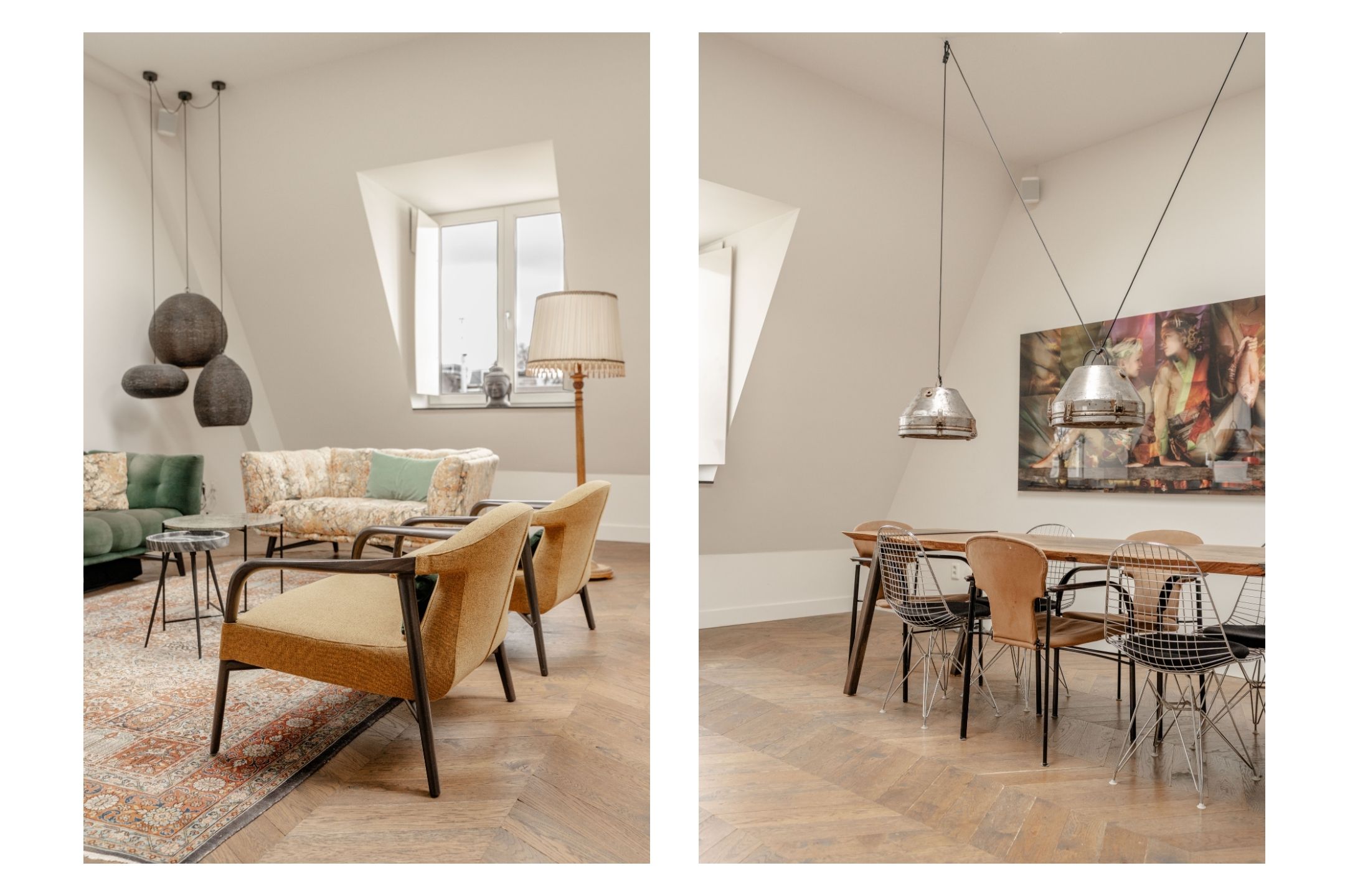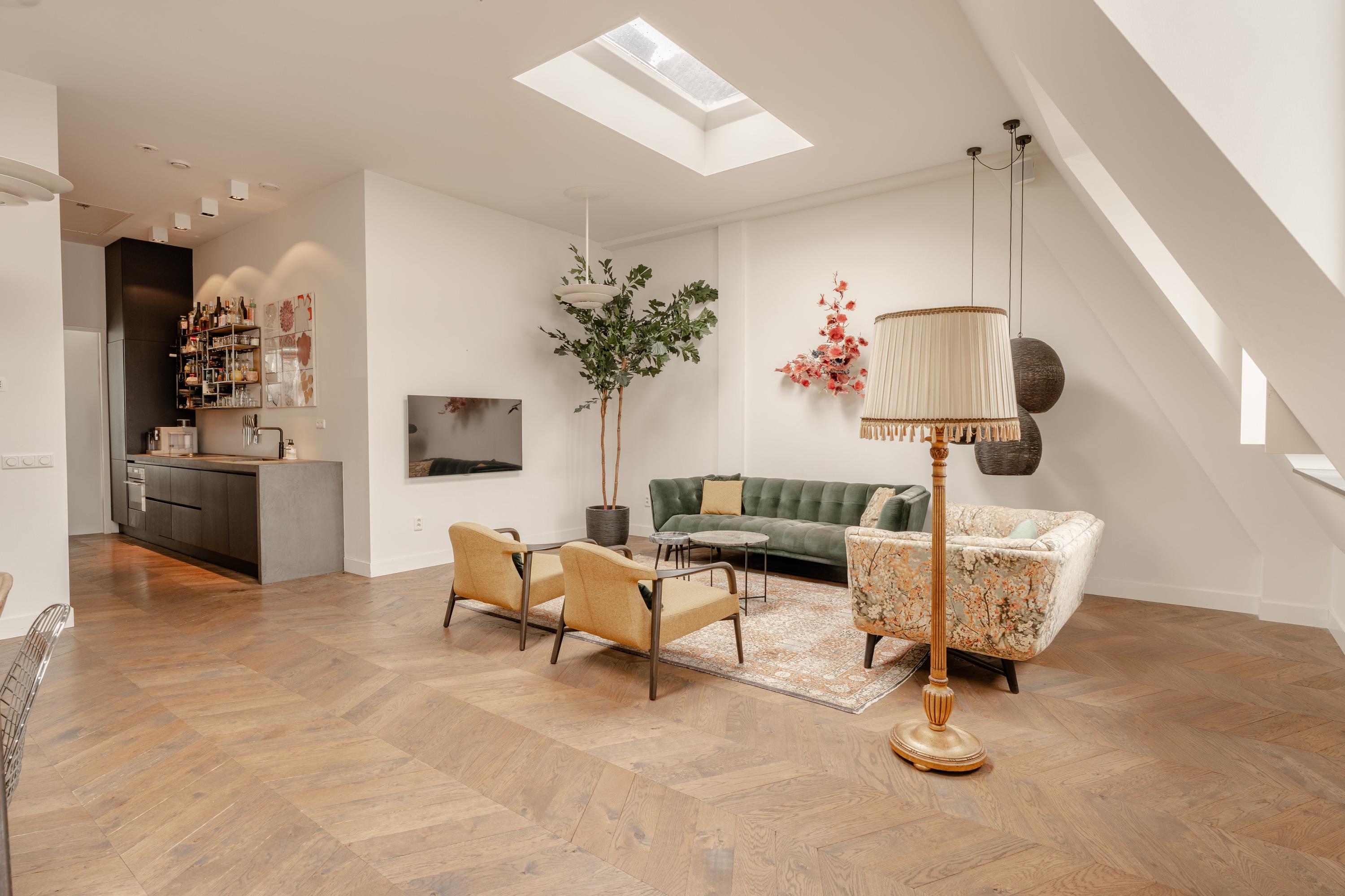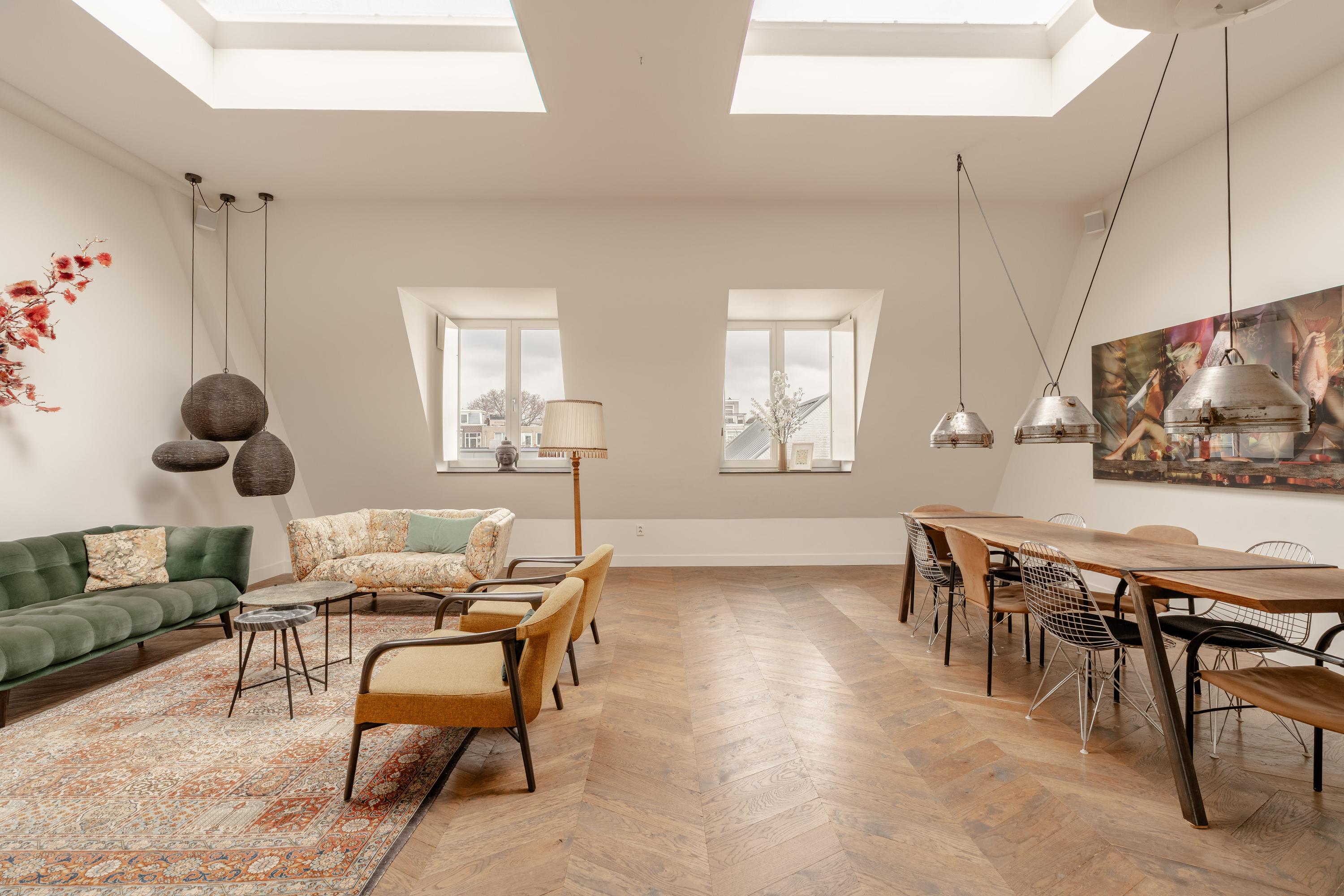 De derde verdieping vormt de woonverdieping van de woning. Hier bevindt zich de royale en lichte woonkamer met open keuken aan de voorzijde. Dankzij de indrukwekkende plafondhoogte en meerdere dakramen valt er veel daglicht naar binnen, wat de ruimte een bijzonder open en ruimtelijk karakter geeft. De houten vloer en de strakke afwerking zorgen voor een warme en moderne uitstraling.