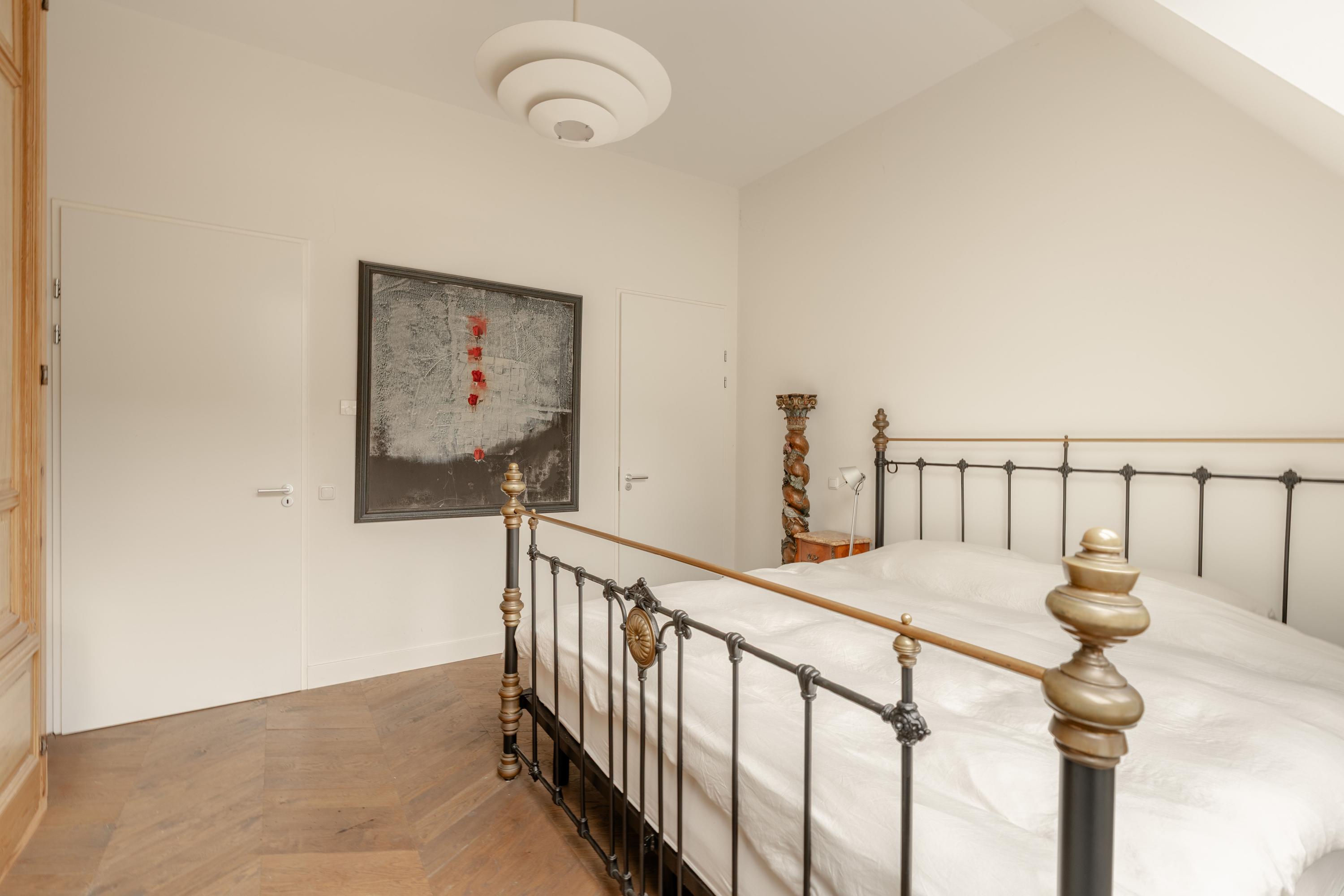 De slaapkamer aan de achterzijde is bijzonder royaal en beschikt over grote raampartijen met Frans balkon, waardoor er veel natuurlijk licht naar binnen valt. De kamer biedt ruim plaats aan een groot bed en kastruimte. Aangrenzend bevindt zich de en-suite badkamer, voorzien van een douche, wastafel en toilet.