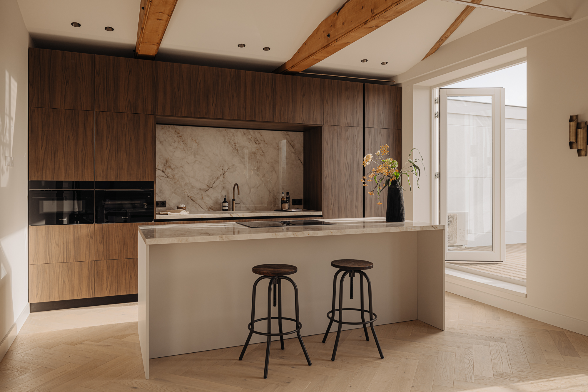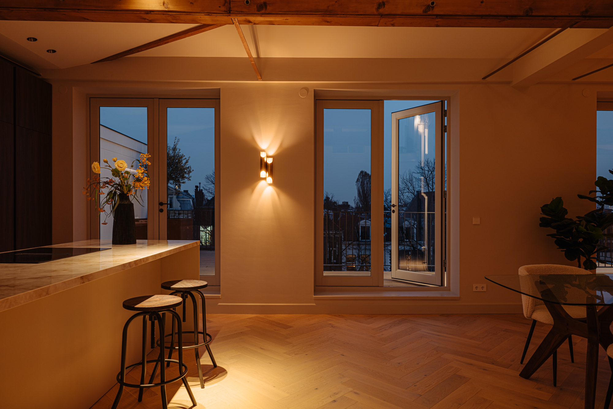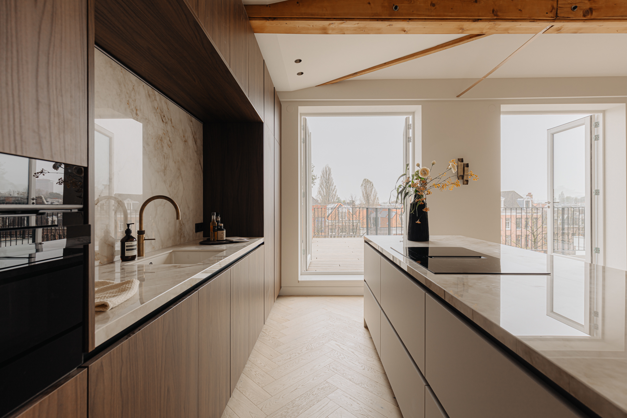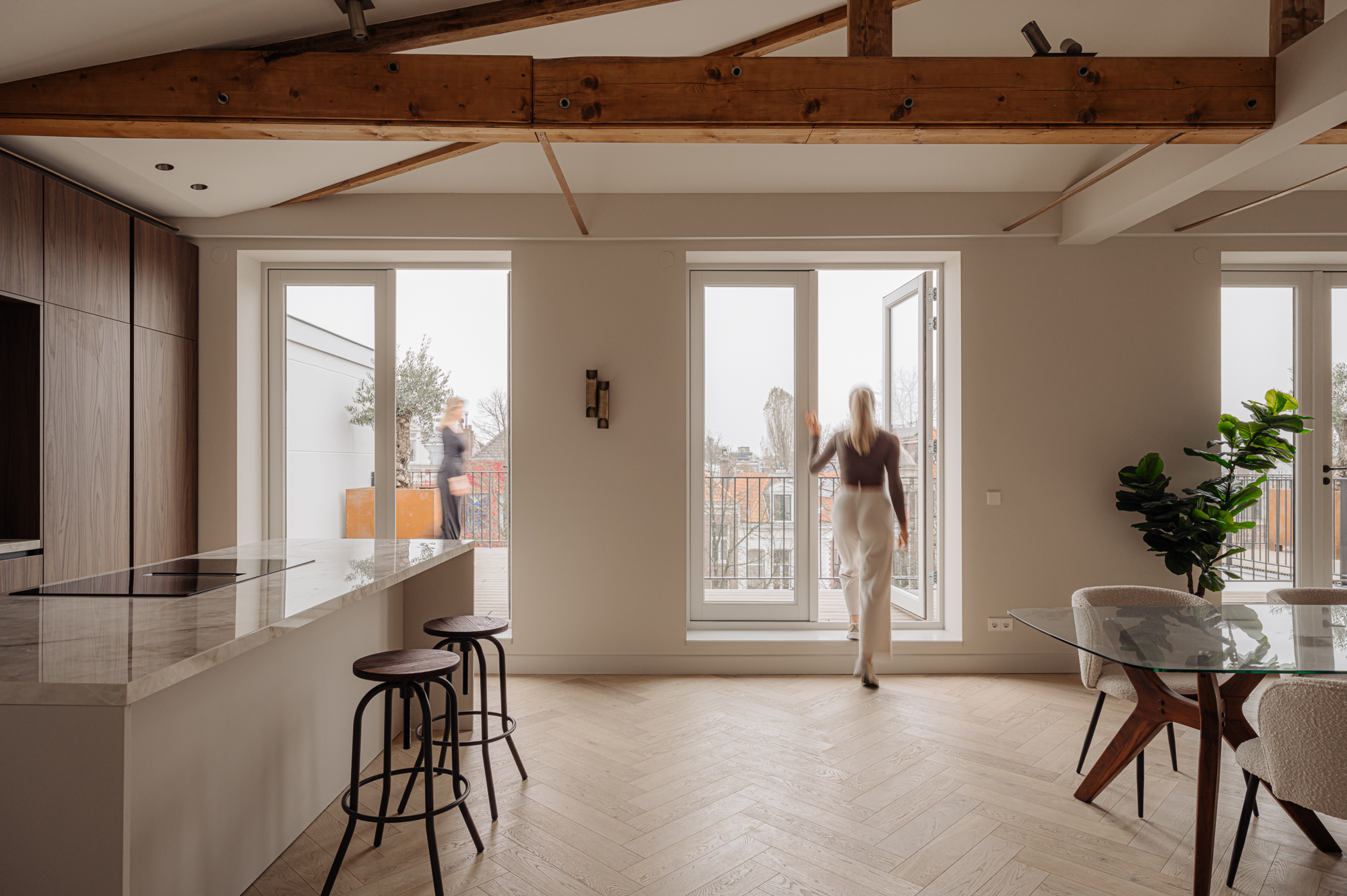 Bij binnenkomst via de lift, welke in de woning uitkomt, betreed u de overloop welke toegang biedt tot alle vertrekken. Aan de voorzijde bevindt zich de lichte en ruime woonkamer. Met de originelen houten balken in het zicht ervaart u hier de luxe en comfort in combinatie met originele elementen. De Italiaanse open designerkeuken met kookeiland is uitgerust met alle denkbare inbouwapparatuur en biedt een perfecte balans tussen stijl en functionaliteit. De verfijnde combinatie van de kasten in de warme tint van notenhout met een stenen aanrechtblad zorgt voor een prachtige en sfeervolle uitstraling van de ruimte. Middels meerdere openslaande deuren is er vervolgens toegang tot het zonnige dakterras.