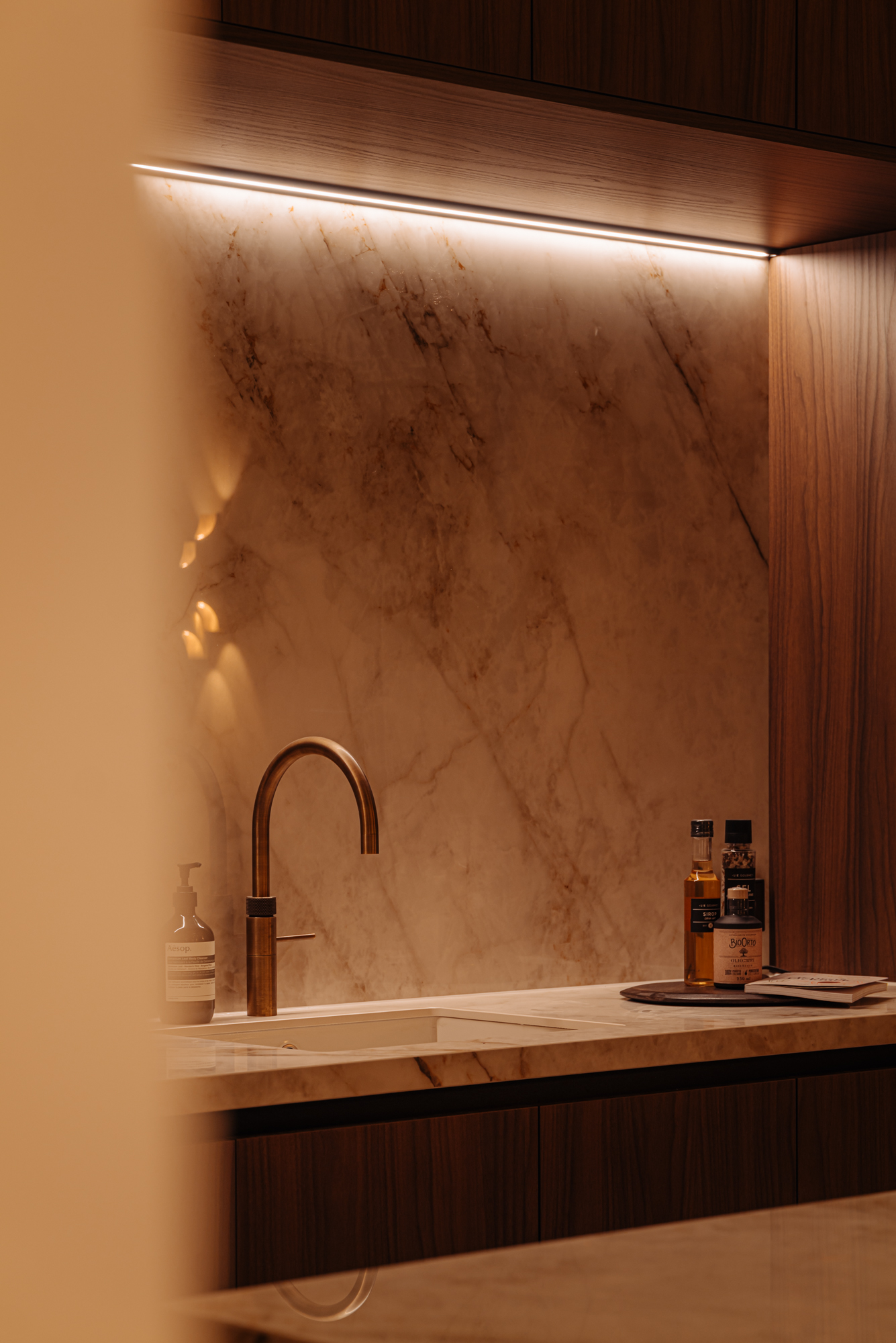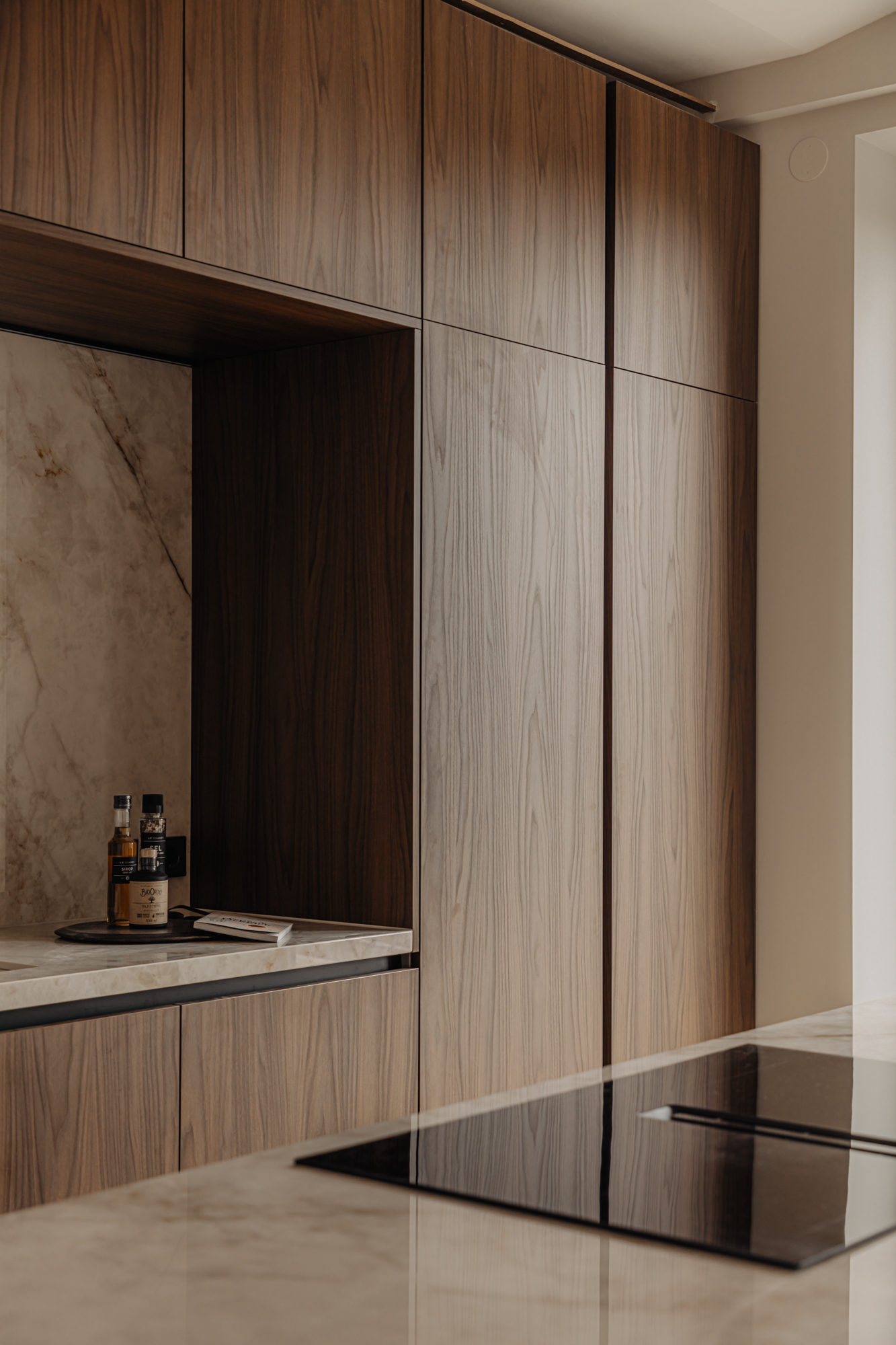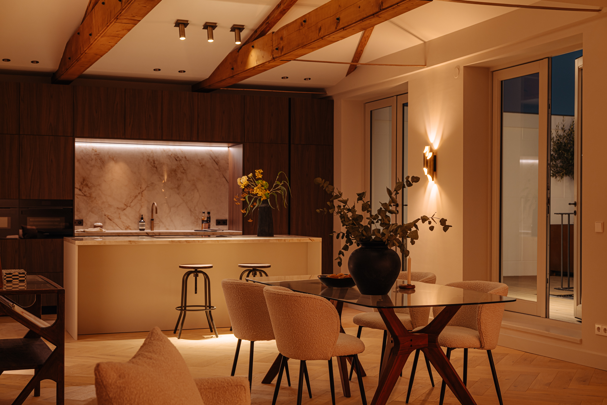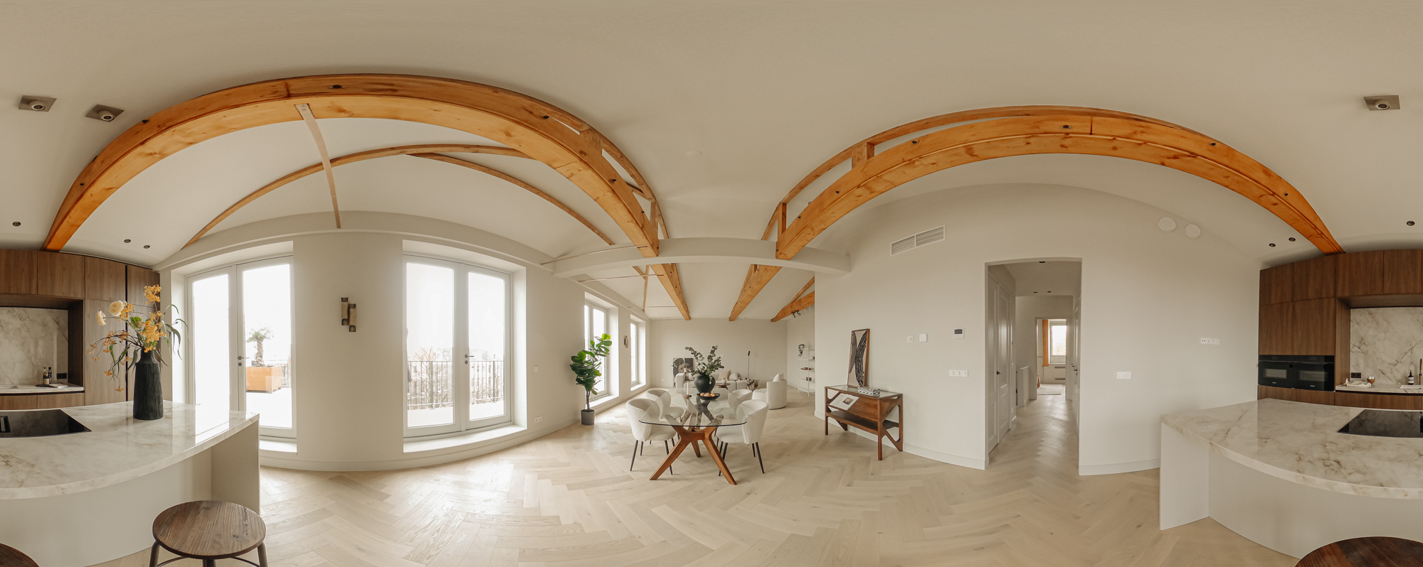 Bij binnenkomst via de lift, welke in de woning uitkomt, betreed u de overloop welke toegang biedt tot alle vertrekken. Aan de voorzijde bevindt zich de lichte en ruime woonkamer. Met de originelen houten balken in het zicht ervaart u hier de luxe en comfort in combinatie met originele elementen. De Italiaanse open designerkeuken met kookeiland is uitgerust met alle denkbare inbouwapparatuur en biedt een perfecte balans tussen stijl en functionaliteit. De verfijnde combinatie van de kasten in de warme tint van notenhout met een stenen aanrechtblad zorgt voor een prachtige en sfeervolle uitstraling van de ruimte. Middels meerdere openslaande deuren is er vervolgens toegang tot het zonnige dakterras.