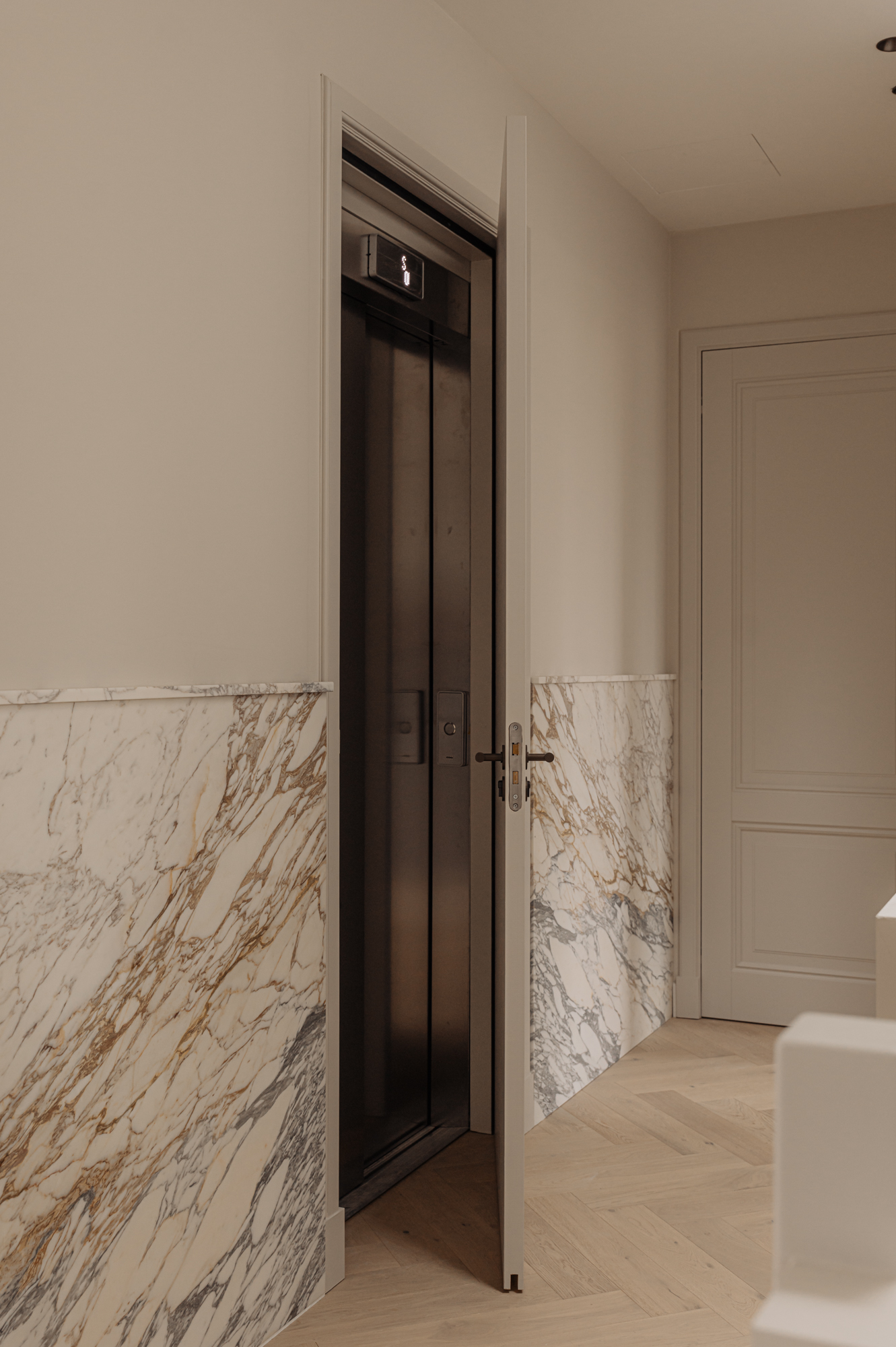 Via de privéparkeerplaatsen heeft u toegang tot het stijlvolle en gemeenschappelijke entree met marmeren lambrisering. Deze entree geeft toegang tot de meterkasten van elk appartement. Via de trap of de elegante marmeren lift bereikt u het appartement direct op de vierde verdieping.