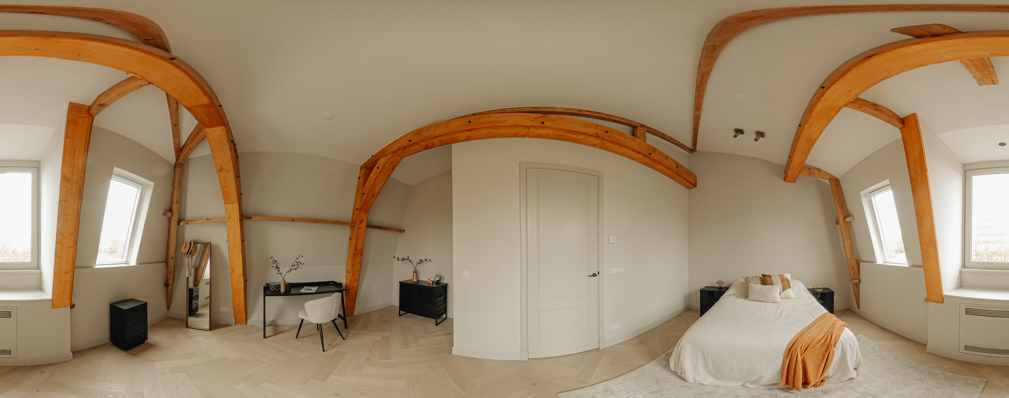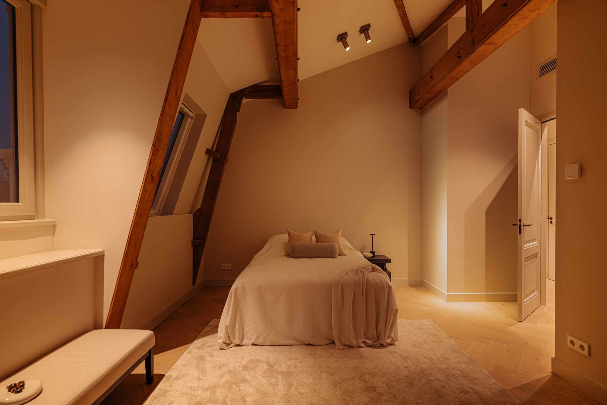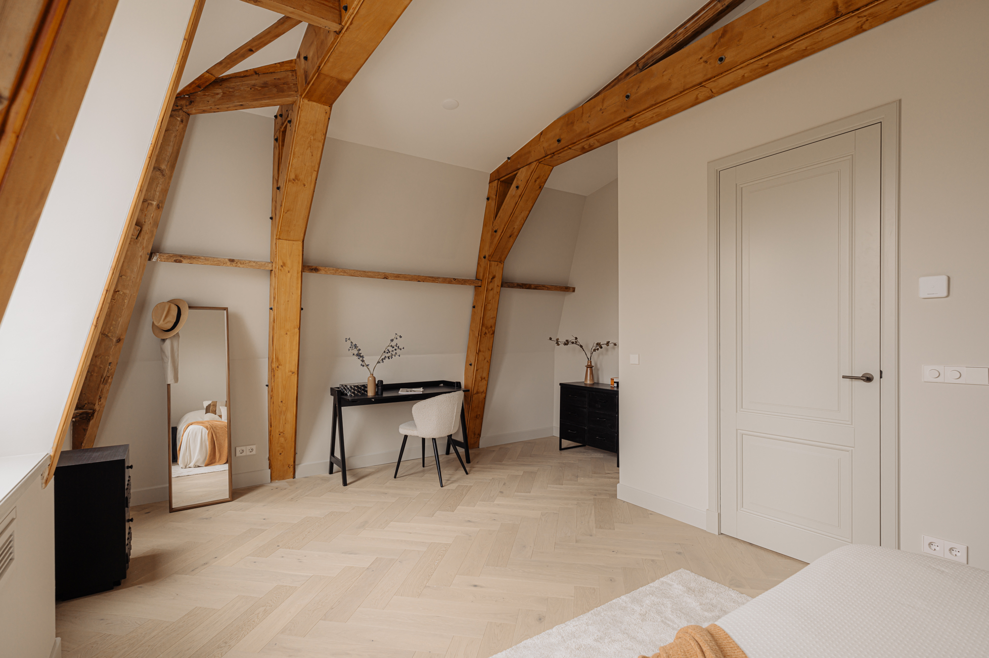De slaapkamers aan de achterzijde genieten van een overvloed aan natuurlijk licht en zijn beide royaal van afmeting, waardoor er eenvoudig een derde slaapkamer te realiseren is. Ook hier zijn de prachtige originele houten balken, die bijdragen aan de karakteristieke charme van de woning, volop aanwezig. De Master bedroom beschikt over een eigen en-suite badkamer, uitgerust met een dubbele wastafel, een royaal ligbad, een ruime inloopdouche en een toilet. Deze badkamer biedt alle comfort en luxe die men zich kan wensen. De tweede badkamer is eveneens elegant ingericht en voorzien van een dubbele wastafel en een inloopdouche.