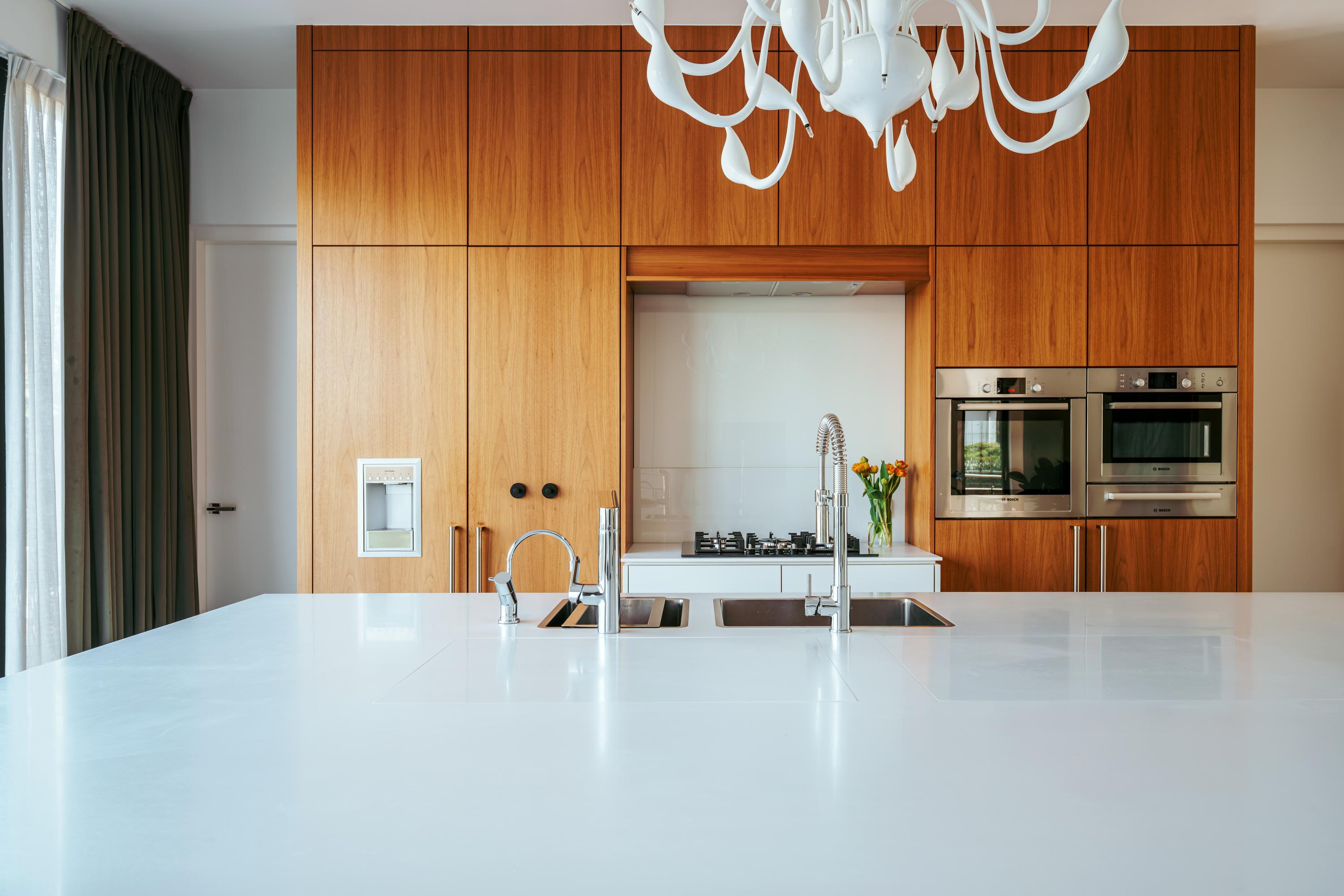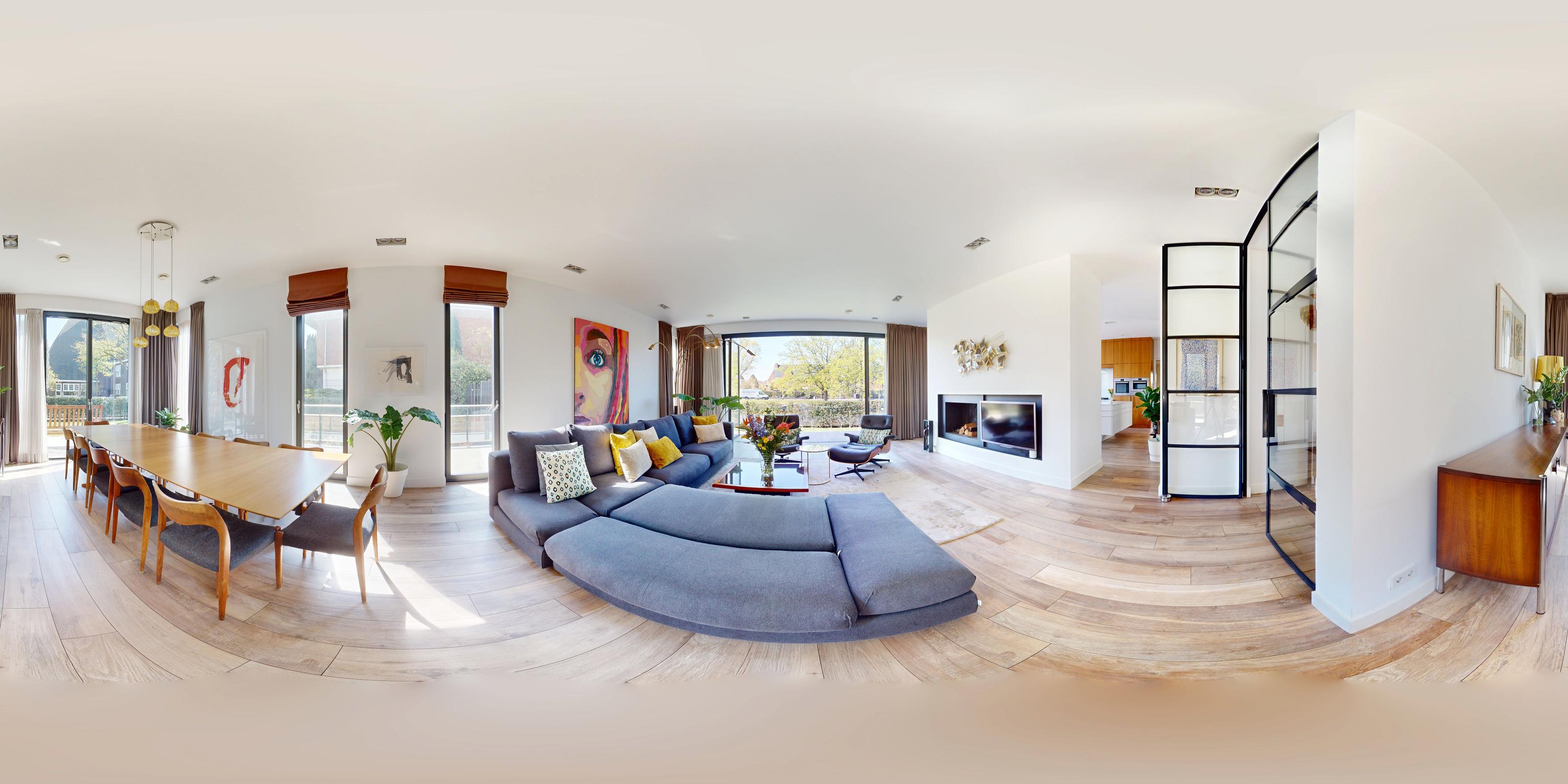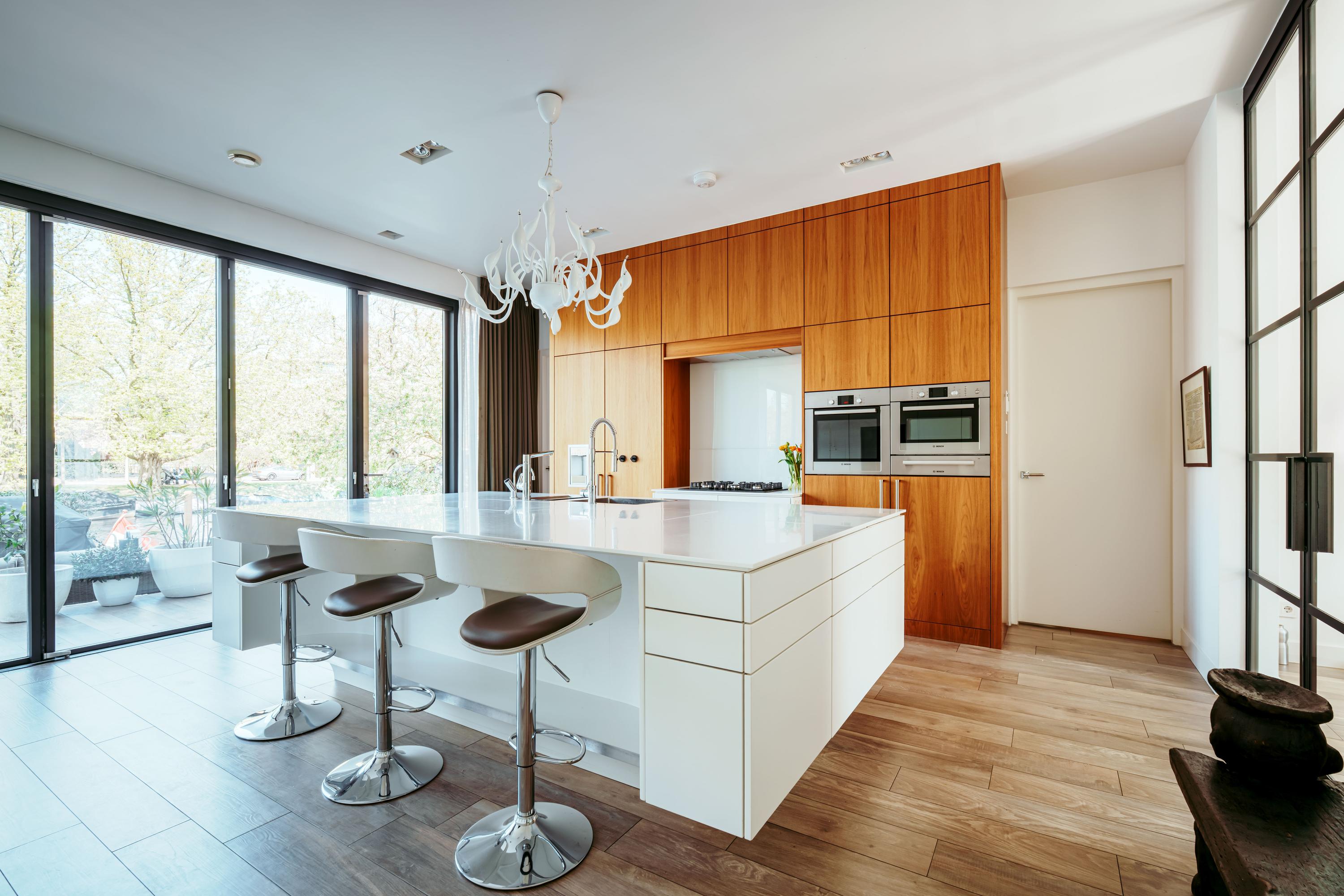 Entree; middels de hal met garderobe en separaat toilet bereikt u het leefgedeelte van de woning. Stalen deuren geven toegang tot de royale eet en woonkamer, welke is voorzien van een open haard en openslaande deuren naar zowel de voor- als achtertuin. Grote raampartijen zorgen voor een prettige lichtinval en verbinden de ruimte op natuurlijke wijze met de buitenomgeving. Grenzend aan de woonkamer bevindt zich de ruim opgezette woonkeuken. Deze is uitgerust met een centraal spoeleiland met dubbele spoelbak, dubbele vaatwasser, Quooker en een uitschuifbare pantry. Aan de overzijde bevindt zich het kookgedeelte, voorzien van een vijfpits gasfornuis, een verborgen kruidenkabinet, een royale Amerikaanse koelkast met geïntegreerde water- en ijsdispenser, en veel opbergruimte. Ook zijn er twee ovens en een warmhoudlade van Bosch ingebouwd. De keuken beschikt daarnaast over een eigen gashaard, welke samen met de open haard in de woonkamer is geïntegreerd in één dubbele wand. Openslaande deuren in de keuken bieden toegang tot de achtertuin met aanlegsteiger, geschikt voor het aanmeren van een boot.