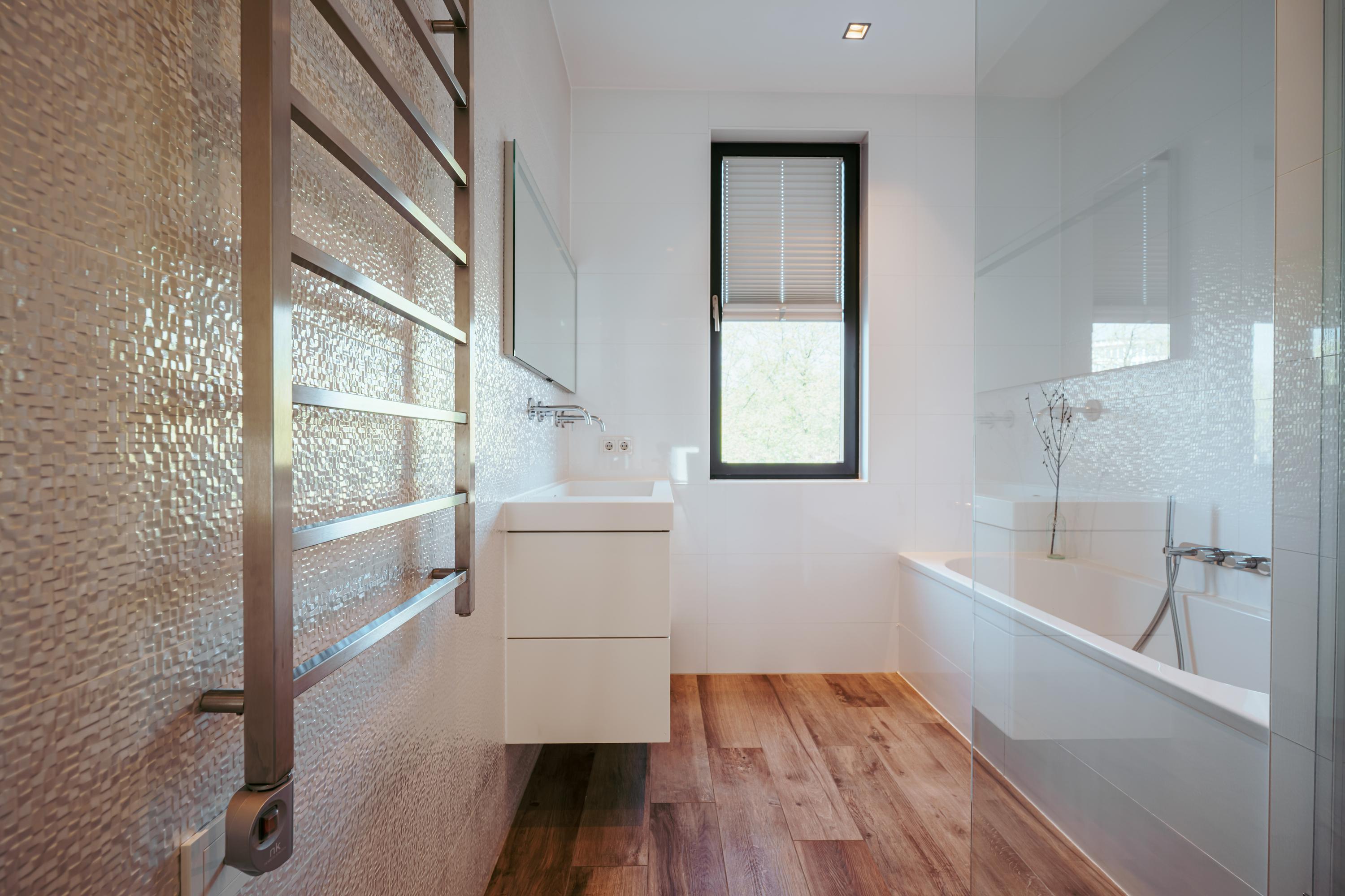 Aangrenzend aan de keuken ligt de bijkeuken met extra opslagruimte, welke doorloopt naar een complete badkamer voorzien van een inloopdouche en wastafel. Vanuit deze ruimte heeft u binnendoor toegang tot de ruime garage, geschikt voor fietsen, berging of werkruimte. Aan de achterzijde van de woning bevindt zich een werkkamer met zicht op de tuin. Aan de rechterzijde ligt een multifunctionele kamer, momenteel ingericht als gym, welke afsluitbaar is middels stalen schuifdeuren.