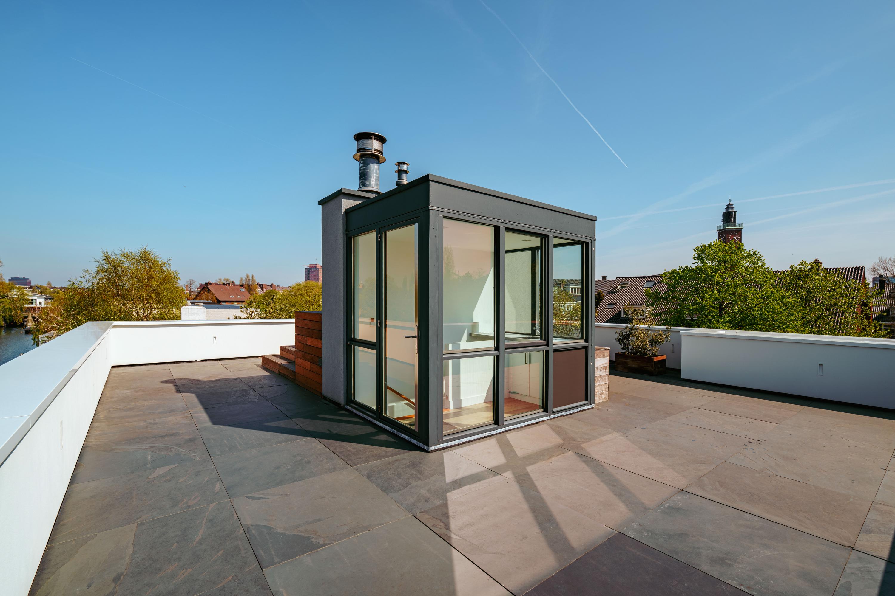 - Groot dakterras van ca. 105 m² met ingebouwde jacuzzi en 360° uitzicht over Amsterdam-Zuid;