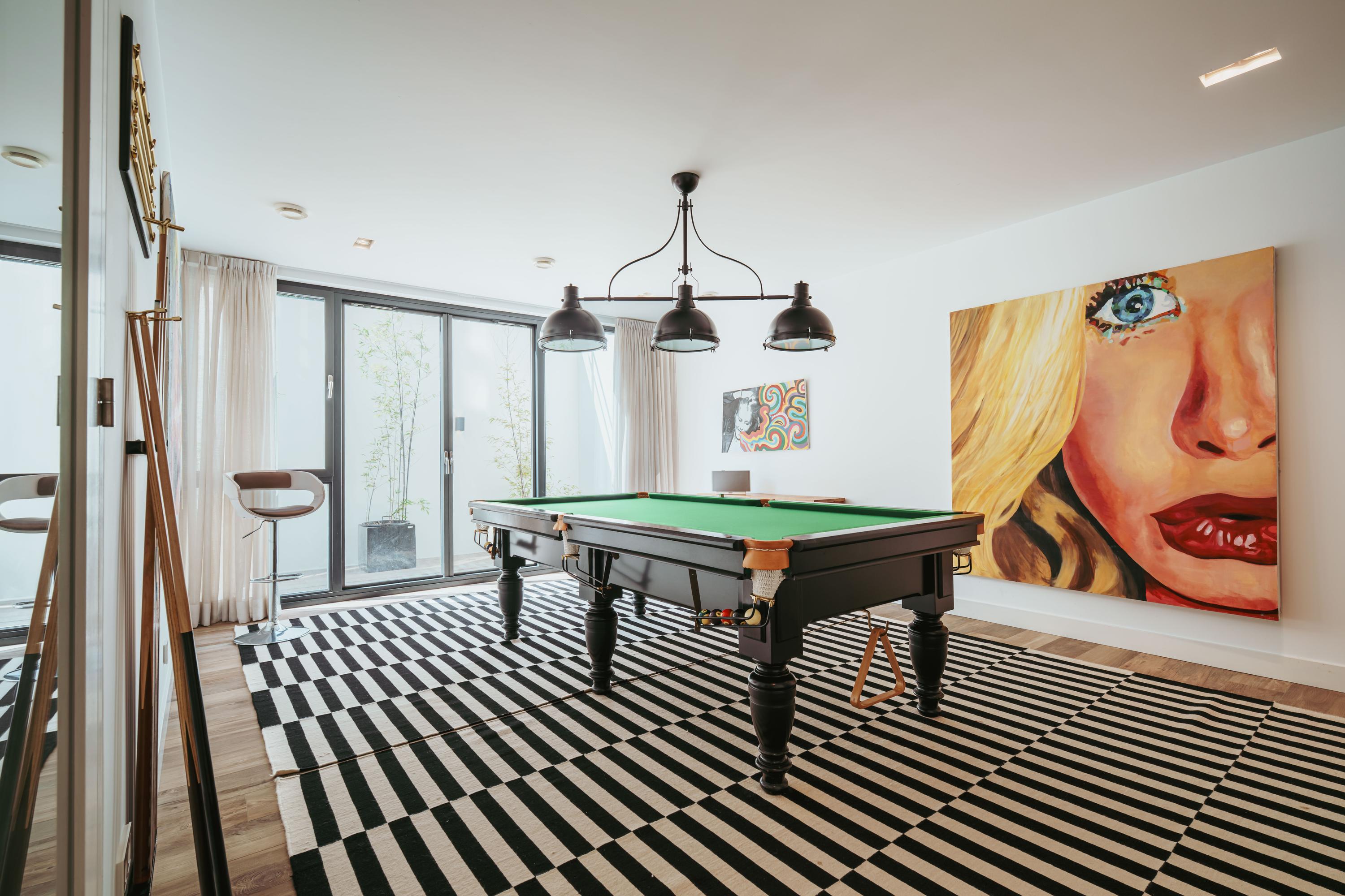 - Souterrain met hoge plafonds, royale bergruimte, thuisbioscoop en bar;