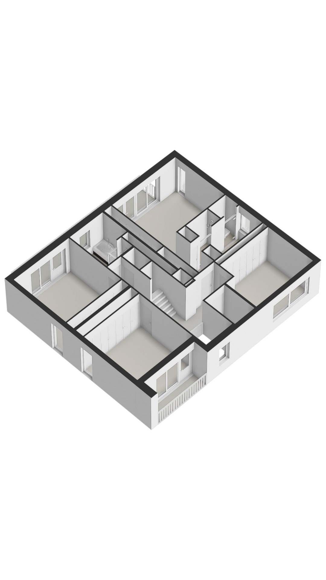 De trap leidt naar een ruime overloop met toegang tot vier slaapkamers, twee badkamers en een separaat toilet. De master bedroom bevindt zich aan de achterzijde en beschikt over een royale inbouwkast en openslaande deuren naar een balkon. Tevens is er een en suite badkamer voorzien van ligbad, inloopdouche, dubbele wastafel met meubel en een afsluitbaar toilet. Twee andere slaapkamers op deze verdieping hebben elk hun eigen balkon, aan respectievelijk de voor- en achterzijde van de woning. De vierde slaapkamer — momenteel ingericht als logeerkamer — ligt aan de voorzijde en beschikt niet over buitenruimte. De tweede badkamer is centraal gesitueerd en voorzien van een inloopdouche, ligbad en dubbele wastafel met meubel.
