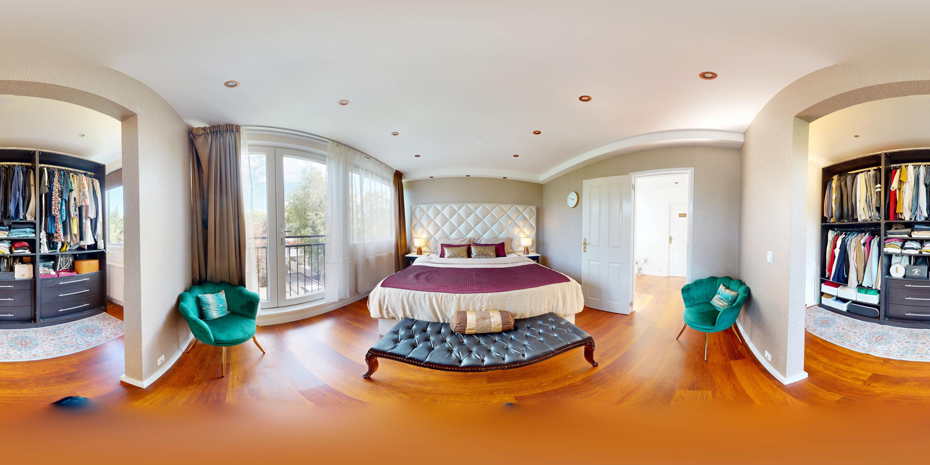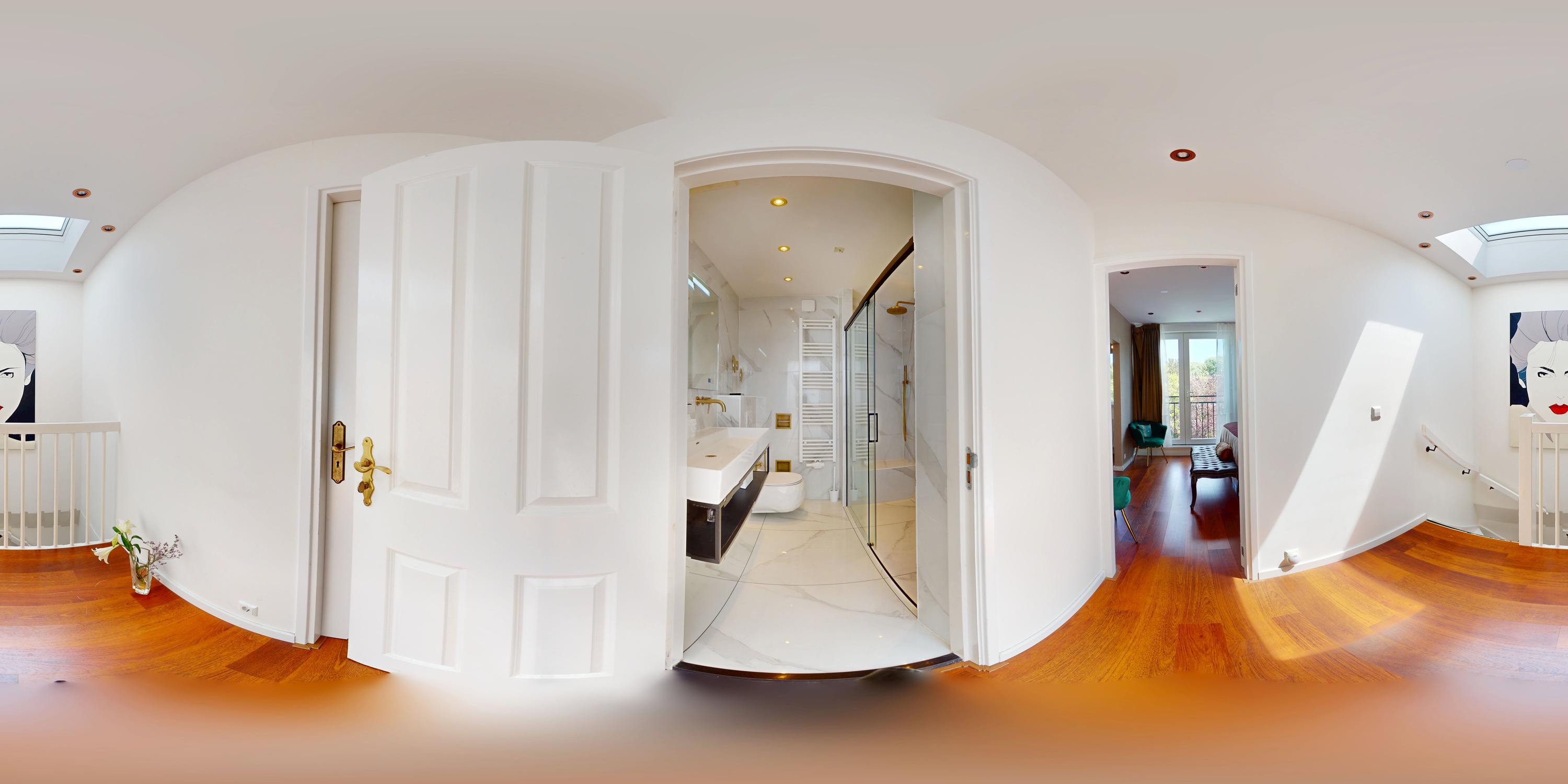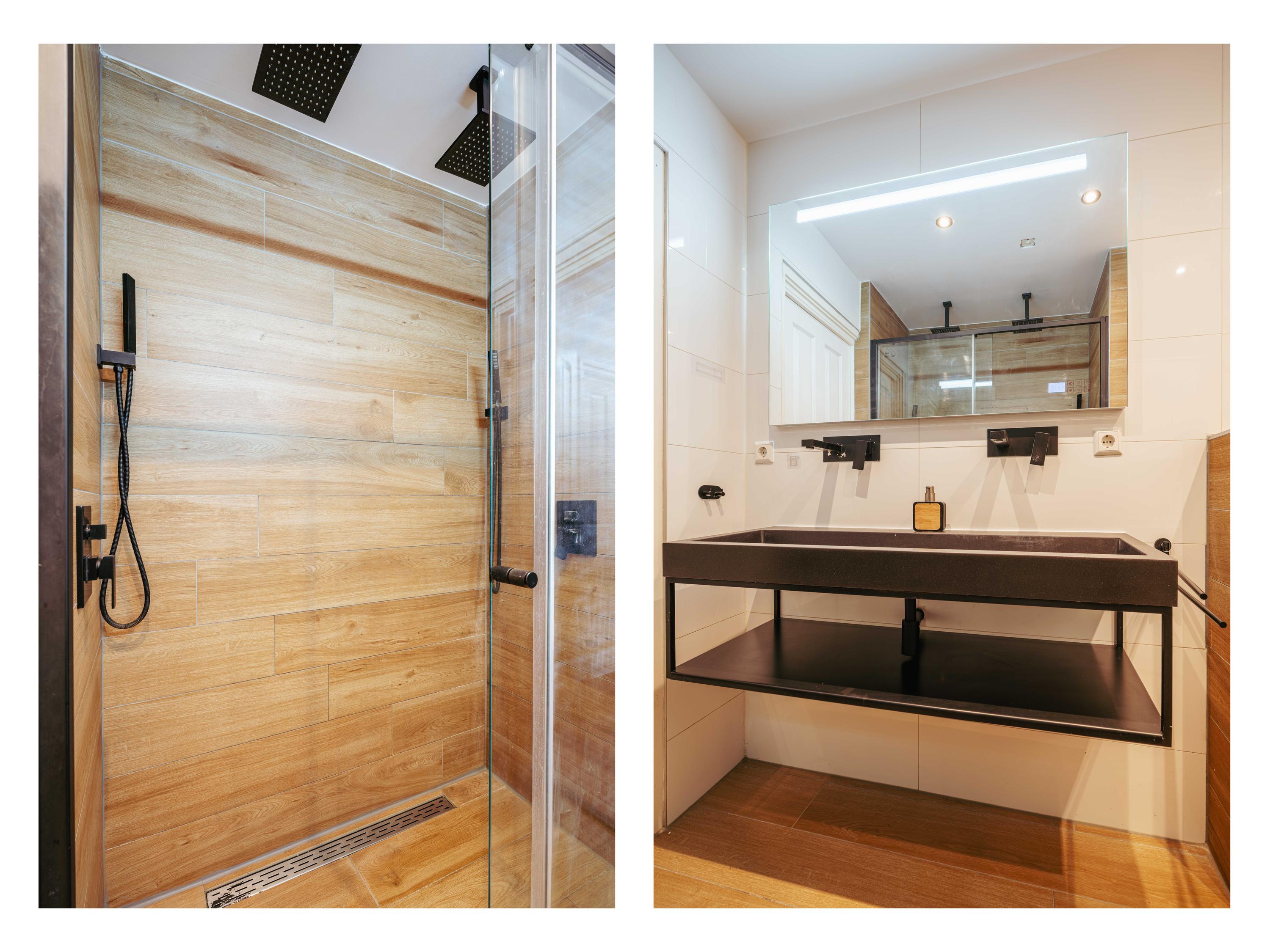 Op de bovenste verdieping bevinden zich nog eens twee royale slaapkamers, eveneens verdeeld over de voor- en achterzijde. De tweede badkamer is centraal geplaatst en uitgerust met een dubbele wastafel met meubel, een dubbele regendouche en een toilet – ideaal voor grotere gezinnen of gasten.