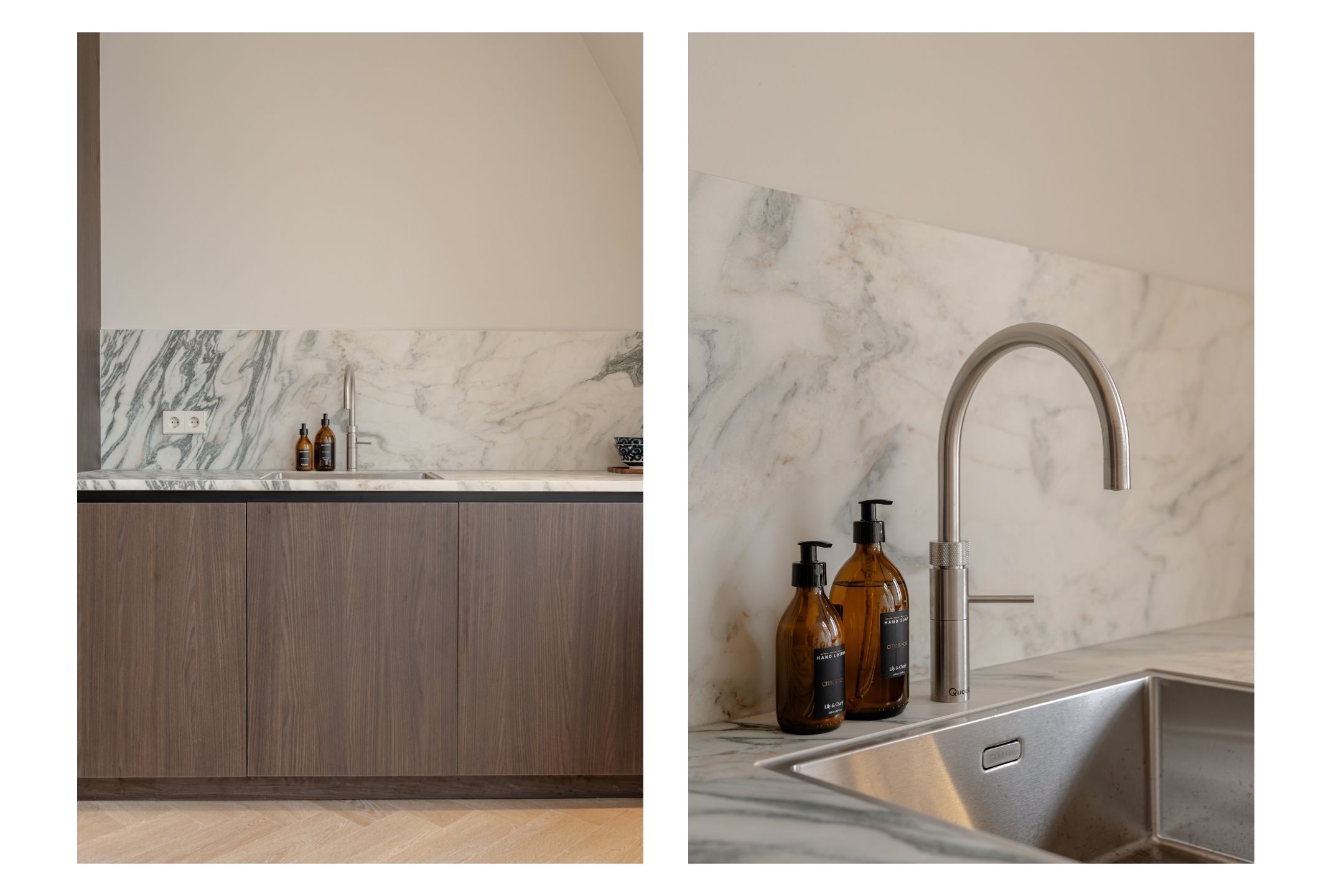 Dit luxe appartement is gelegen op de vierde verdieping en wordt gekenmerkt door een ruimtelijke en lichte opzet met hoge plafonds en opvallende, schuin geplaatste dakramen aan de achterzijde. Deze grote raampartijen geven de woning een uitgesproken karakter en zorgen gedurende de dag voor een uitzonderlijke lichtinval en een vrij, groen uitzicht over de stad. De woonkamer en keuken bevinden zich aan de achterzijde van het appartement en vormen samen één royale leefruimte. De bijzondere dakconstructie in combinatie met de grote dakramen creëert een open en architectonisch interessant geheel, met volop daglicht en fraaie zichtlijnen. Er is ruim voldoende plaats voor zowel een comfortabele zithoek als een royale eettafel. De luxe keuken is strak en tijdloos uitgevoerd en sluit naadloos aan op de leefruimte. De keuken is voorzien van een inductiekookplaat, spoelbak met Quooker, combi-oven, klimaatkast, vaatwasser separate koelkast en vriezer, en beschikt daarnaast over veel werk- en bergruimte. Aan de voorzijde van het appartement bevinden zich twee slaapkamers, beide van goed formaat en rustig gelegen. De master bedroom beschikt over een ensuite badkamer, welke is voorzien van een inloopdouche en een dubbele wastafel met meubel. Centraal op de overloop bevindt zich de tweede badkamer, uitgerust met een inloopdouche en een wastafel met meubel. Daarnaast is er een separaat toilet en praktische kastruimte aanwezig. Via de interne trap is het dakterras bereikbaar. Dit royale dakterras biedt veel privacy en is voorbereid op het plaatsen van een jacuzzi (constructief en dubbele groep elektra). Aansluitend zijn er voorzieningen getroffen voor een buitendouche (waterleiding). Tevens is er een voorbereiding aangebracht voor het realiseren van een buitenkeuken (water- en elektra-aansluiting), waardoor deze buitenruimte een volwaardige aanvulling vormt op het wooncomfort.