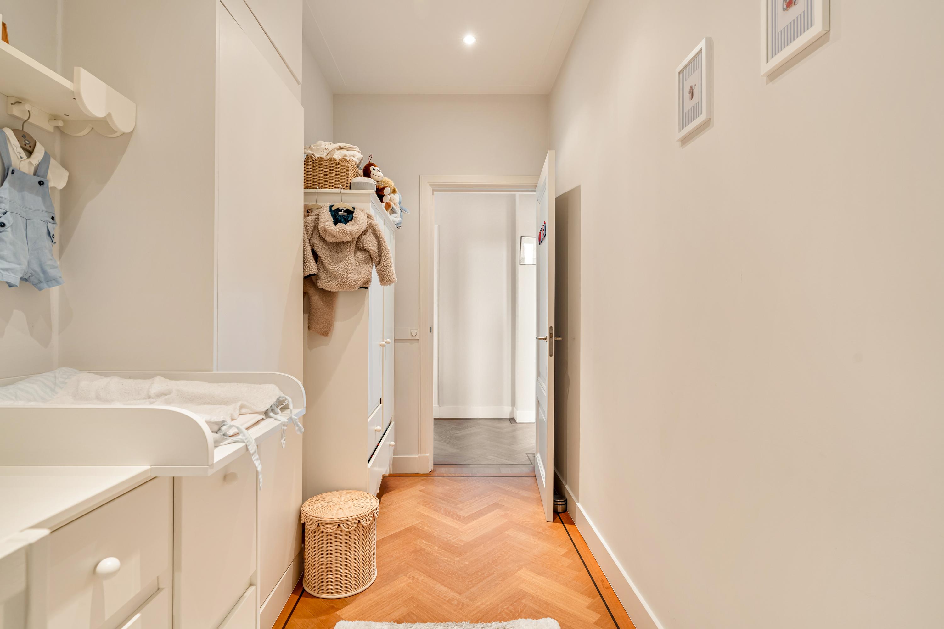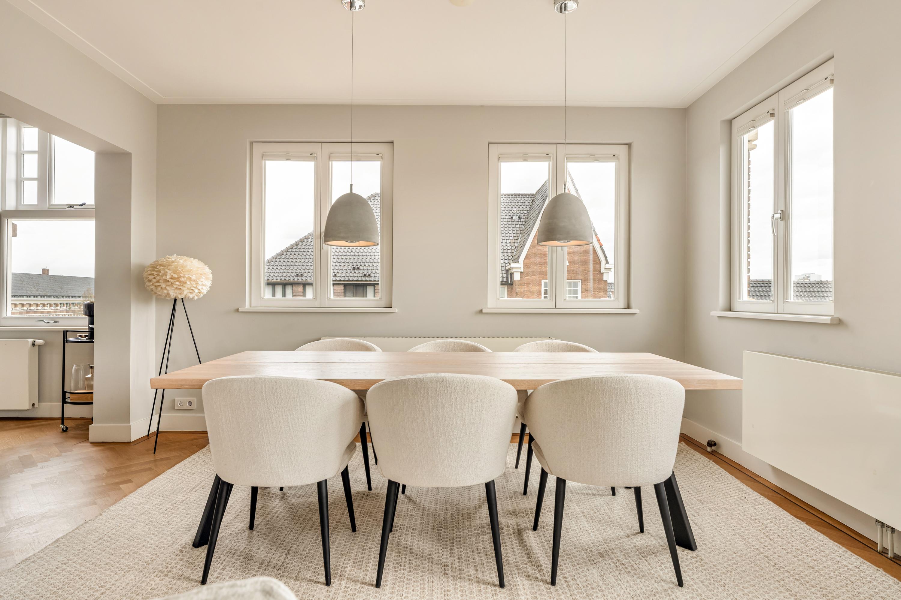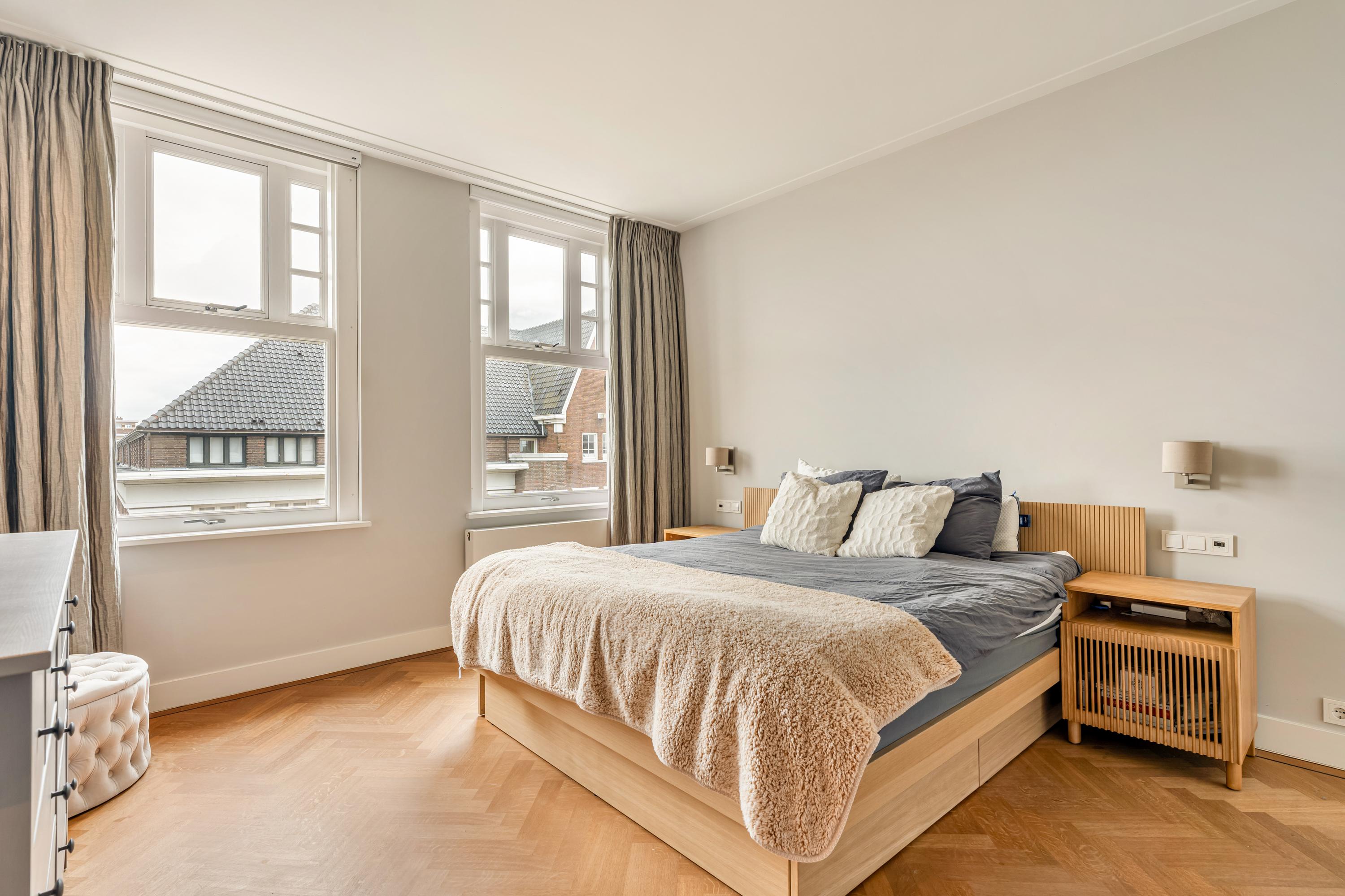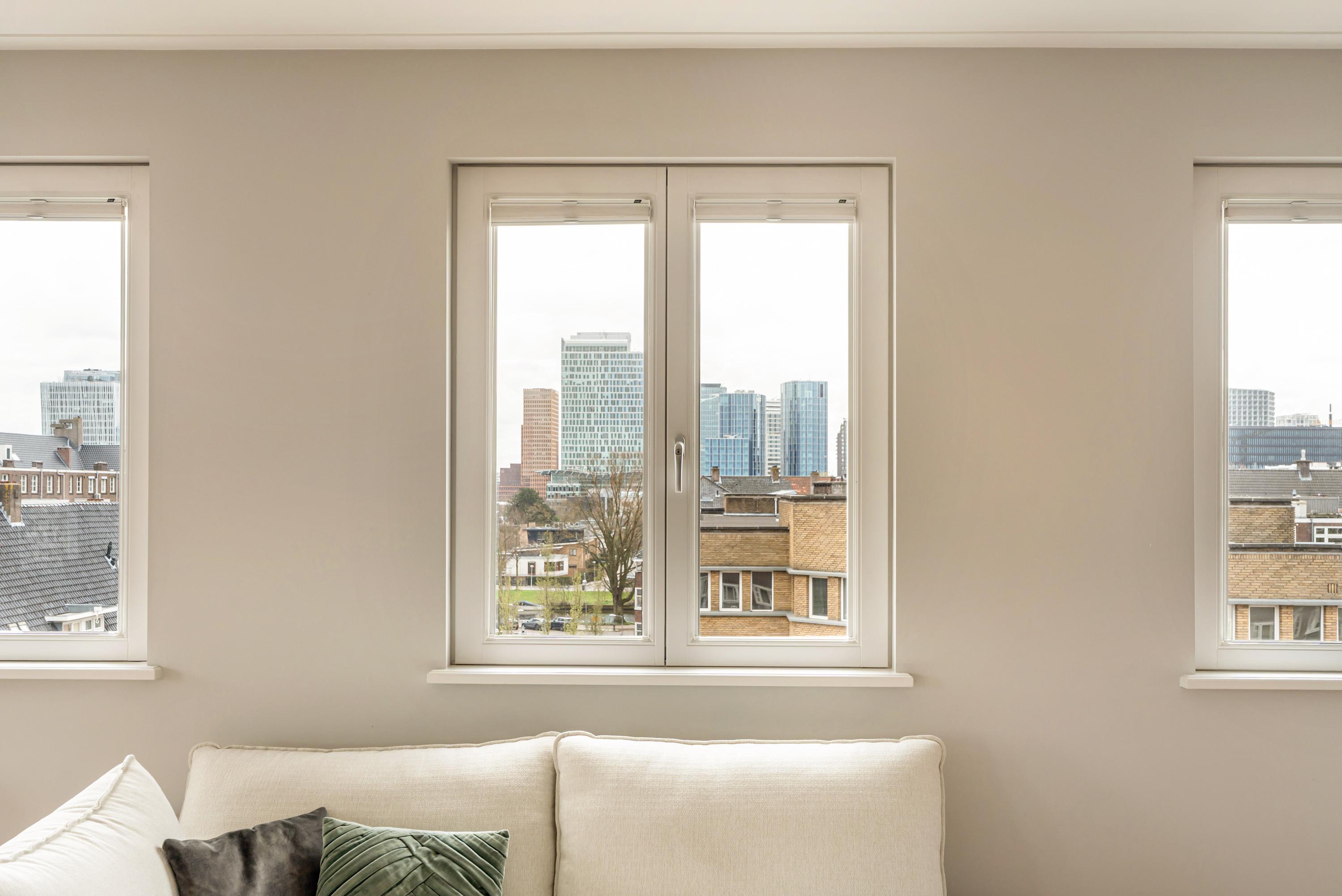 Het appartement is afgewerkt met een fraaie houten visgraatvloer en alle kozijnen zijn vernieuwd en uitgevoerd in hardhout met HR++ beglazing, waarbij het karakteristieke schuifraamsysteem is behouden en gemoderniseerd.