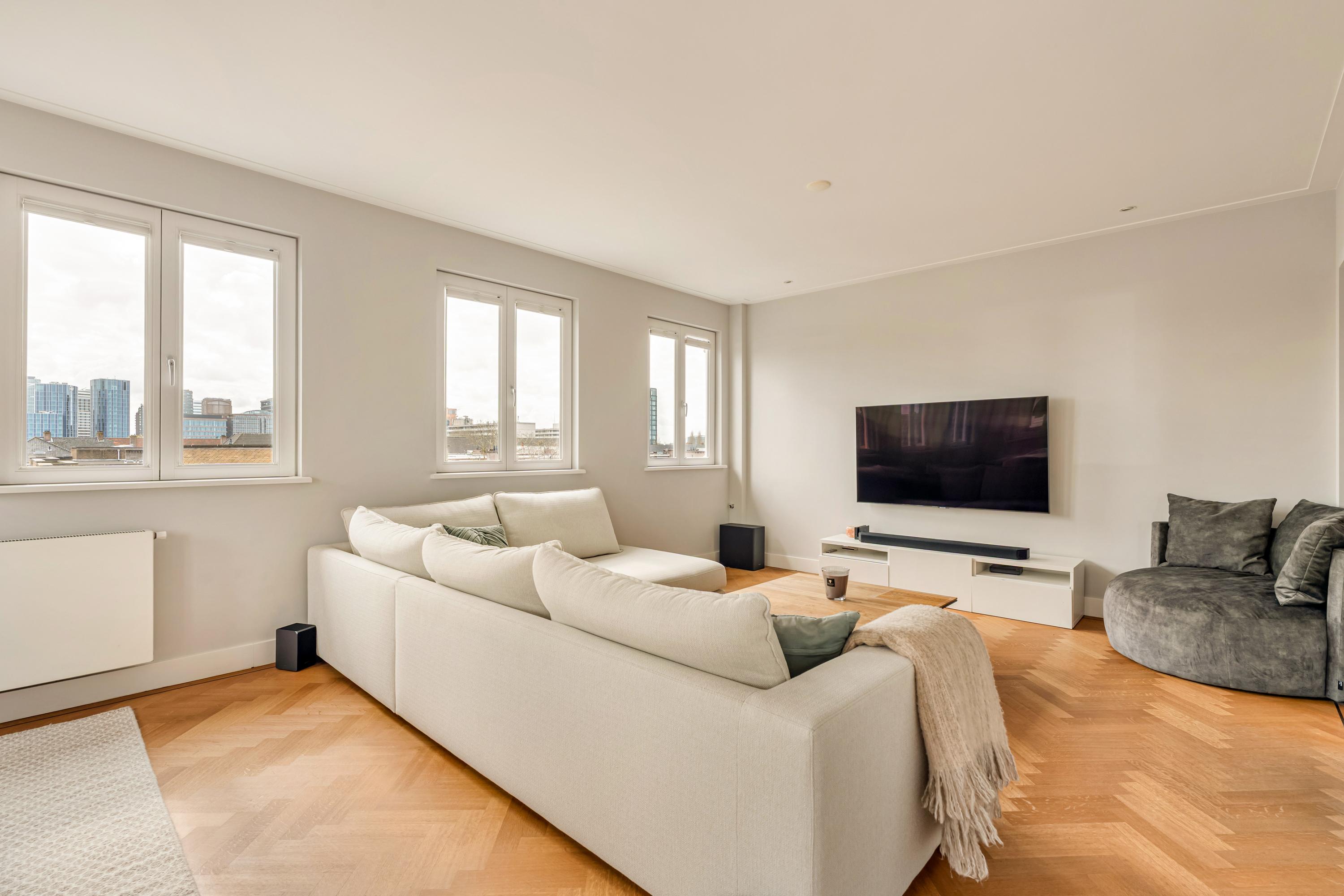 De aangrenzende woonkamer profiteert optimaal van de hoekligging en is dankzij maar liefst acht raampartijen uitzonderlijk licht. Het vrije uitzicht over het Minervaplein, de Michelangelostraat en de skyline van de Zuidas is indrukwekkend en met name in de avond bijzonder sfeervol.