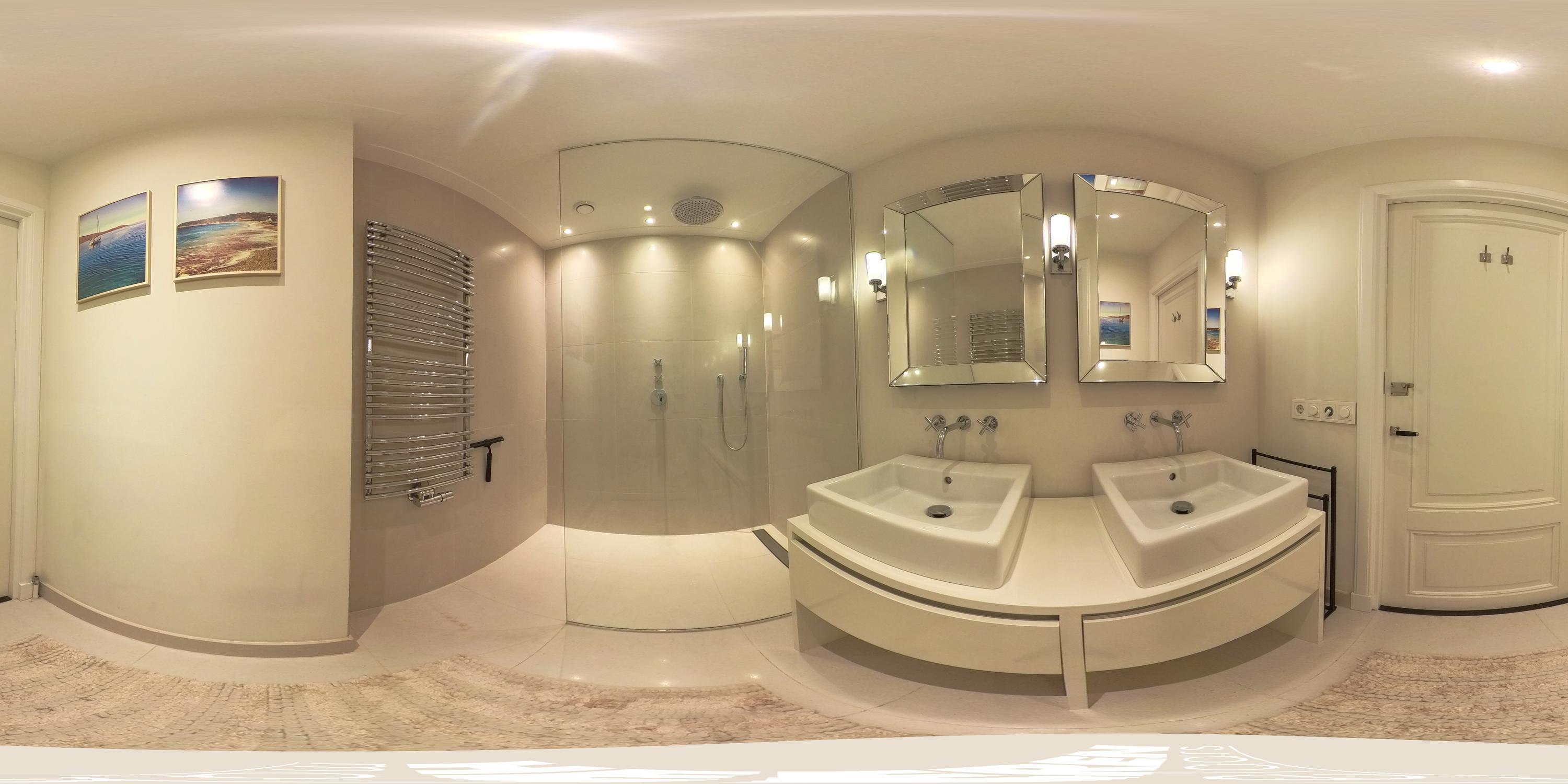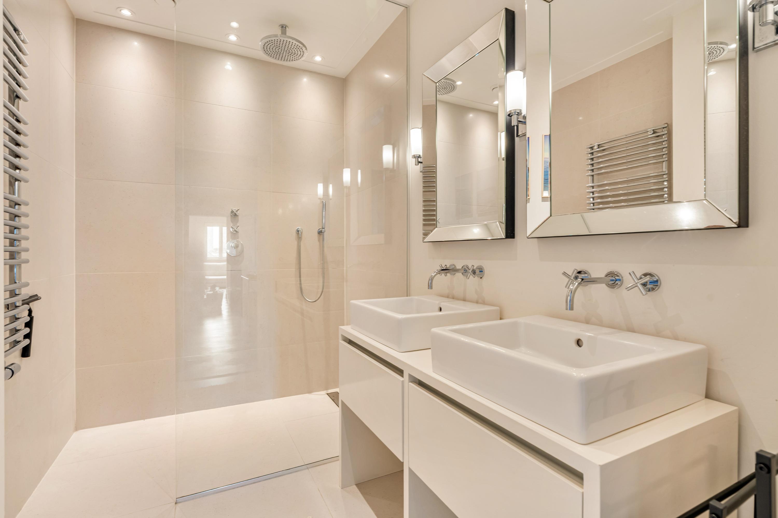 De verzorgde badkamer is voorzien van een inloop regendouche, dubbele wastafel met meubel en vloerverwarming.