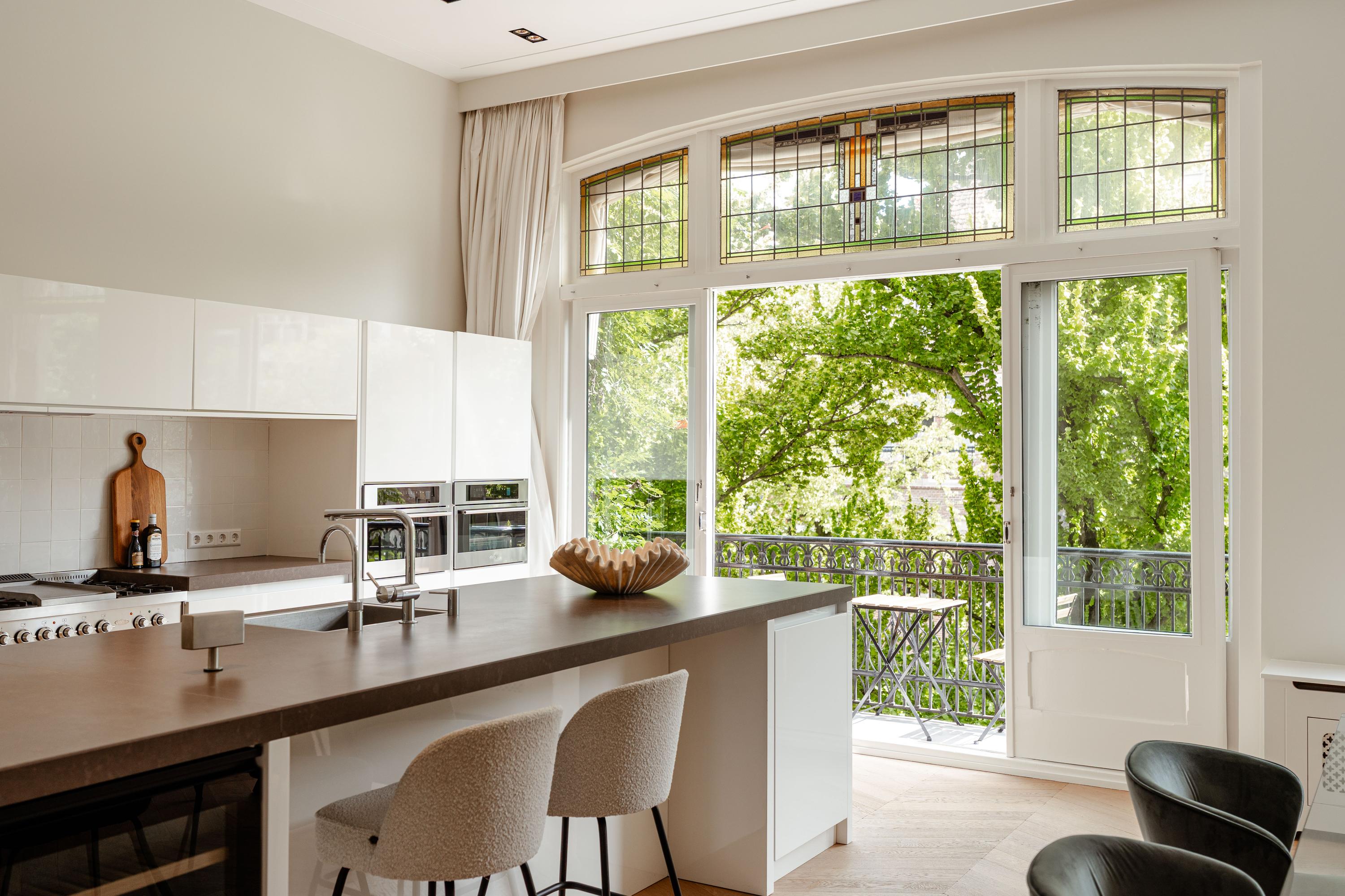 Middels de lift of de eigen entree op de eerste verdieping bereikt u de indrukwekkende leefverdieping. Hier valt direct de royale woonkamer op, met grote raampartijen welke zorgen voor een overvloed aan licht en een verfijnde sfeer. Aan de voorzijde bevindt zich de luxe woonkeuken, een absolute eyecatcher, voorzien van een royaal kookeiland met wijnklimaatkast, dubbele spoelbak met Quooker en hoogwaardige inbouwapparatuur: twee ovens, een volledige koelkast en een aparte vriezer. Deze keuken biedt alles voor de echte culinaire liefhebber en vormt het hart van de woning. Vanuit hier heeft u toegang tot het balkon met karakteristieke glas-in-loodramen, ideaal voor een ontspannen ontbijt in de ochtendzon. Op deze verdieping zijn tevens een garderoberuimte en separaat toilet te vinden.