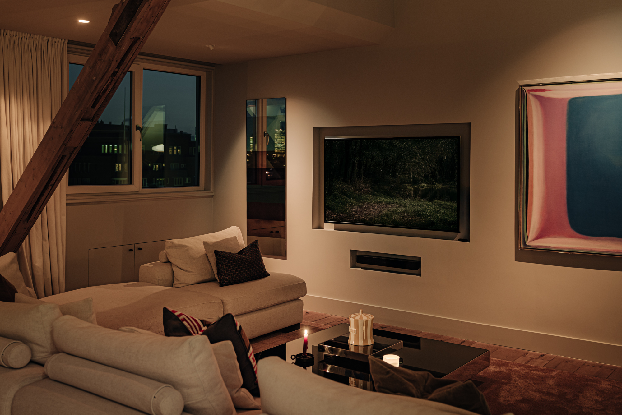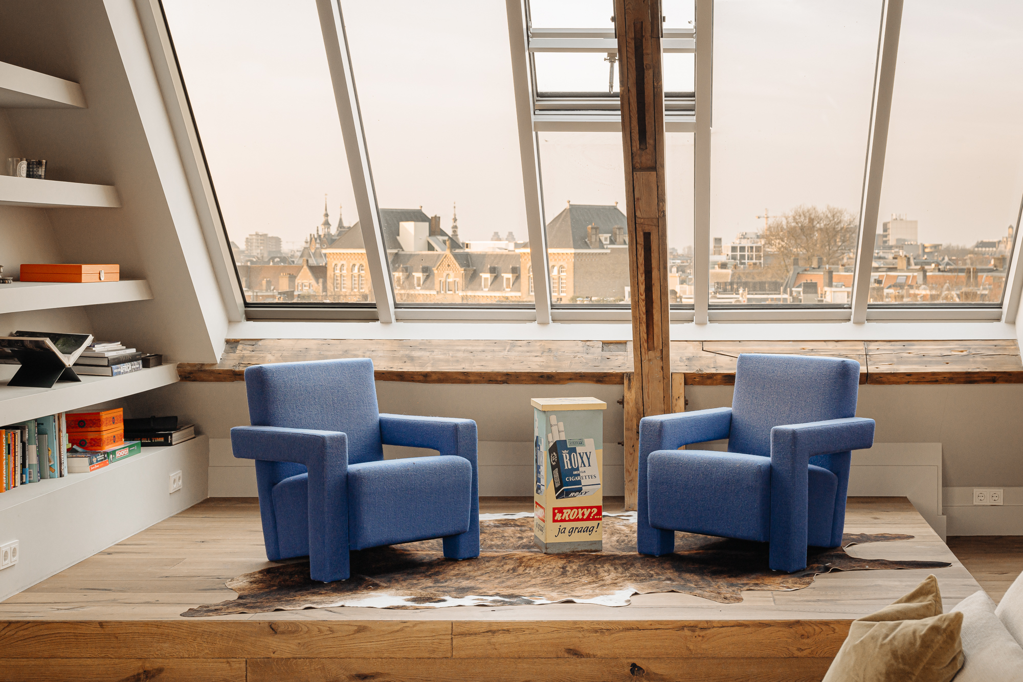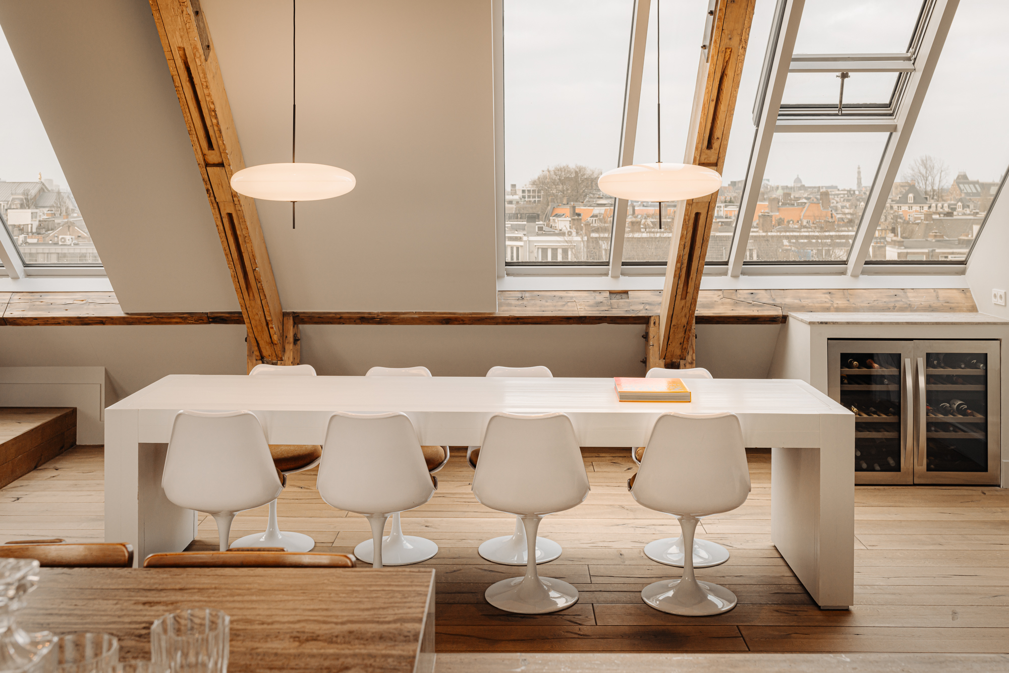 Bij binnenkomst valt direct de ruimtelijke en lichte opzet van de woning op. De woonkamer beschikt over een gezellig balkon gelegen op het zuiden en grote raampartijen aan weerszijden, die zorgen voor veel daglicht en een weids uitzicht over de stad. De zichtbare houten balken geven de ruimte karakter, terwijl het verhoogde zitgedeelte een prettige plek biedt om te ontspannen. Een airco installatie bevindt zich boven de keuken, die is voorzien van een ruim kookeiland met een natuurstenen werkblad en hoogwaardige inbouwapparatuur zoals een 4-pits inductie met afzuiger, een vaatwasser, koel- en vriescombinatie en tot slot een Quooker en een ingebouwde wijnklimaatkast. Een fraai verhoogd bargedeelte bevindt zich haaks aan het kookeiland. De eetruimte biedt plaats aan een grote eettafel die middels de grote raampartijen wederom mooi in het daglicht staat.