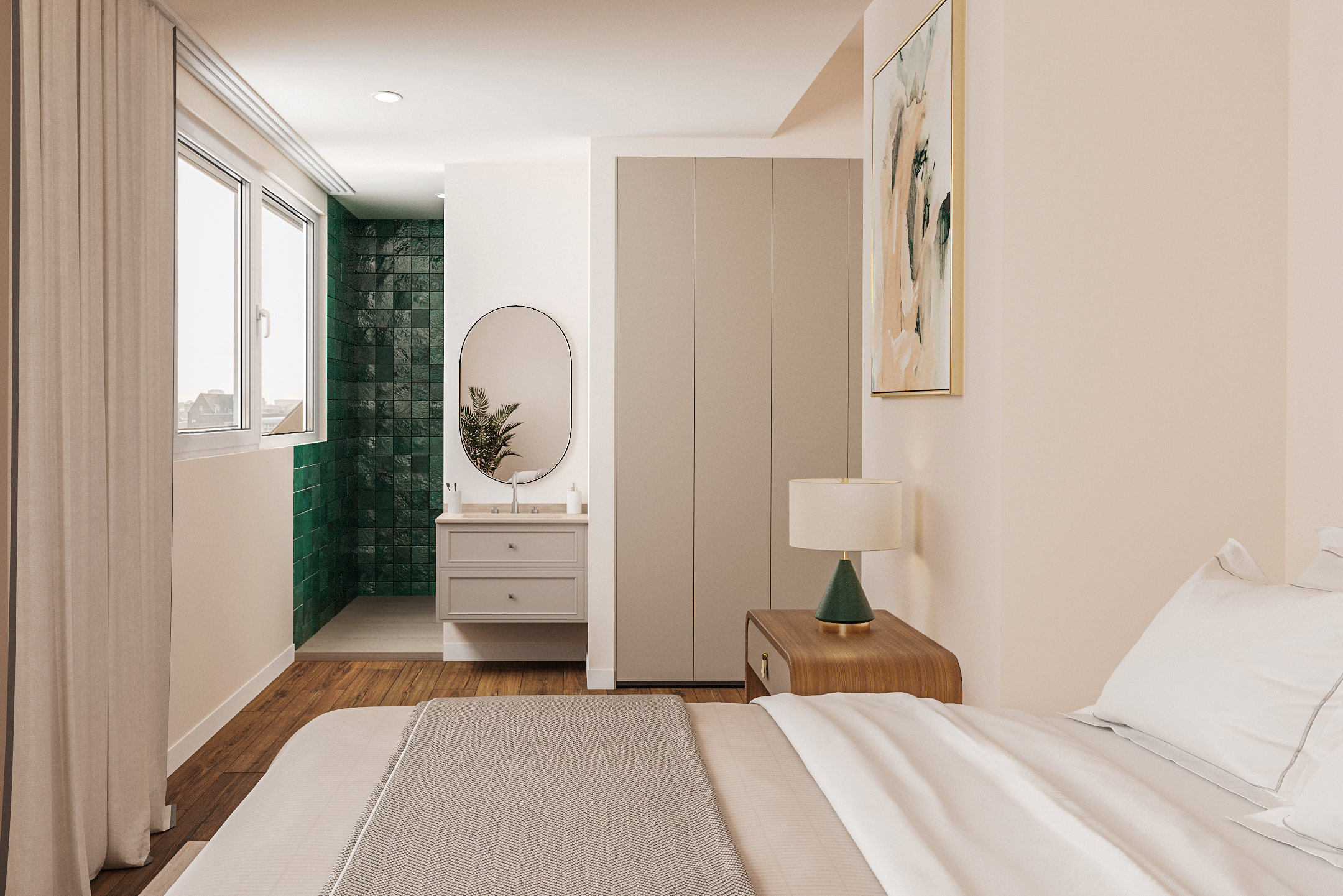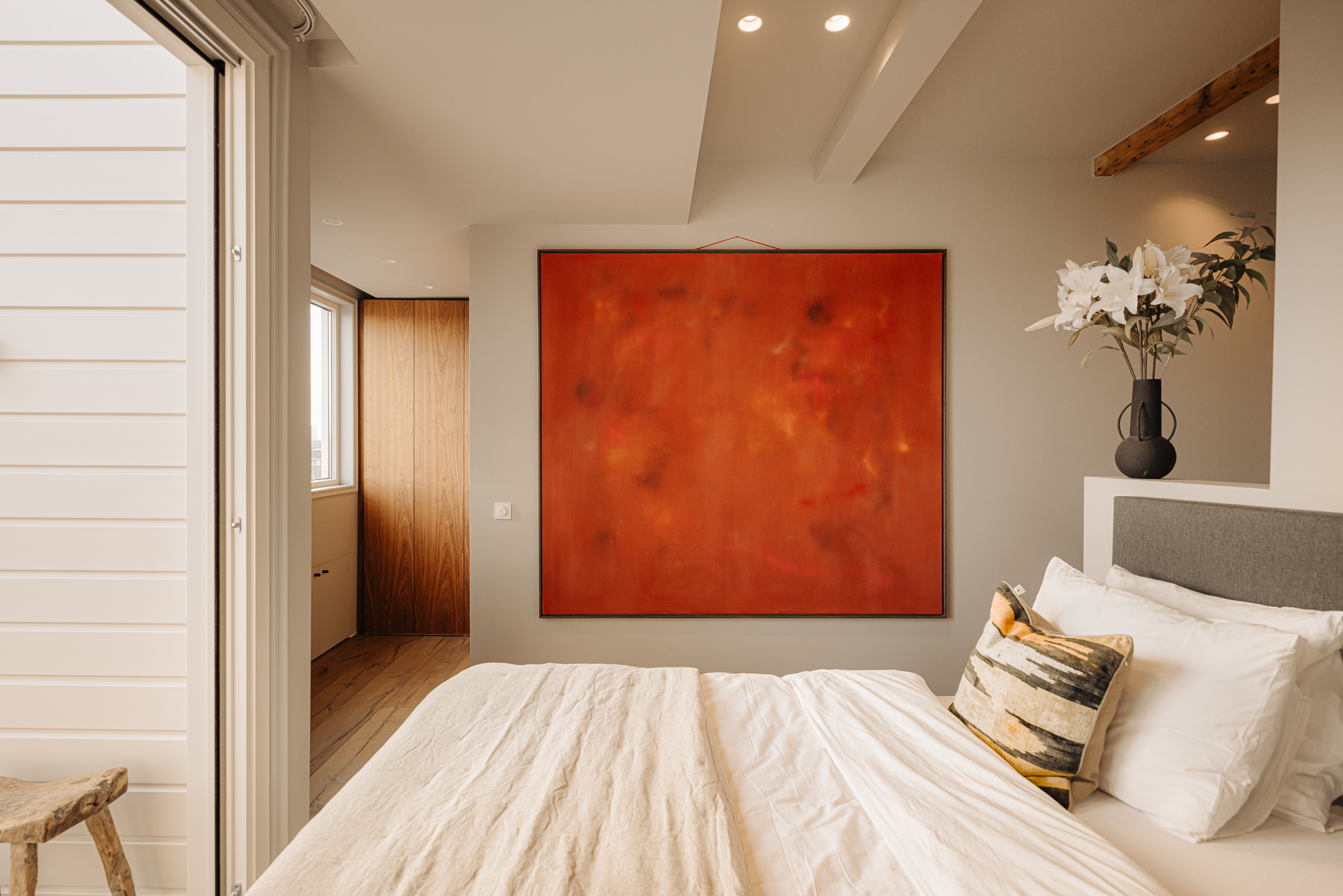 Het penthouse beschikt over drie ruime slaapkamers, twee daarvan voorzien van op maat gemaakte inbouwkasten en een airco installatie. De master bedroom beschikt over een balkon gelegen op het zuiden en een en-suite badkamer, uitgerust met een vrijstaand bad, een inloopdouche en een dubbele wastafel met meubel. Om de hoek vindt u nog een fraaie make-up tafel en een separaat toilet met fontein.
