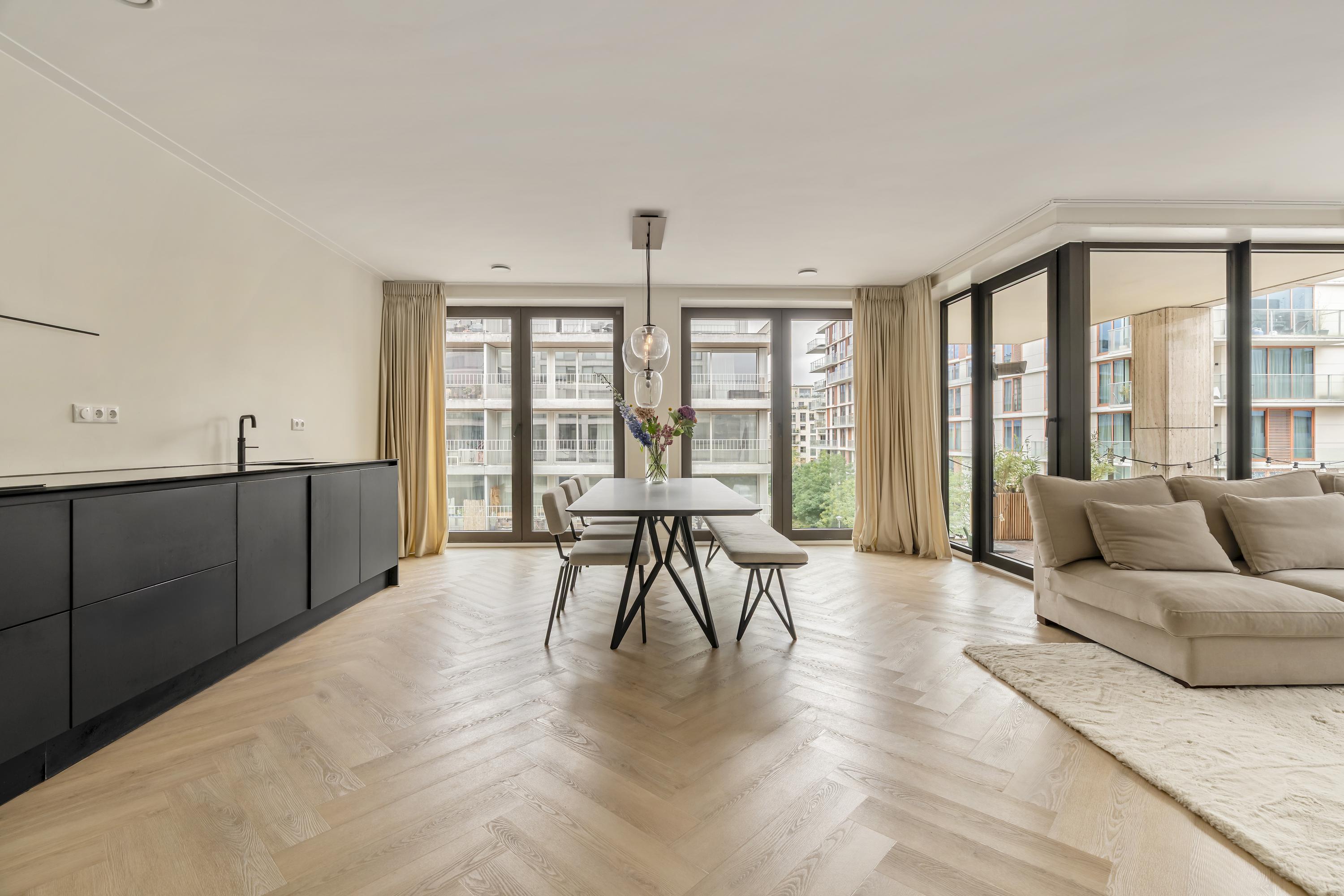 De keuken is uitgevoerd in matzwart design en voorzien van alle denkbare inbouwapparatuur, waaronder een inductiekookplaat, combi-oven, vaatwasser en een Quooker. Er is meer dan genoeg opbergruimte. Vanuit de woonkamer is er toegang tot het ruime balkon op het zuidwesten, waar u geniet van de middag/avond zon en een prachtig uitzicht op het groene plein.