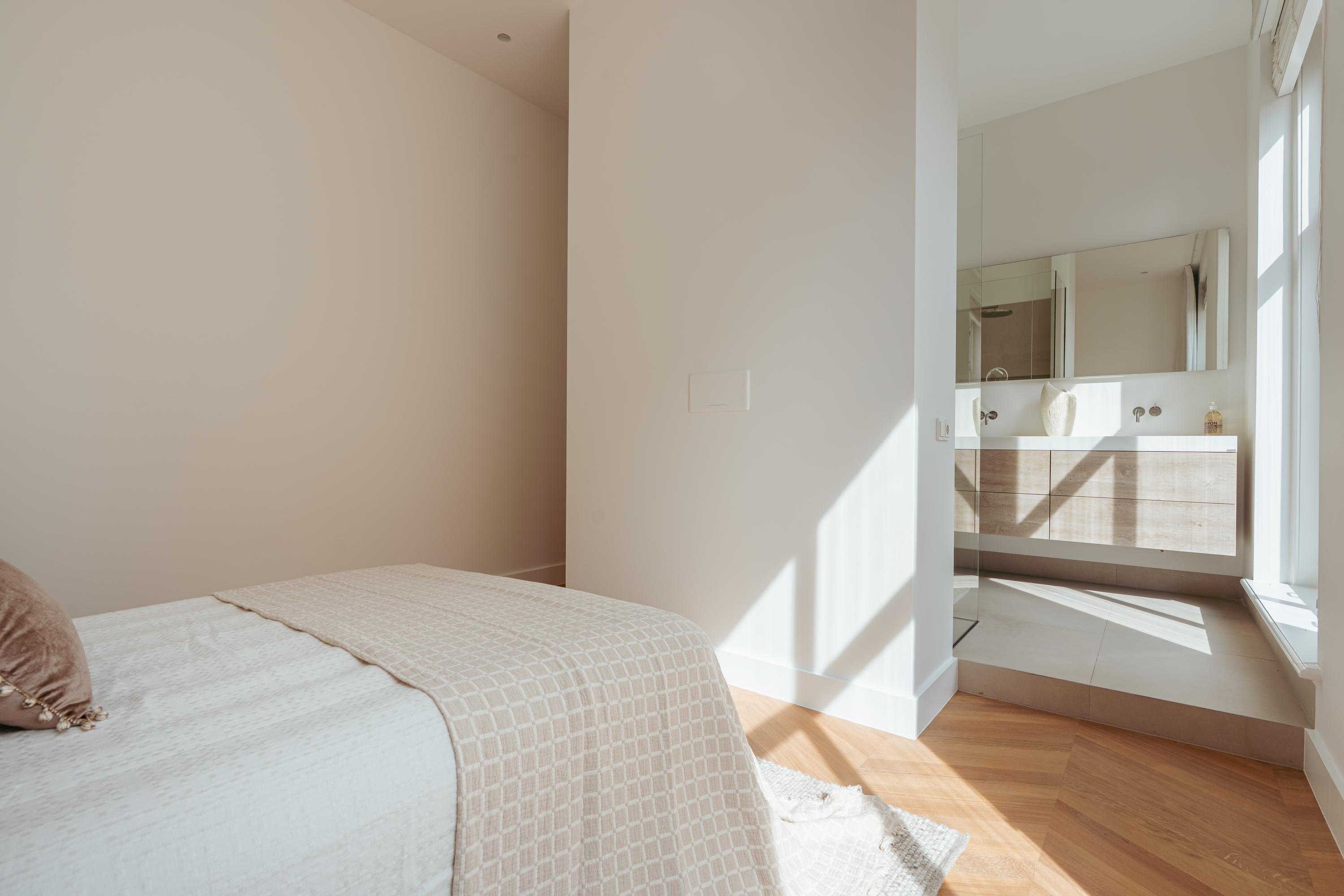 Aan weerszijden van de hal bevinden zich de twee goed bemeten slaapkamers. De master bedroom beschikt over maatwerk kastenwanden en een eigen badkamer en-suite met inloopdouche en dubbele wastafel met meubel. De tweede slaapkamer beschikt eveneens over een inbouwkast en een badkamer en-suite met inloopdouche en wastafelmeubel. Tot slot is er een separaat toilet met fonteintje en een praktische berging met aansluitingen voor wasmachine en droger.