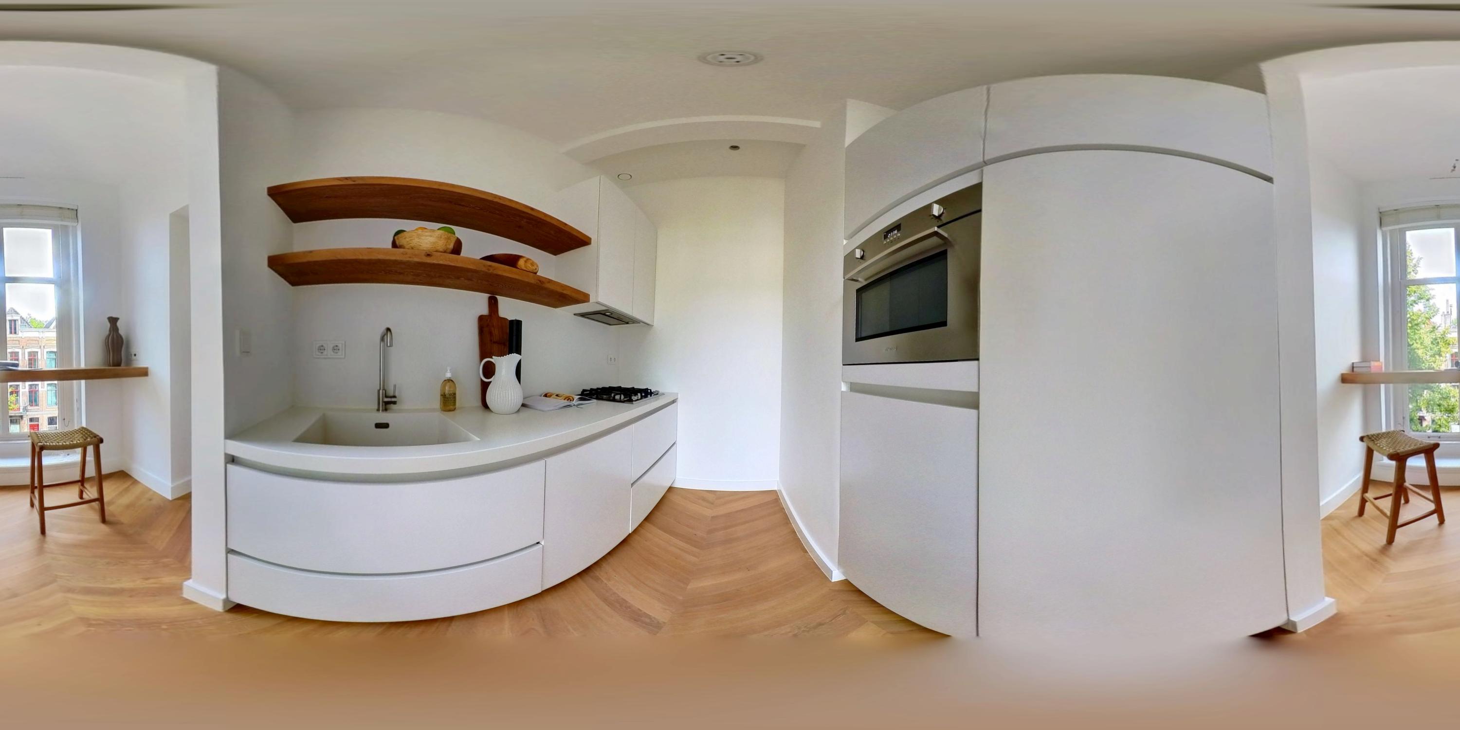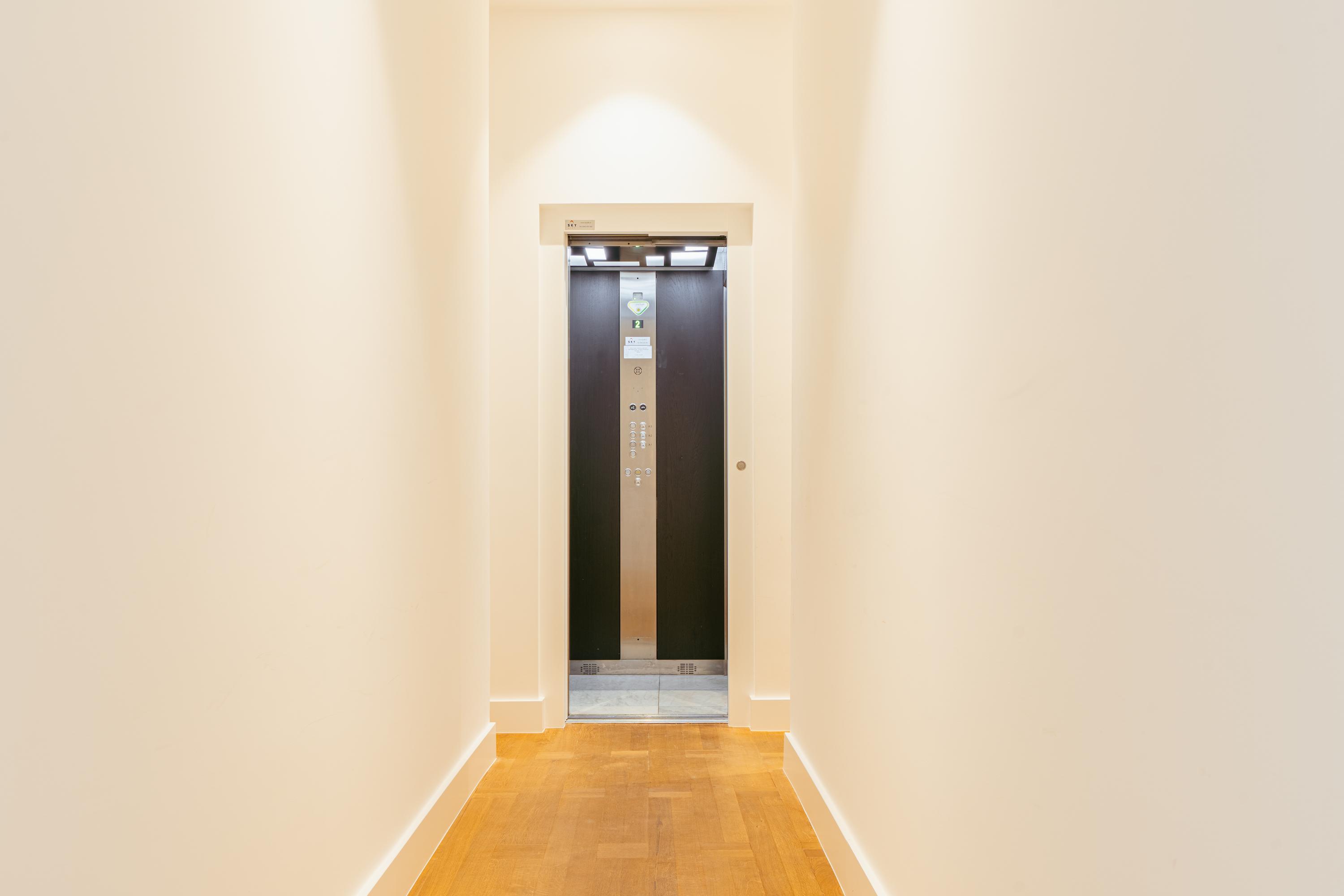 Via het nette gemeenschappelijke trappenhuis of de lift bereikt u het appartement op de tweede verdieping. Vanuit de ruime centrale hal heeft u toegang tot alle vertrekken. De royale woonkamer springt in het oog met zijn meer dan 3 meter hoge plafonds, elegante erkers en een stijlvolle haard. Aangrenzend vindt u de moderne halfopen keuken met bargedeelte en hoogwaardige inbouwapparatuur, waaronder een 4-pits gasfornuis met afzuigkap, koel- en vriescombinatie, combi-oven en vaatwasser.