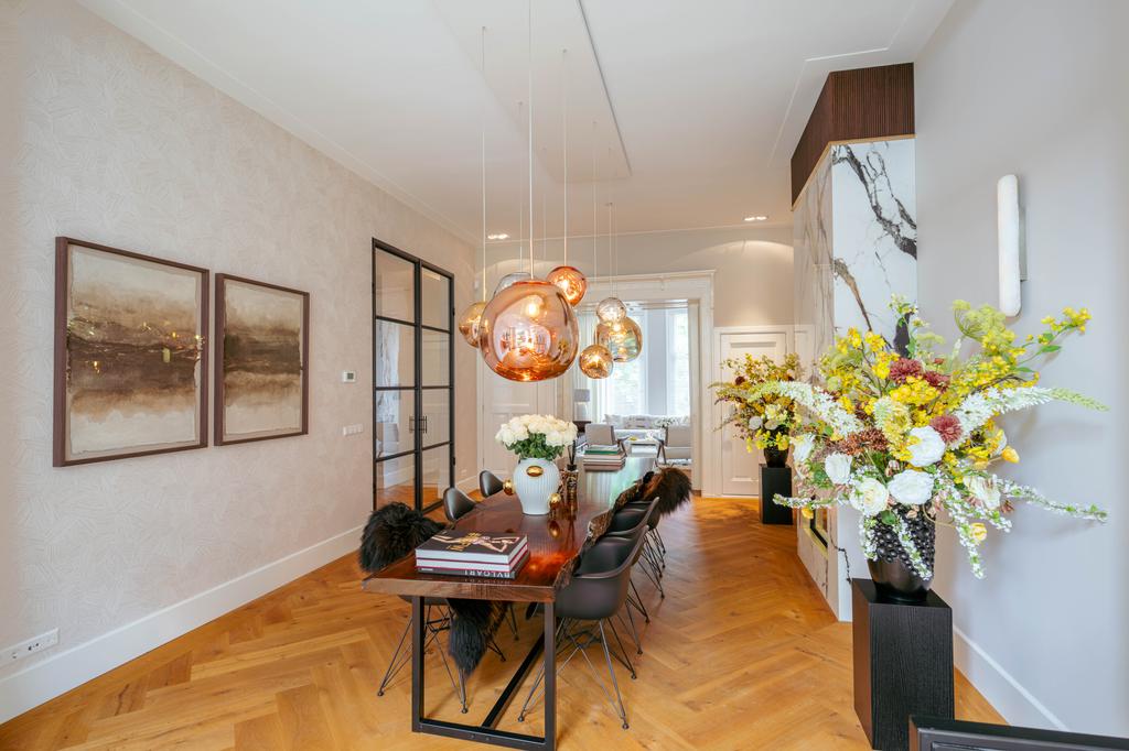 Aan de prachtige Vossiusstraat bevindt zich deze uitzonderlijk stijlvolle en royale woning van 323 m² verdeeld over drie verdiepingen en gelegen op eigen grond. Dit huis combineert klassieke elegantie met hedendaags comfort en is afgewerkt met hoogwaardige materialen, waaronder een visgraat houten vloer, stalen taatsdeuren, marmeren details en diverse gashaarden. Met zes slaapkamers, drie luxe badkamers, een riante woonkeuken, een fraai aangelegde zonnige tuin (157m²) en uitzicht over het park biedt deze woning een zeldzame combinatie van ruimte, rust en stedelijke allure – midden in het hart van Amsterdam Oud-Zuid.