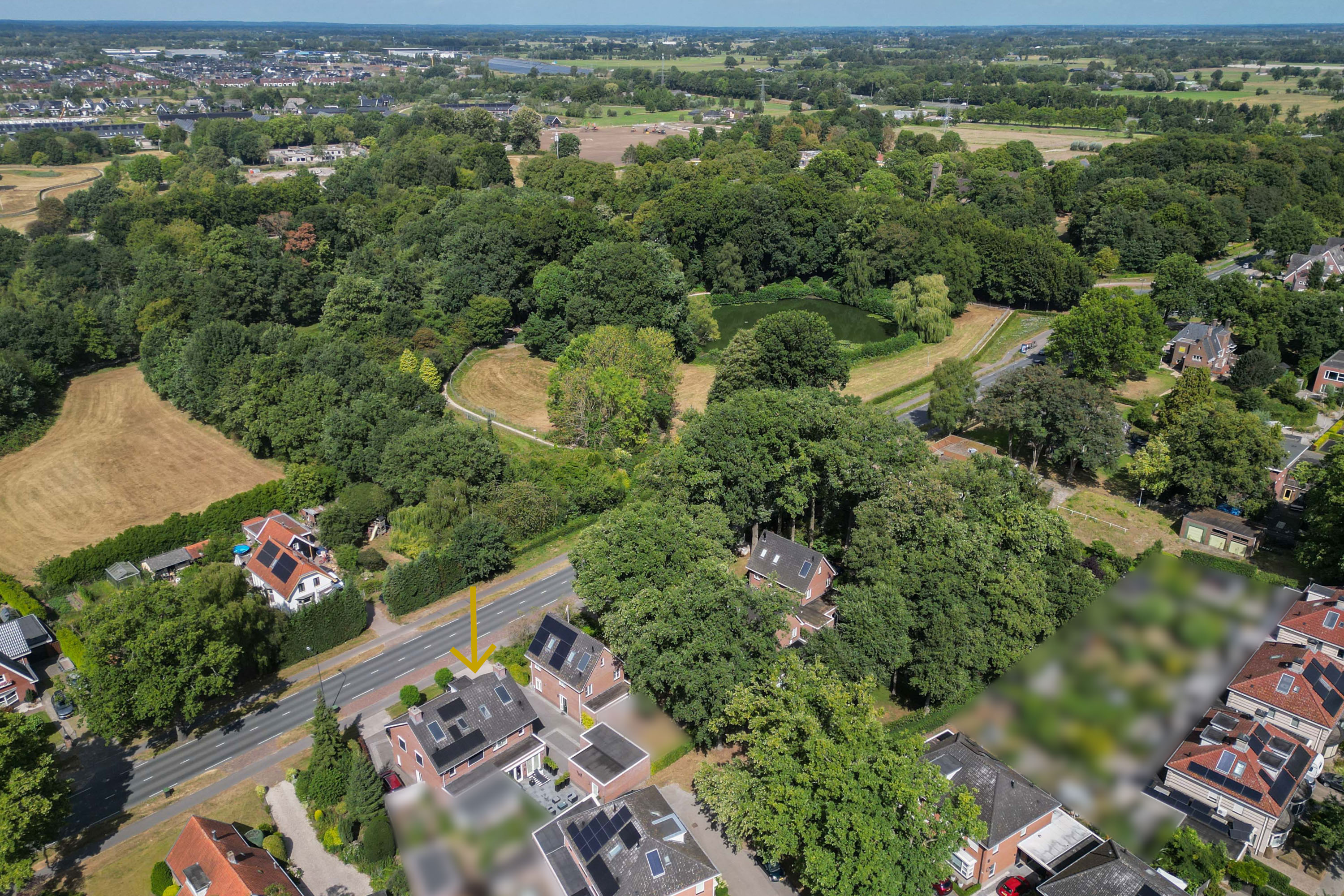 Via de lange oprit bereikt u de entree van de woning. In de hal bevinden zich de meterkast, de trapopgang en een modern toilet met fonteintje. De sfeervolle woonkamer aan de voorzijde is een lichte en uitnodigende ruimte, mede dankzij de karakteristieke erker en de sfeervolle gashaard die veel warmte en gezelligheid toevoegt. De hardstenen vloer met vloerverwarming loopt door over de gehele begane grond en zorgt voor een luxe uitstraling en aangenaam comfort.