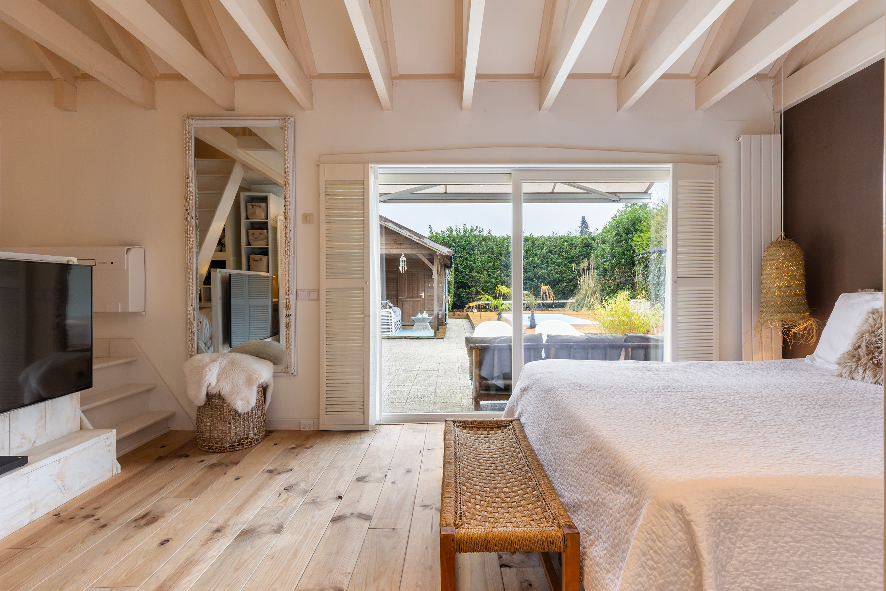 Daarachter bevindt zich een royale hoofdslaapkamer met een eigen luxe badkamer. De slaapkamer heeft een bijzonder karakter door de zichtbare balken en een vaste trap naar een ruime vide. Deze kan uitstekend dienen als werkplek, studeerruimte of extra bergruimte. Zowel boven als beneden zijn praktische inloopkasten aanwezig. Via een schuifpui vanuit de slaapkamer loopt u direct de tuin in.