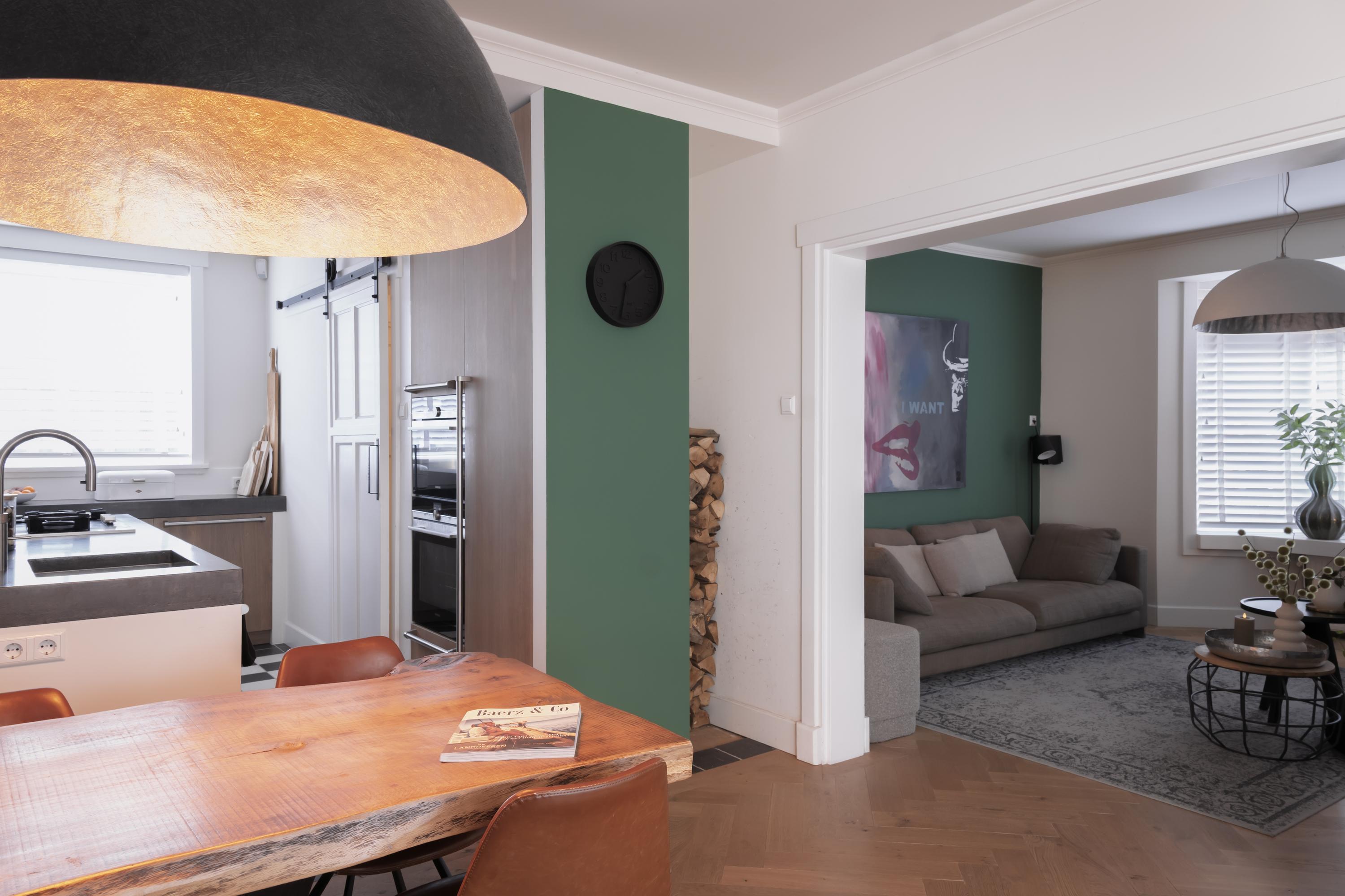 Entree met originele granitovloer, trapopgang, toilet en toegang tot de ruime kelder. De woonkamer met erker en houthaard biedt een fijne, royale leefruimte met volop mogelijkheden voor een comfortabele loungehoek. De luxe woonkeuken vormt het hart van de woning: ruim, licht en stijlvol afgewerkt, met kookeiland en hoogwaardige inbouwapparatuur. Vanuit de keuken is er een prettige verbinding met de entree en met de achtergelegen bijkeuken, inclusief een separate wasruimte.