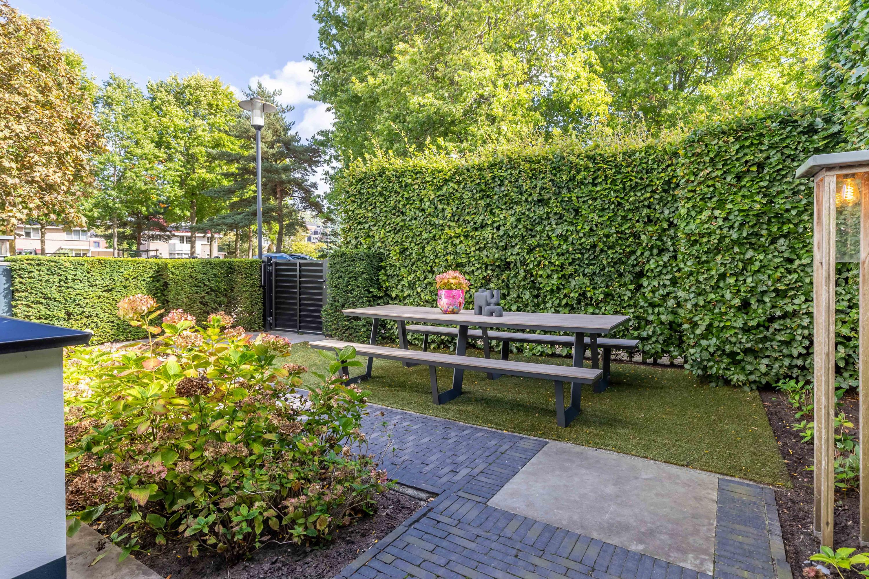 De in 2025 opnieuw aangelegde tuin is een oase van privacy en groen, gunstig gelegen op het zuidwesten. Meerdere terrassen bieden steeds een andere sfeerbeleving. De veranda is uitgevoerd met een riant hoog plafond waarin een grote lichtstraat is opgenomen. Het terras onder de veranda is daardoor aangenaam licht. Door de voorzieningen kunt u hier aangenaam in alle jaargetijden van de buitenruimte genieten met de sfeervolle open haard, een heater en windscreen. De twee balkons bieden besloten plekken om te ontspannen. De tuin beschikt over automatische beregening en is ideaal voor barbecues of lange zomeravonden.