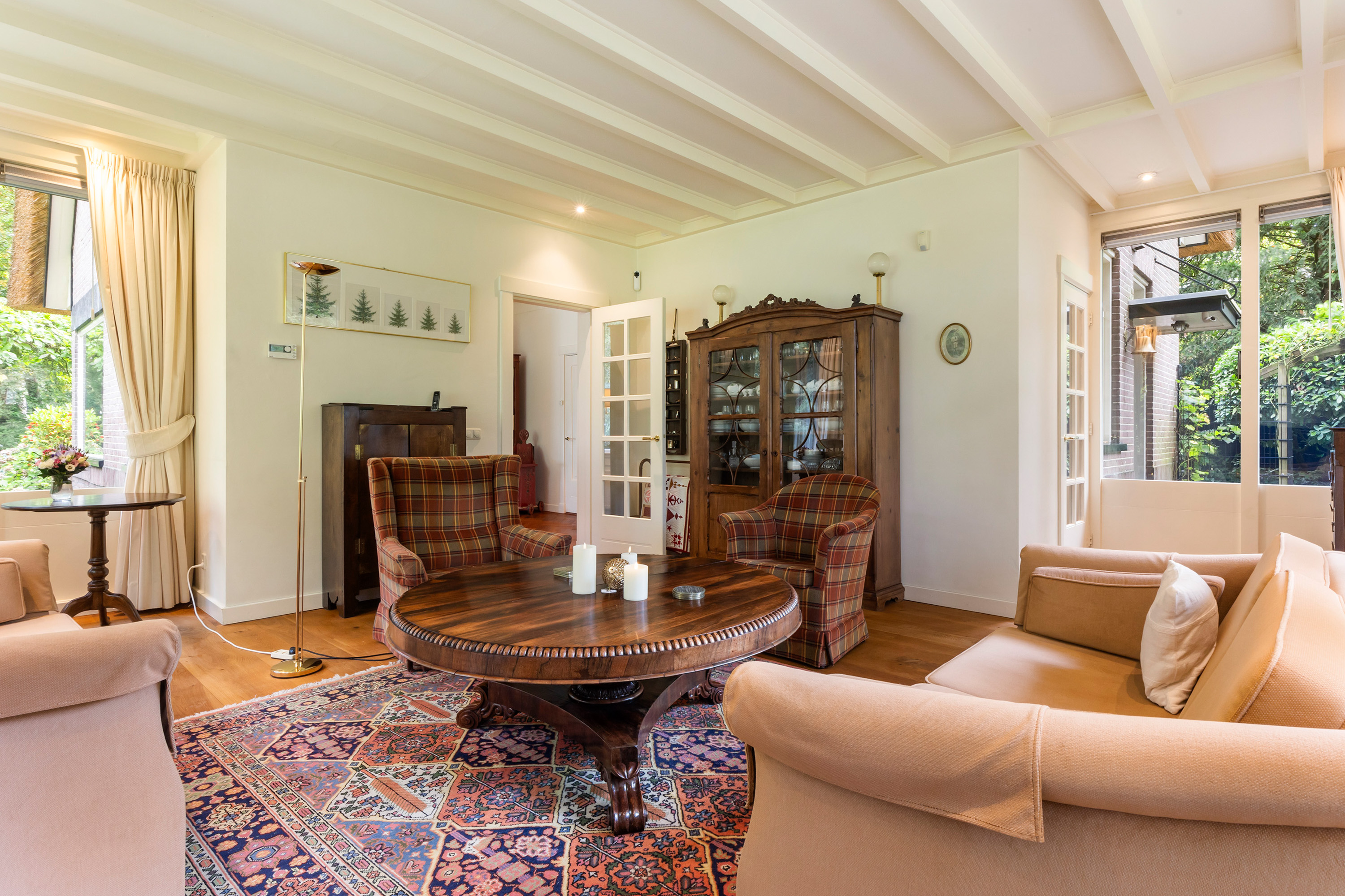 Via en-suite deuren is de eet/woonkamer bereikbaar. Net als de werkkamer heeft ook deze ruimte hoge plafonds met sierlijsten en randafwerking. De grote ramen zorgen voor veel lichtinval en een ruimtelijk gevoel.