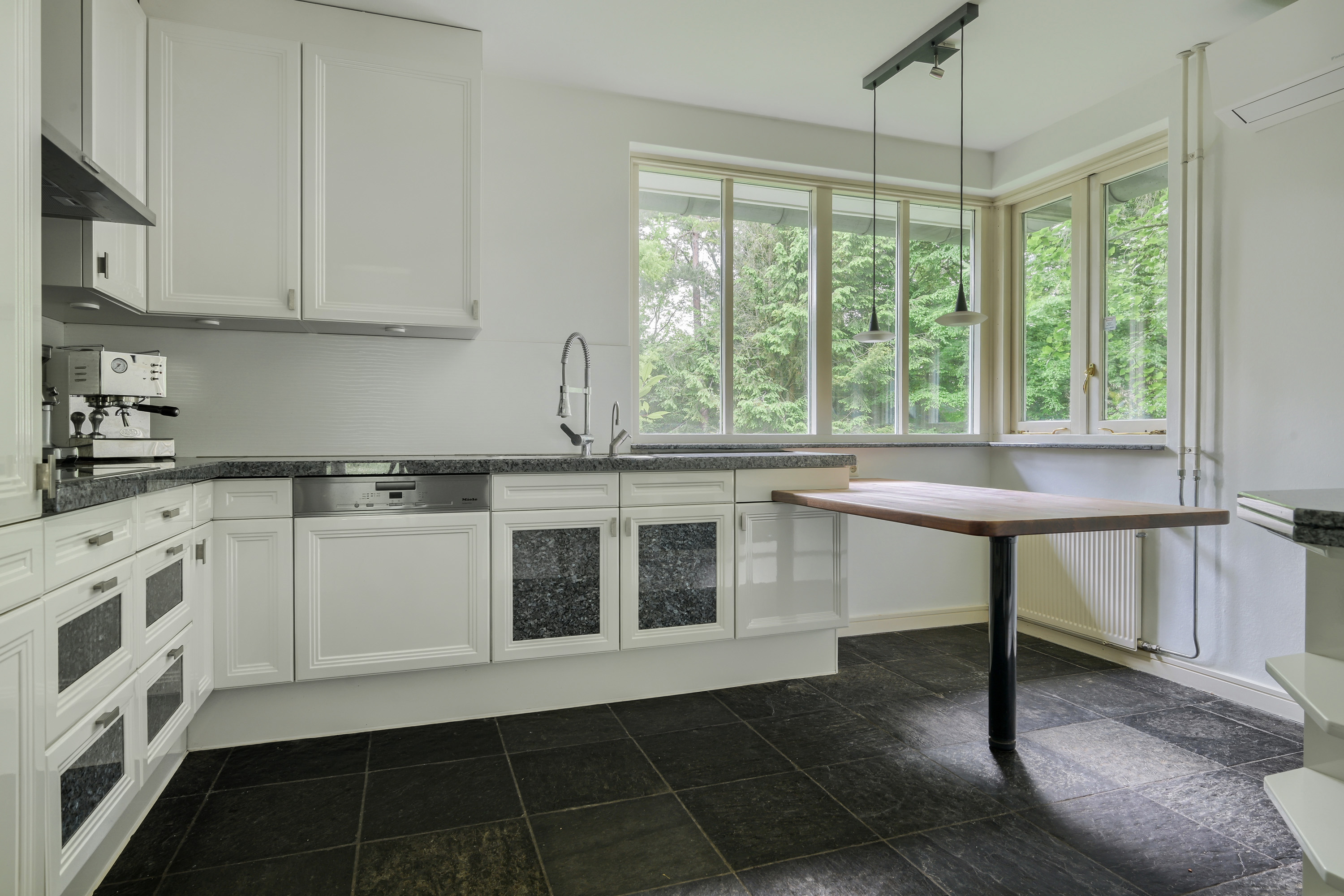 • De vloeren in de hal, toilet I, de werkkamer, de zitkamer, de eetkamer, slaapkamer I en de bijkeuken zijn afgewerkt met Noorse leisteen 'Pillarguri'.