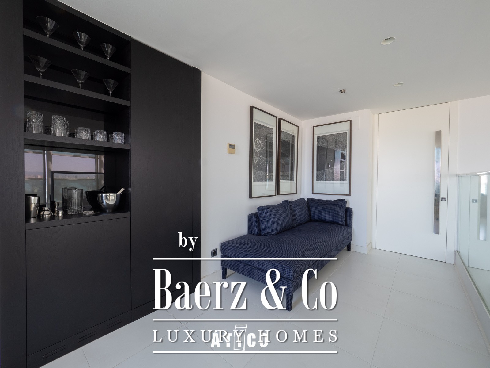 De woonkamer baadt in natuurlijk licht door grote ramen en loopt moeiteloos over in een terras dat de woning omringt. Hier nodigt een privézwembad uit tot ontspannen momenten boven de stad, terwijl het zachte geluid van watervallen en de uitzichten op Barcelona voor een kalme vitaliteit zorgen. De geïntegreerde keuken is uitgerust met roestvrij staal en kwarts en combineert eigentijds design met functionaliteit. Ideaal voor een ontspannen diner of sfeervolle ontvangst thuis.