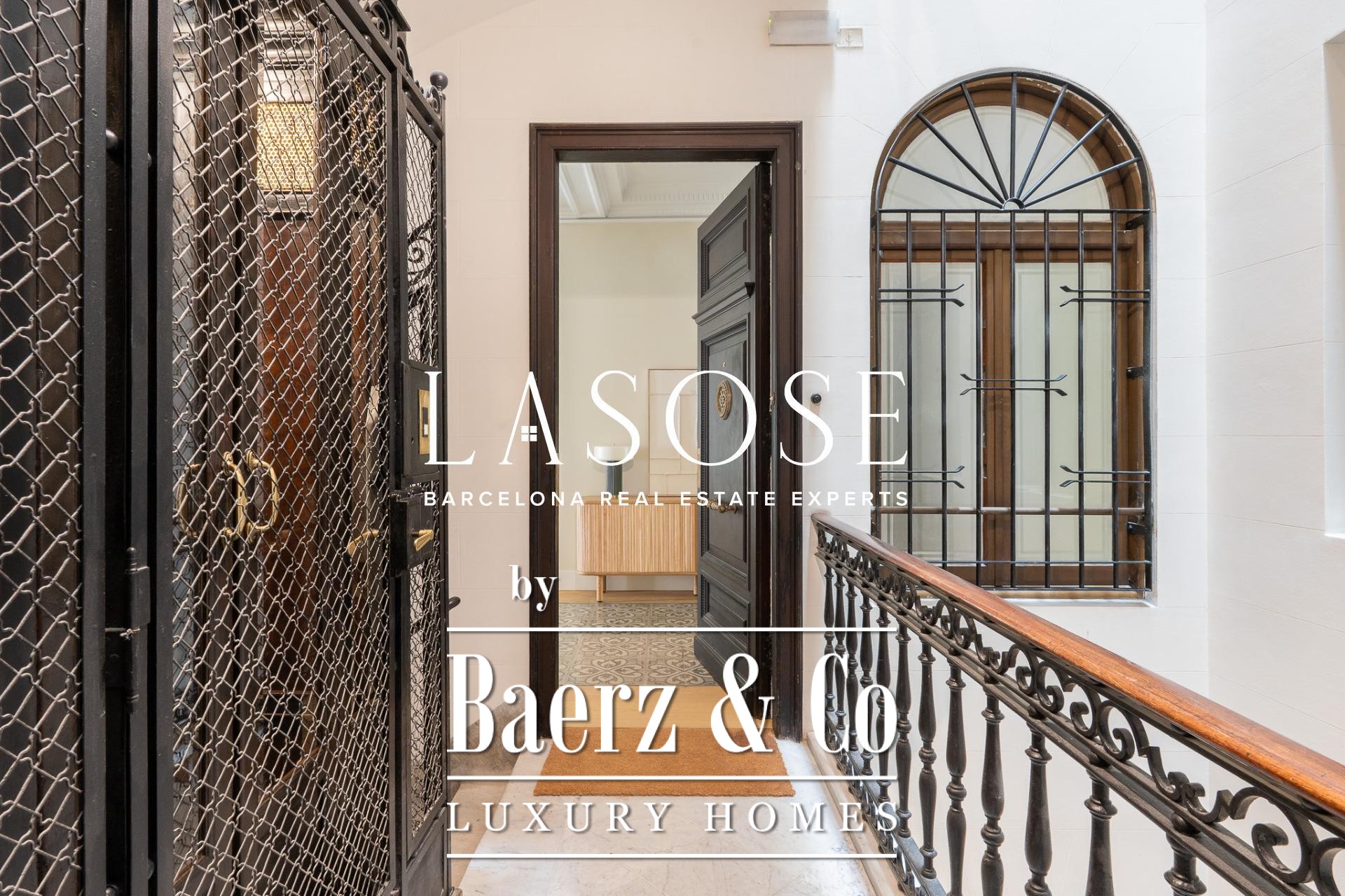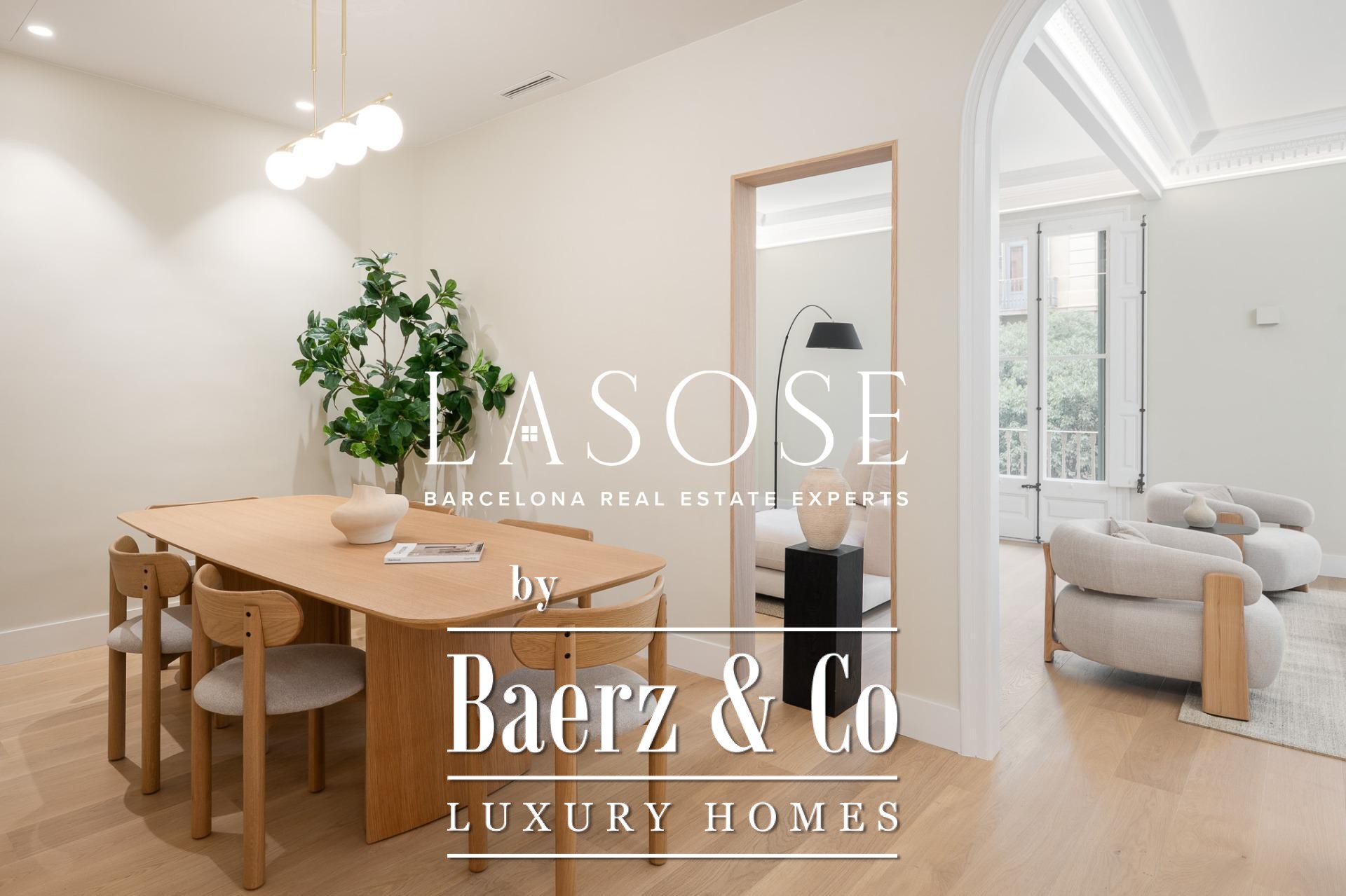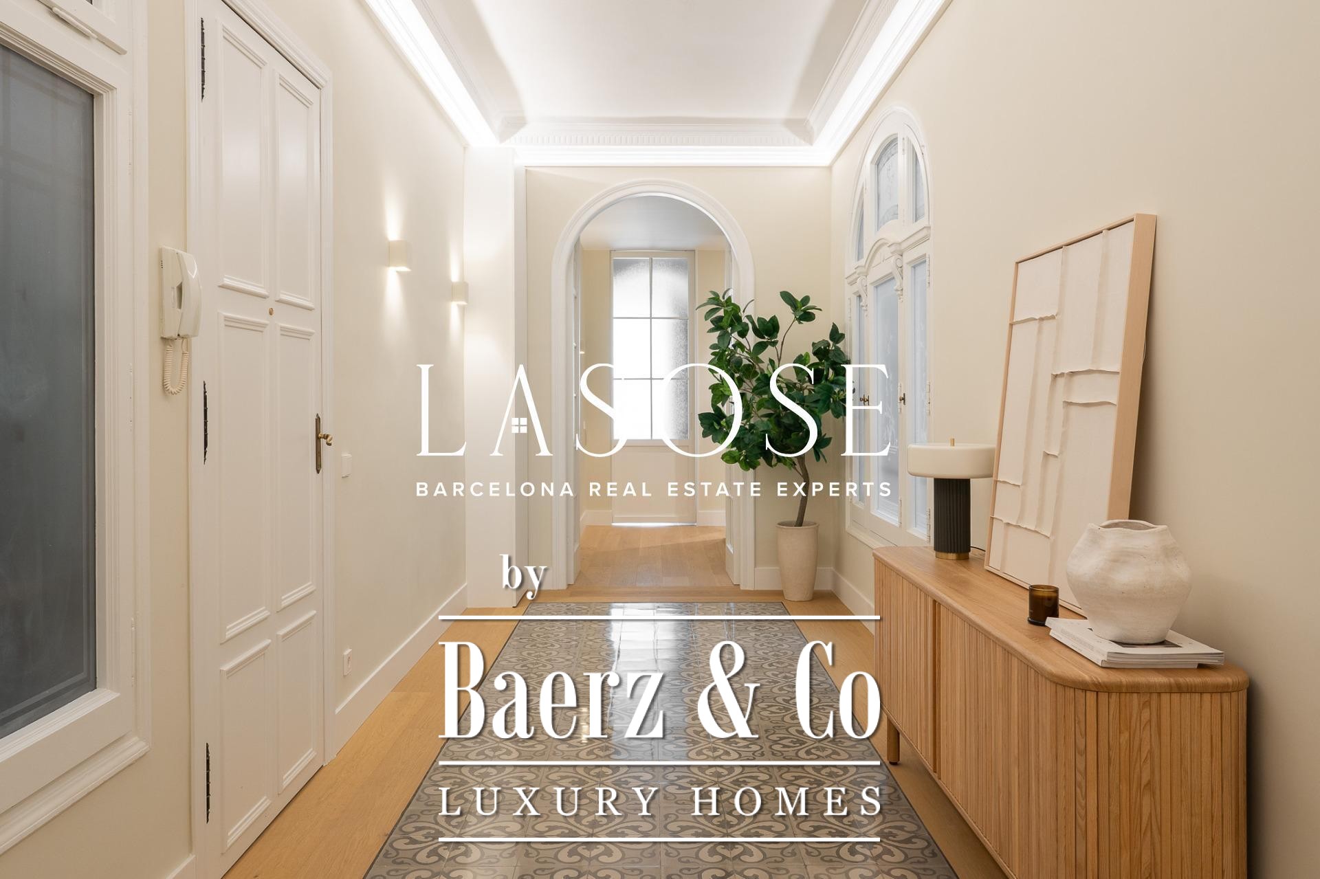LASOSE is privileged to present this magnificent high-end residence, located in the heart of Barcelona's coveted Eixample district.. . Located in an elegant listed royal estate dating from 1900, this property stands out for its stately architecture, its historical value and its unmistakable character. It is a unique apartment, where the charm of Barcelona's modernism merges with the most demanding comfort and contemporary design.. . Located on a bright 2nd floor with double orientation, the property enjoys abundant natural light throughout the day. Its careful distribution maximizes every corner, offering spacious, functional and stylish spaces.. . The property has three elegant double suites, all with full bathroom, and one of them equipped with an exclusive glazed gallery, perfect as a chill out corner or as a sophisticated workspace.. . The spacious living-dining room is harmoniously integrated with a designer kitchen with central island, equipped with top-of-the-line materials and appliances: polished marble countertop by Levantina, porcelain flooring, and high-end appliances by De Dietrich, Bora and Liebherr (including refrigerator, dishwasher and wine cooler).. . In addition, the dining room - bathed in natural light - can easily be transformed into a fourth bedroom according to the buyer's needs.. . This exclusive home offers luxury finishes such as natural wood floors, original hydraulic tiles and high ceilings decorated with moldings and rosettes, which