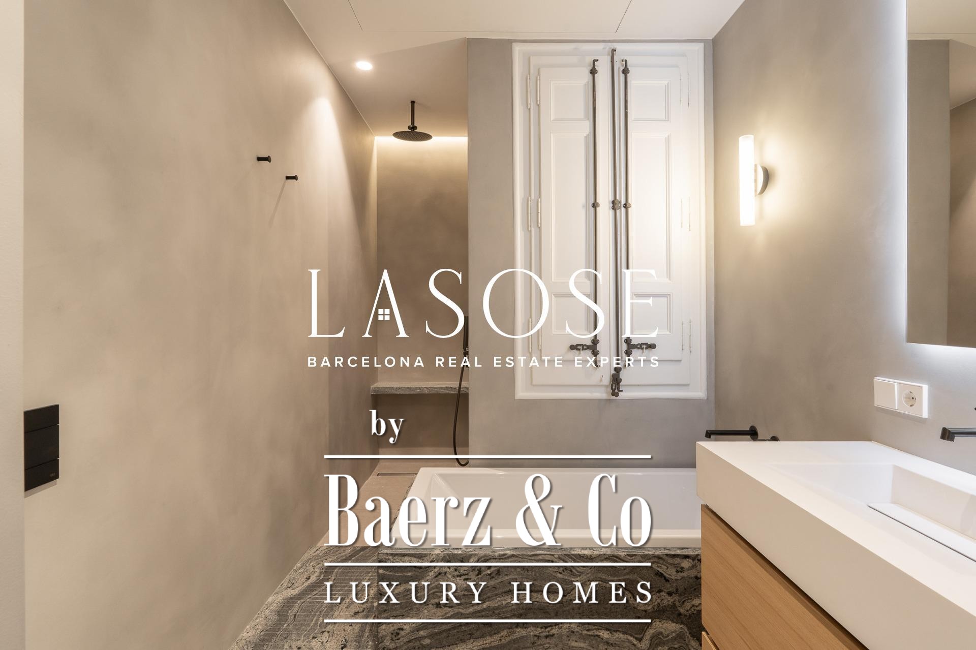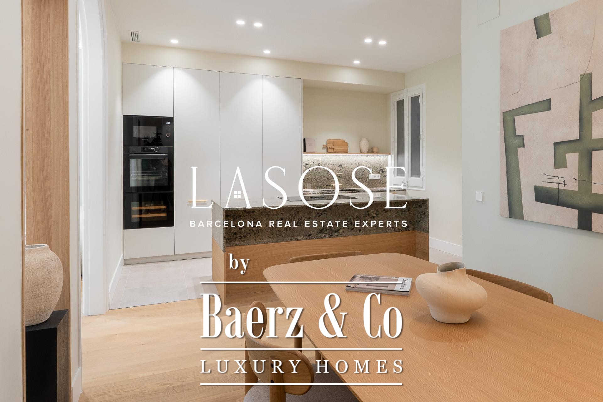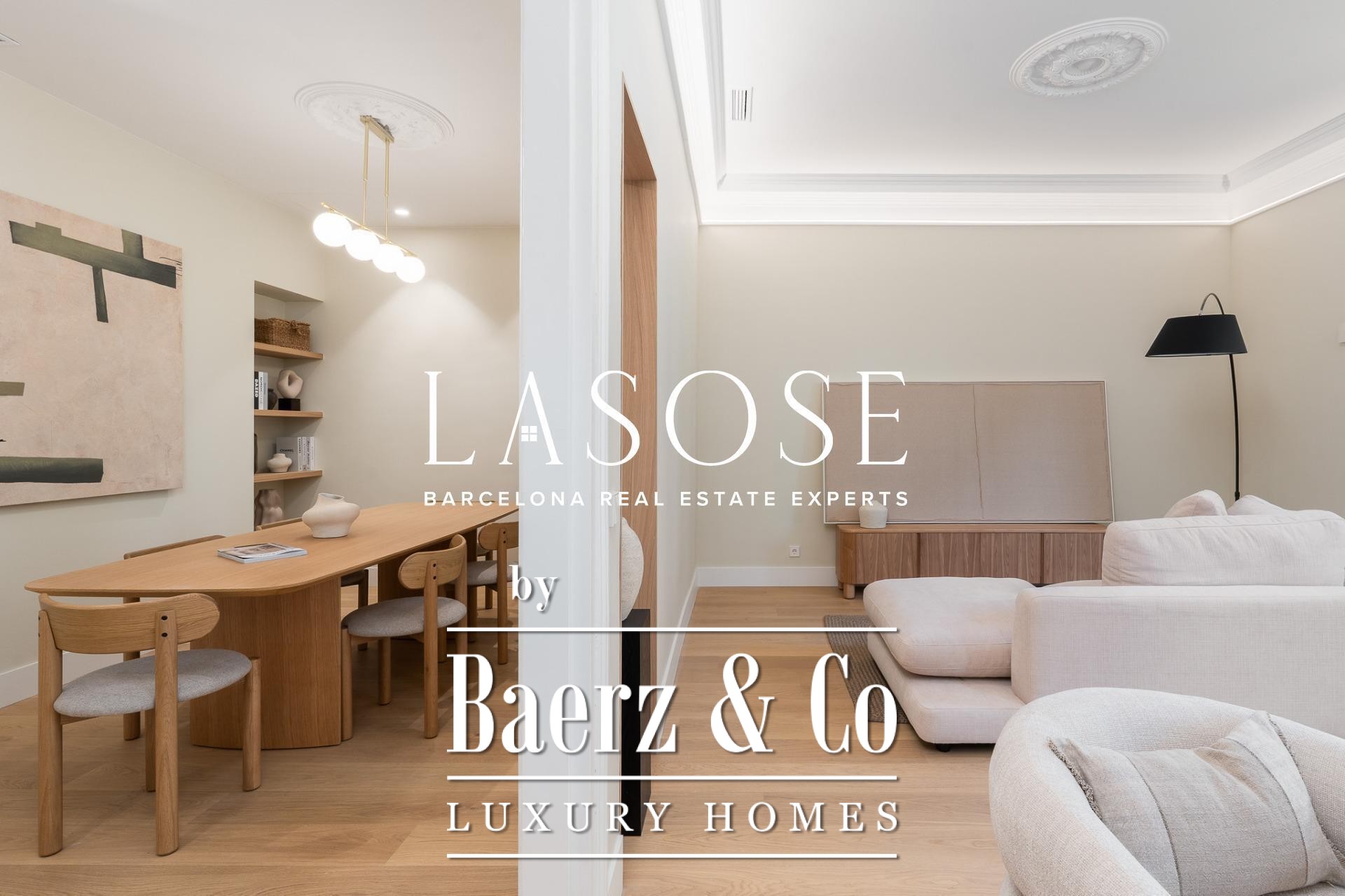 LASOSE is privileged to present this magnificent high-end residence, located in the heart of Barcelona's coveted Eixample district.. . Located in an elegant listed royal estate dating from 1900, this property stands out for its stately architecture, its historical value and its unmistakable character. It is a unique apartment, where the charm of Barcelona's modernism merges with the most demanding comfort and contemporary design.. . Located on a bright 2nd floor with double orientation, the property enjoys abundant natural light throughout the day. Its careful distribution maximizes every corner, offering spacious, functional and stylish spaces.. . The property has three elegant double suites, all with full bathroom, and one of them equipped with an exclusive glazed gallery, perfect as a chill out corner or as a sophisticated workspace.. . The spacious living-dining room is harmoniously integrated with a designer kitchen with central island, equipped with top-of-the-line materials and appliances: polished marble countertop by Levantina, porcelain flooring, and high-end appliances by De Dietrich, Bora and Liebherr (including refrigerator, dishwasher and wine cooler).. . In addition, the dining room - bathed in natural light - can easily be transformed into a fourth bedroom according to the buyer's needs.. . This exclusive home offers luxury finishes such as natural wood floors, original hydraulic tiles and high ceilings decorated with moldings and rosettes, which