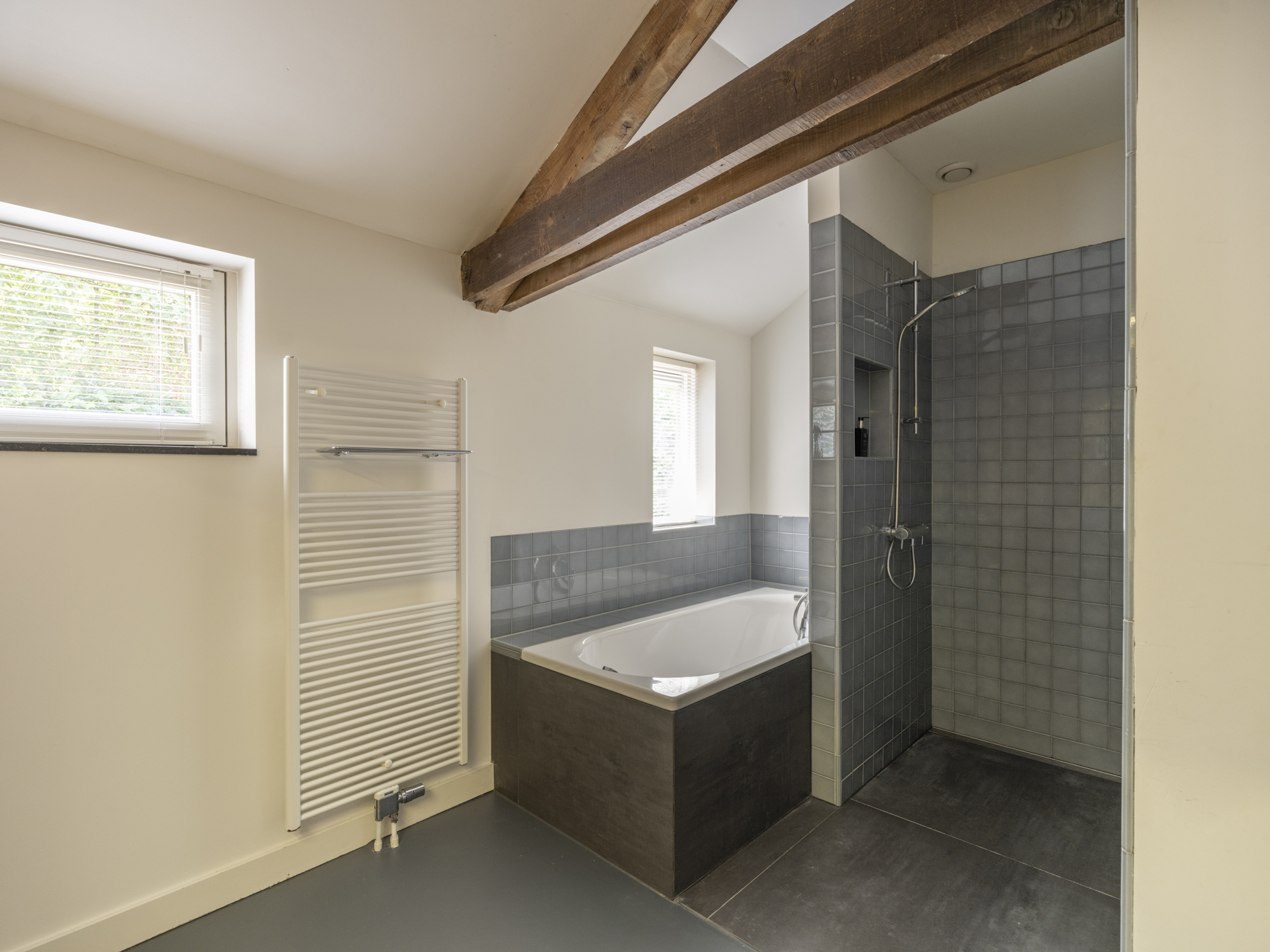 Ruime badkamer met ligbad, inloopdouche, thermostaatkraan, op maat gemaakte wandkast en dubbele wastafel. Dimbare spots verwerkt in de oude balken zorgen voor extra sfeer.